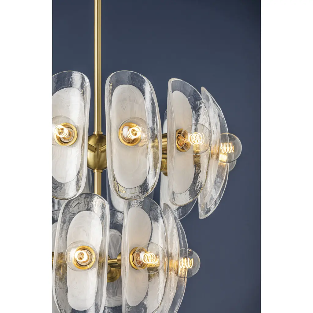 Smooth, organically shaped shades of thick piastre glass with a soft, opaque shape at the center give this design a soothing, natural aesthetic. Whether as a flush mount set closer to the ceiling or as a waterfall-like chandelier cascading down, this fixture blends nicely with a wide variety of interiors.