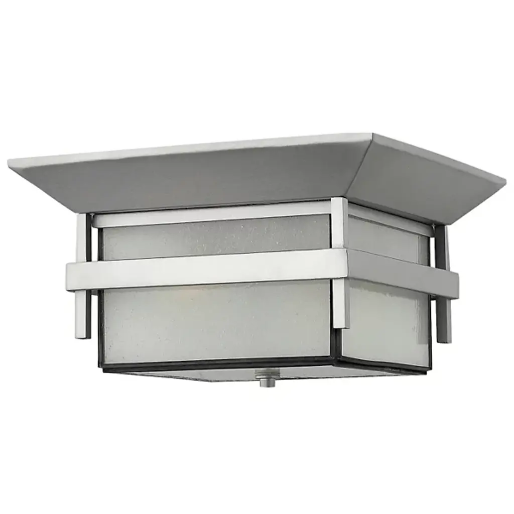 The sleek, rectangular drum-shaped silhouette makes a bold statement. Its satin black finish over its aluminum frame and etched seedy glass shade offer a modern touch. This modern farmhouse flushmount from the Harbor collection by Hinkley is damp-rated for outdoor use, bringing stylish illumination to any porch or patio.