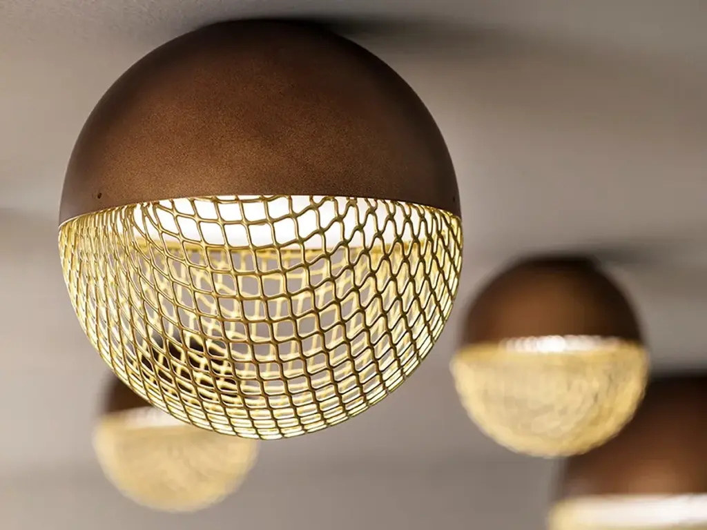 Iglù PL13 is a ceiling lamp with structure in painted metal with brushed patina. Led illumination.Light source:LEDx5,4W CRI>90 3000K 688LMLEDx5,4W CRI>90 2700K 653LMDIMMABLE: NOIglù is an intuition born from observing the perfection of the sphere, transformed into a perfect, and unique shape by mesh that, rather than obstruct the light, instead creates a pattern of light and shadow.