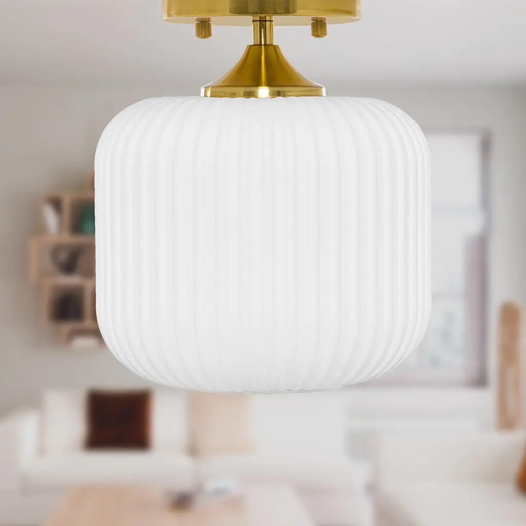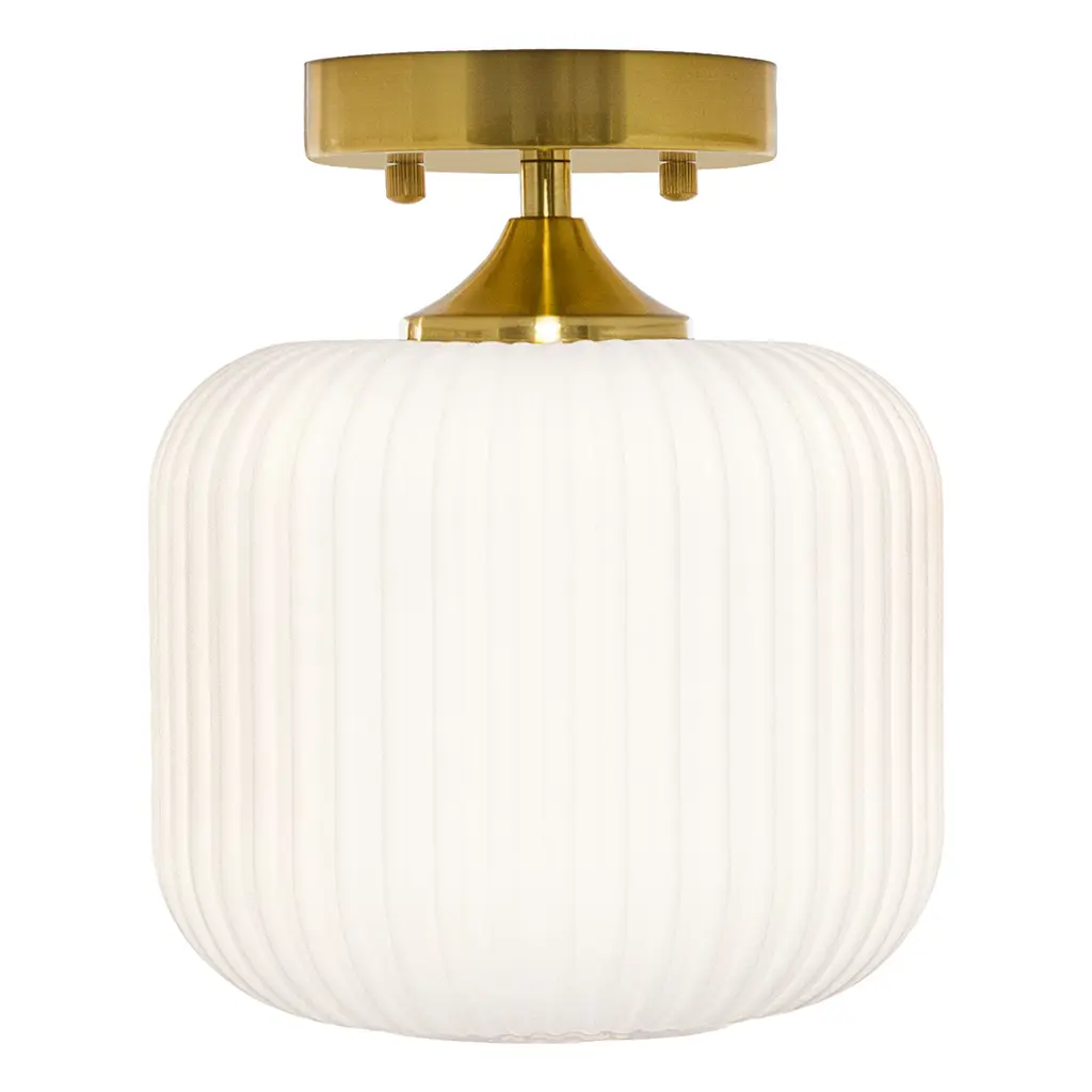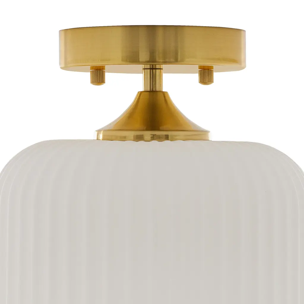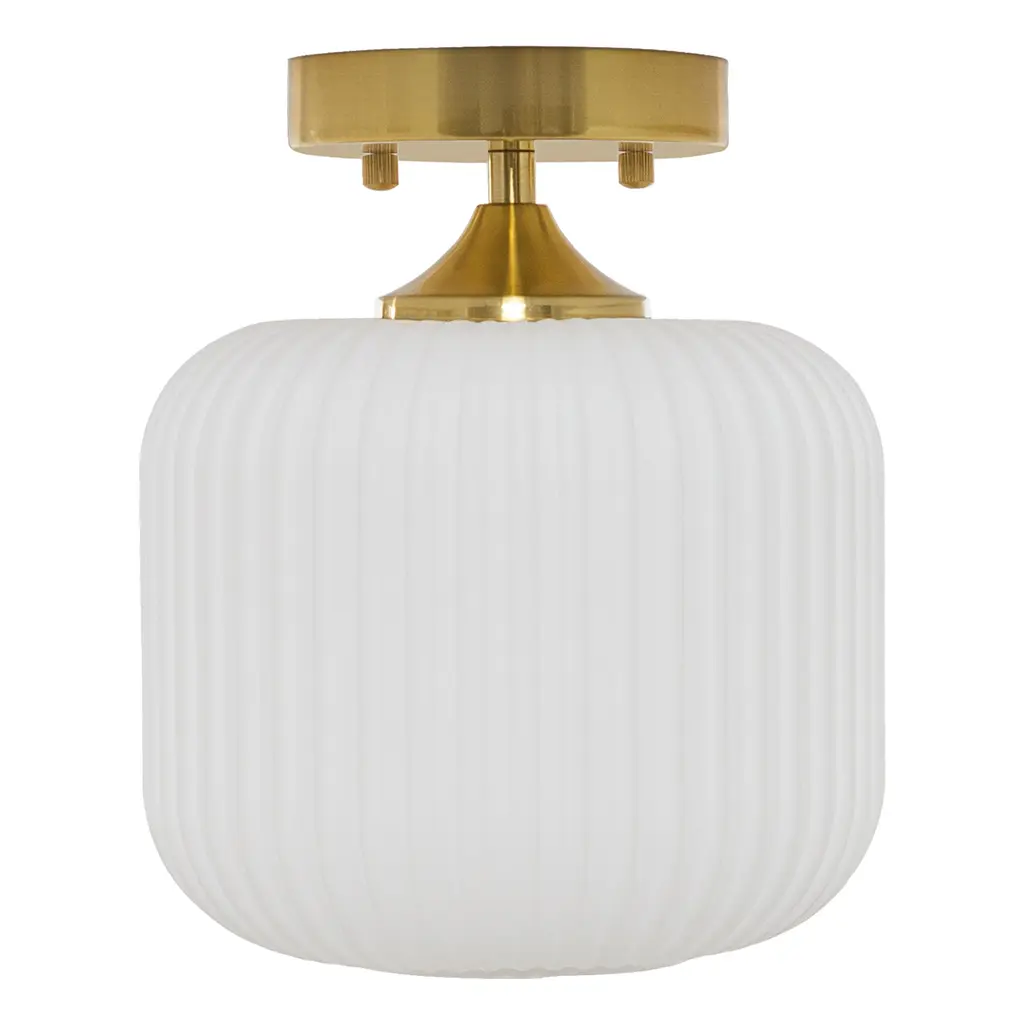 This retro gold and white ceiling light will bring plenty of shine and style to your home. It showcases a textured globe shade of white frosted glass that seems to float from its brushed gold metal base. It requires one 40-watt E26 bulb (not included), and it's also LED compatible. Easy to pair with a variety of retro or contemporary decor schemes, it's sure to cast a soft, warm glow in whatever room you install it in.Features:Dimensions: