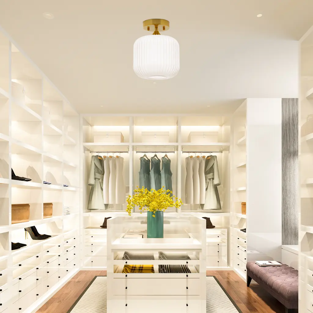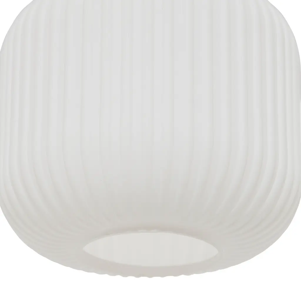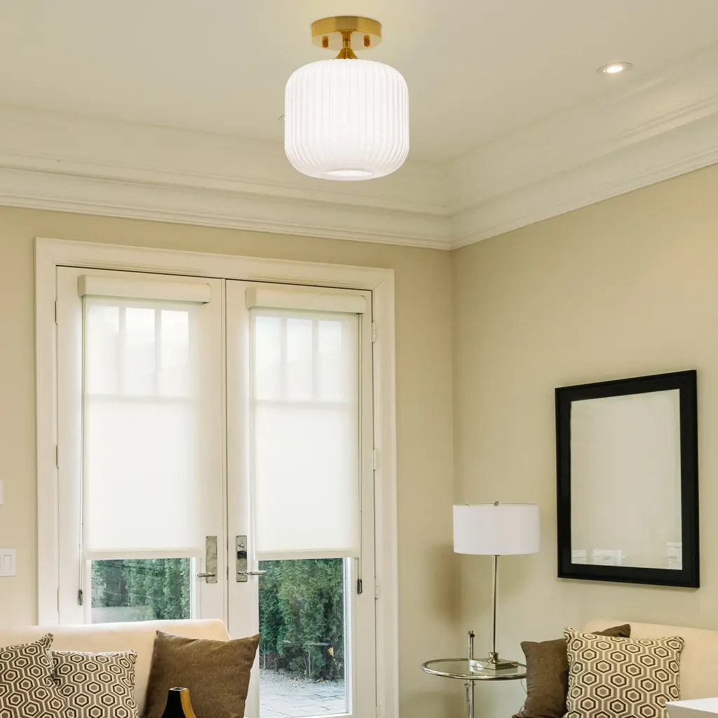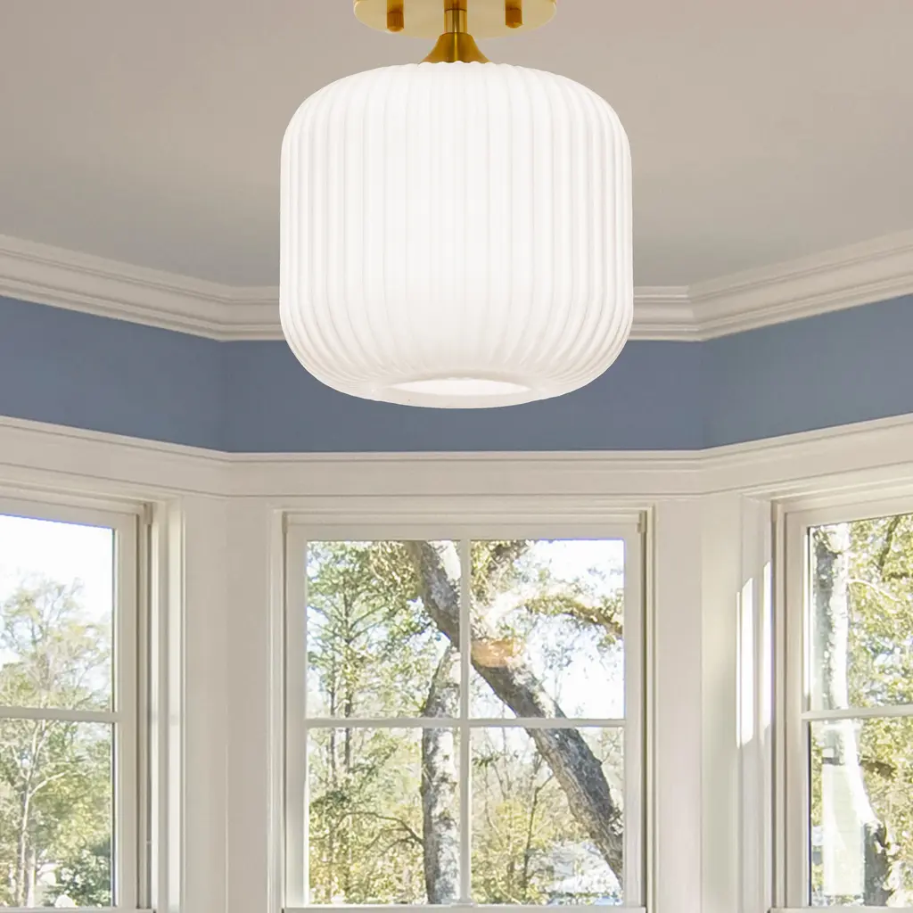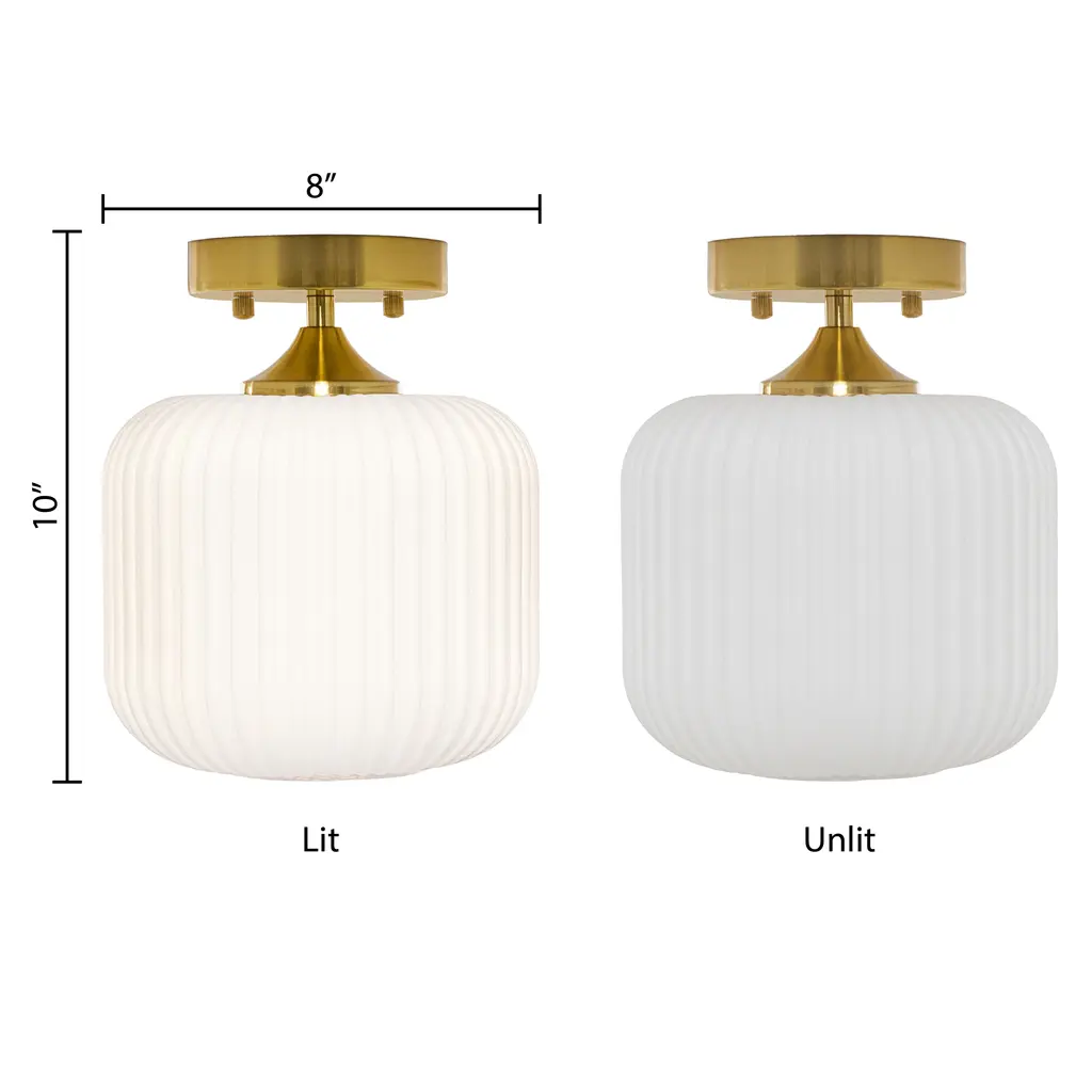 This retro gold and white ceiling light will bring plenty of shine and style to your home. It showcases a textured globe shade of white frosted glass that seems to float from its brushed gold metal base. It requires one 40-watt E26 bulb (not included), and it's also LED compatible. Easy to pair with a variety of retro or contemporary decor schemes, it's sure to cast a soft, warm glow in whatever room you install it in.Features:Dimensions: