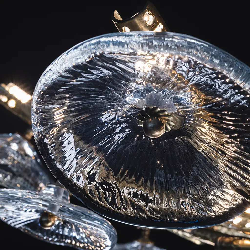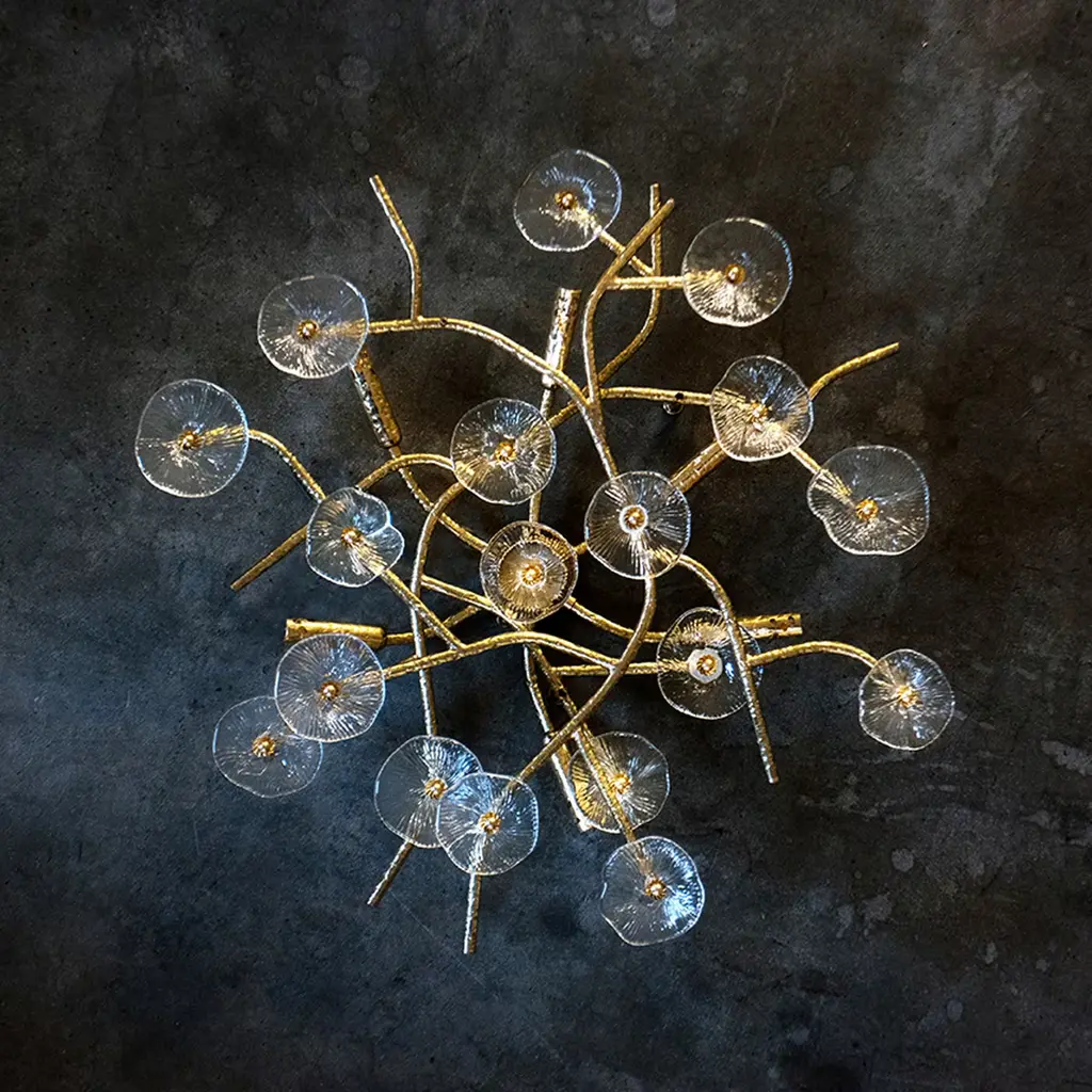 Glass shades in the shape of buds opening up under the caress of a warm sunray bestow this ceiling lamp its poetic flair. Fitted to a gleaming hammered brass structure consisting of sinuous twig-like arms, the shades are entirely unique due to painstaking mouth-blowing and manual finishing steps. A larger variant can be explored in the Artemest catalog.