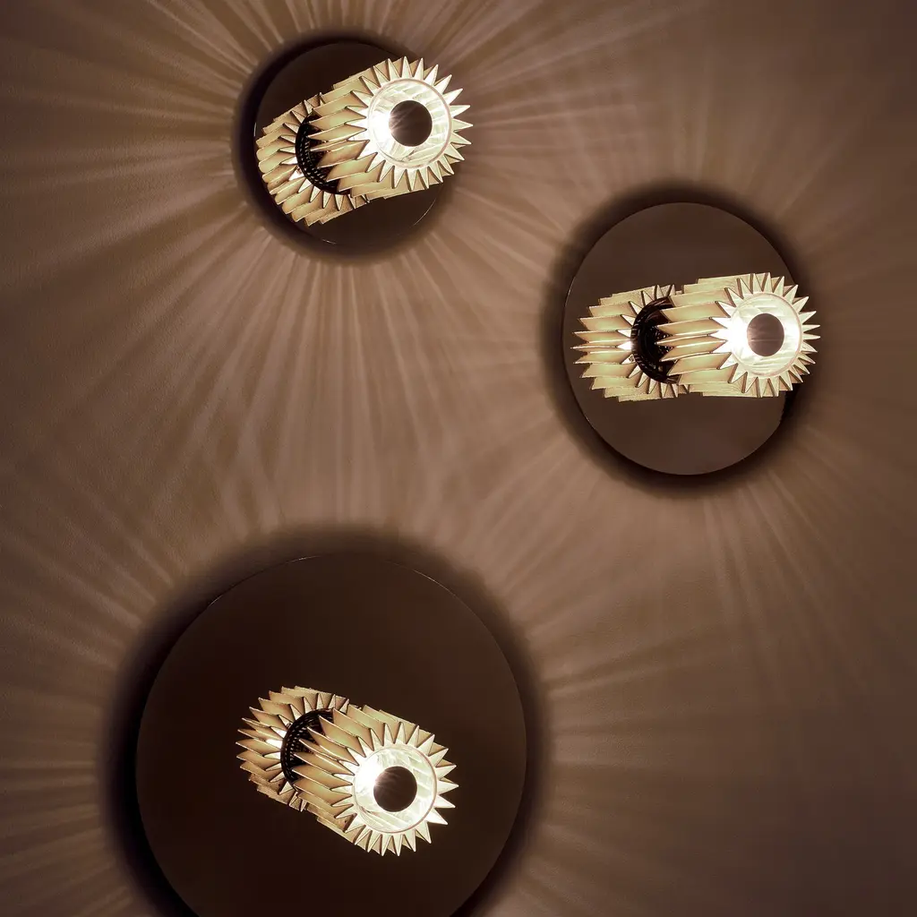 To mount on the wall or ceiling, In The Sun gleams with royal hues of silver and gold in an homage to France's Louis XIV, the 17th century Sun King. Architect-designers Dominique Perrault and Gaëlle Lauriot-Prévost configure a metal-disc backplate to reflect the warm glow from the starburst metal mesh diffuser for mood-setting atmosphere. With 3 available diameters, the light is striking on its own or perfect for displaying in assorted combinations of sizes and the varied metallic finishes.