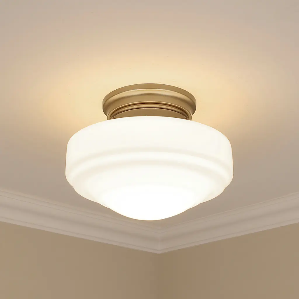 Bring traditional elegance into your home with the Golden Lighting Ingalls 1-light 12in Semi-Flush Mount. Featuring a glass shade and a modern brass frame, it creates a welcoming atmosphere. This vintage milk glass shade brings a touch of nostalgic charm and timeless style, providing a soft, glare-free glow that enhances your space. The modern brass finish, characterized by its satin luster and warm patina, adds understated elegance to any decor. Perfectly suited for entryways, bedrooms, kitchens, and living areas with mid-height ceilings, it is damp location rated, making it suitable for covered spaces. Installation is hassle-free, and it requires 1 E26 Medium base bulb (not included) with a maximum wattage of 100. Overall dimensions are 12"W x 8.63"H x 12"D, delivering a stylish focal point for your home. Elevate your living spaces with superior craftsmanship and design.