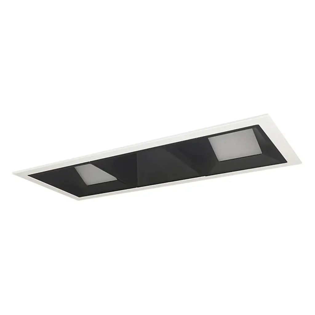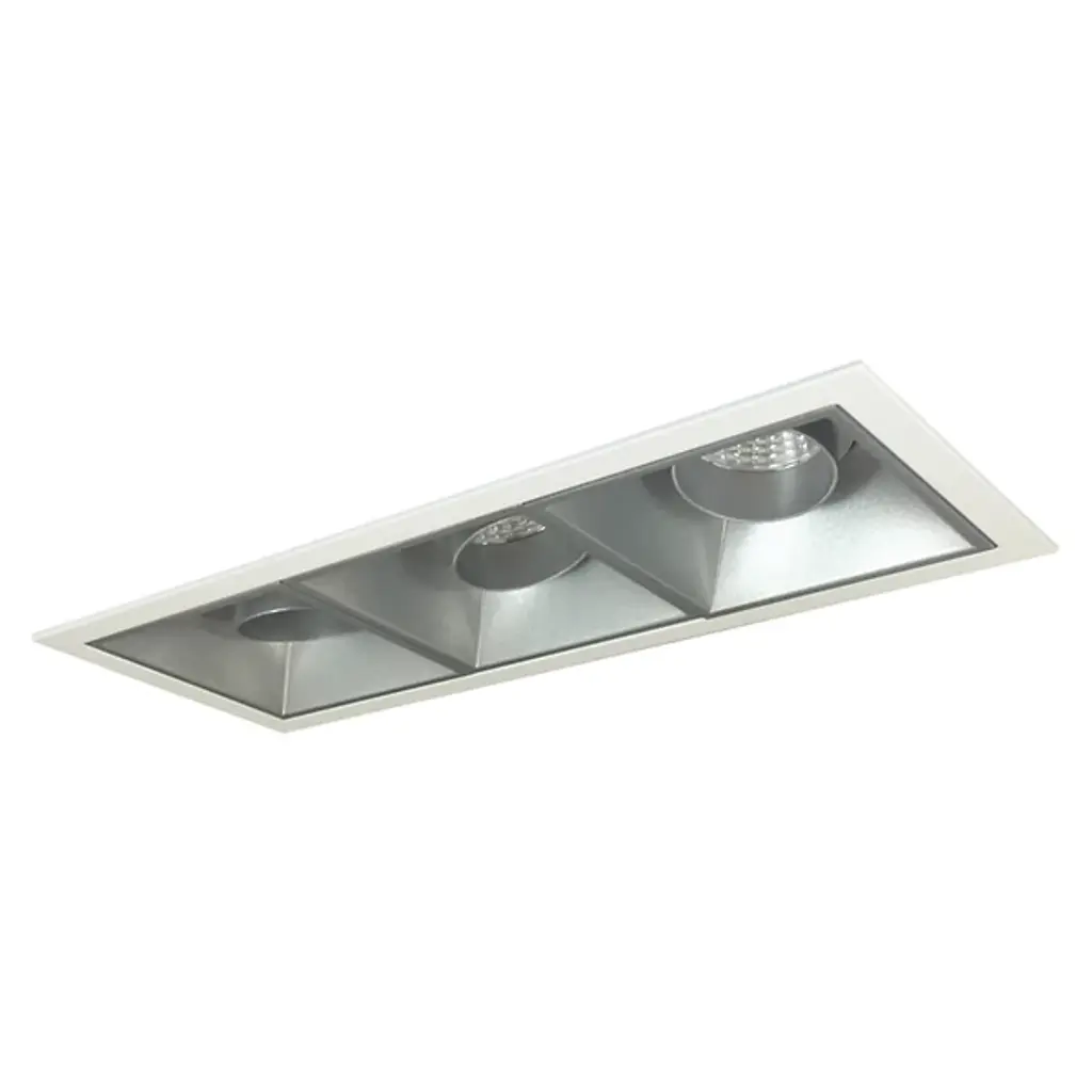 Unleash a plethora of lighting options in a single fixture with the Iolite MLS LED Adjustable Snoot/Fixed Downlight and Wall Wash Three Head Trim Set from Nora Lighting. A rectangular aluminum trim sits nearly flush with the ceiling, encompassing three separate LED lamps, each tucked up into different light bays. Each integrated LED is damp-rated, though all are different in function. A wall wash trim splashes glare-free light to the side, while an adjustable lamp can illuminate a wider field as desired, and a fixed downlight casts a bright pool below.