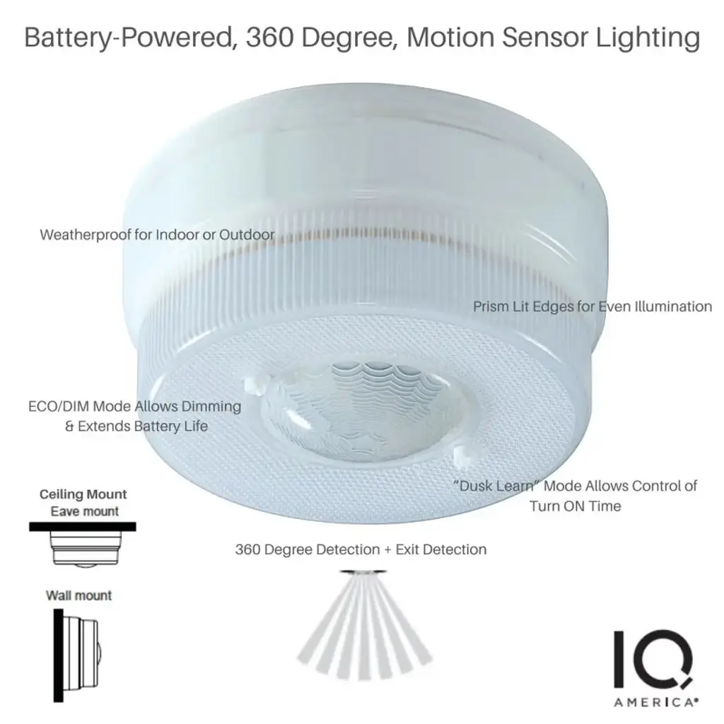 IQ America Motion Sensor Security Lighting products increase security to your property, save energy and money, help to welcome your visitors, and light your everyday paths. Our products encompass a variety of solutions for your home and business. IQ America products are synonymous with innovation and quality. Adding security to your property while enjoying the benefits of saving energy, IQ America outdoor lighting products deliver. We utilize the newest LED technology and industry-leading quality. Our products are safe, easy to use, and reliable. Your home is a place of refuge so you can make it safe and secure. Proper lighting is a first good deterrent against any intruders. The Dual Mounting allows mounting the weatherproof fixture as a wall mount OR surface eave mount. The easy-install mounting plate kit and battery-operated features mean you'll be up and running in 5 minutes. It's safe and simple. You're in control with the “dusk-learn’ and “eco-dimming” sensitivity adjustments based on your needs to save energy and have the light learn when it needs to be on. The exit-sensor detects your exit from a door to immediately light your path. Perfect for any residential or commercial lighting sites, work sites, job sites, homes, sheds, barns, workshops, she-sheds, tiny homes, storage, patio, tents, closets, attics, and more!
