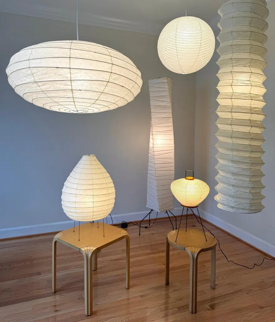 Akari Light Sculptures by Isamu Noguchi are considered icons of 1950s modern design. Designed by Noguchi beginning in 1951 and handmade for a half century by the original manufacturer in Gifu, Japan, the paper lanterns are a harmonious blend of Japanese handcraft and modernist form.The lamps are created from handmade washi paper and bamboo ribbing, supported by a metal frame.Noguchi adopted the term Akari, a Japanese word meaning ‘light,’ with associations to both illumination and weightlessness.As part of the marketing for Akari, Noguchi came up with a logo that combined a stylized sun and crescent moon like the Japanese ideograph it is based on (明). The ideograph became synonymous with Akari, featured on the early envelopes and packaging and in the form of a red stamp at the base of each lantern.Hand-made form by Ozeki & Co. Ltd., Gifu, Japan.Pristine condition. No rips or holes. Hardwire cord included. Bulb is not included.