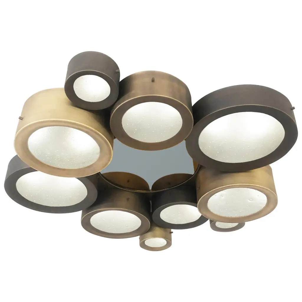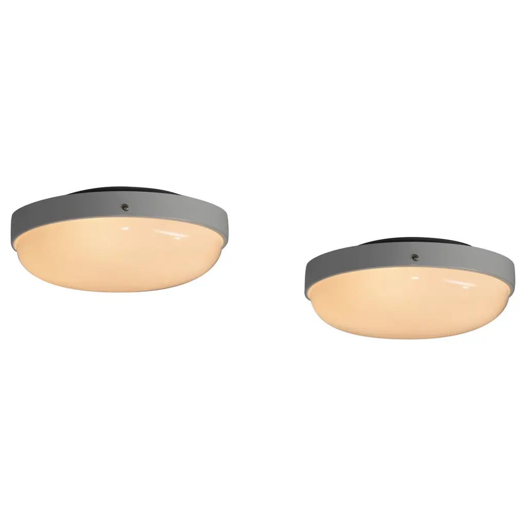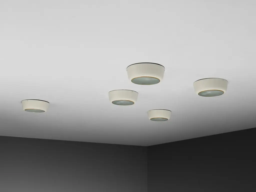 Greco Illuminazione, plafonnières, coated aluminum, satin glass, brass, Italy, 1970sThis plafonnière by Greco Illuminazione reveals a form that is both restrained and deliberate. Its overall geometry is a shallow, inverted cylinder, and the outer shell in off-white aluminum flares gently outward. At the underside, a circular disc of satin glass rests within a slim brass ring. The brass provides a sharp, warm accent. The diffuser’s satin finish breaks the intensity of the light. Kindly note that the price listed is per item.