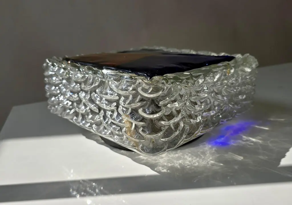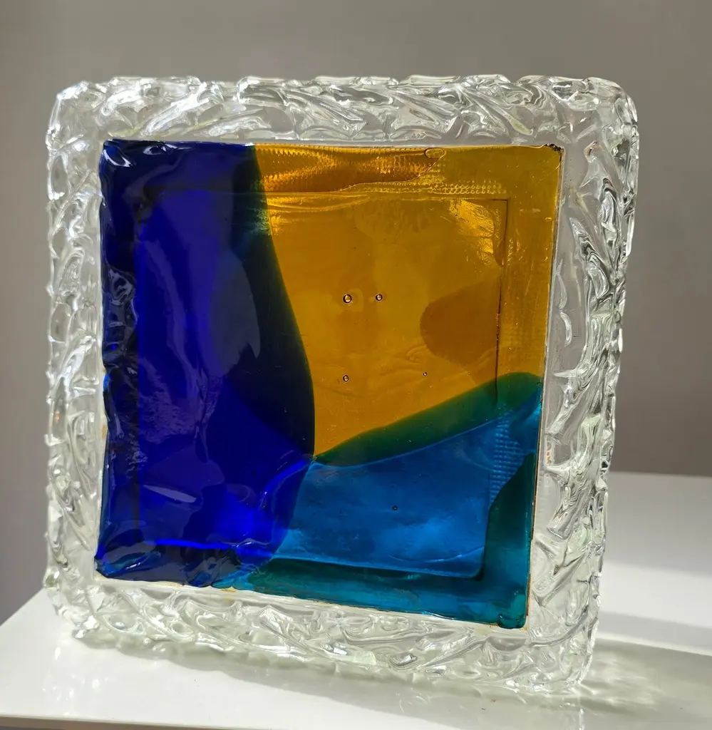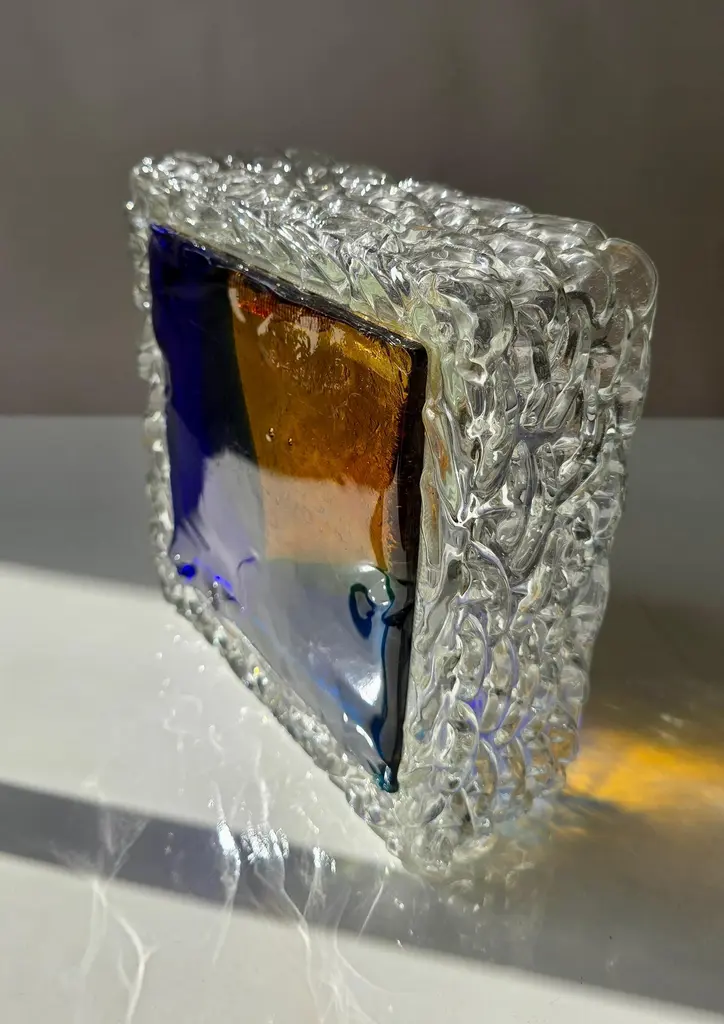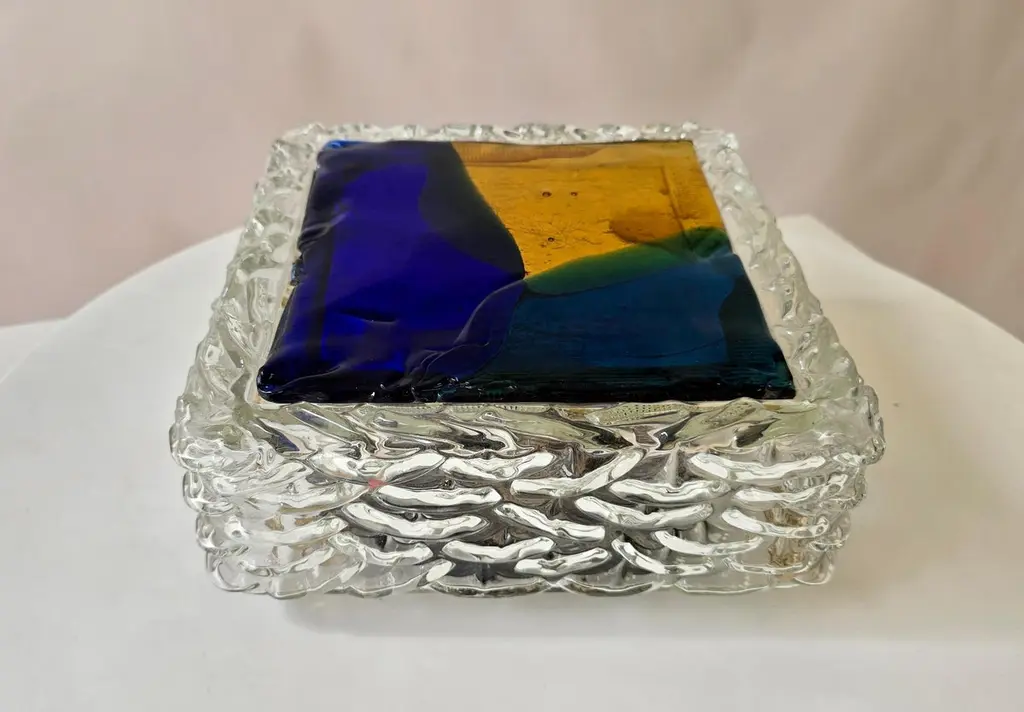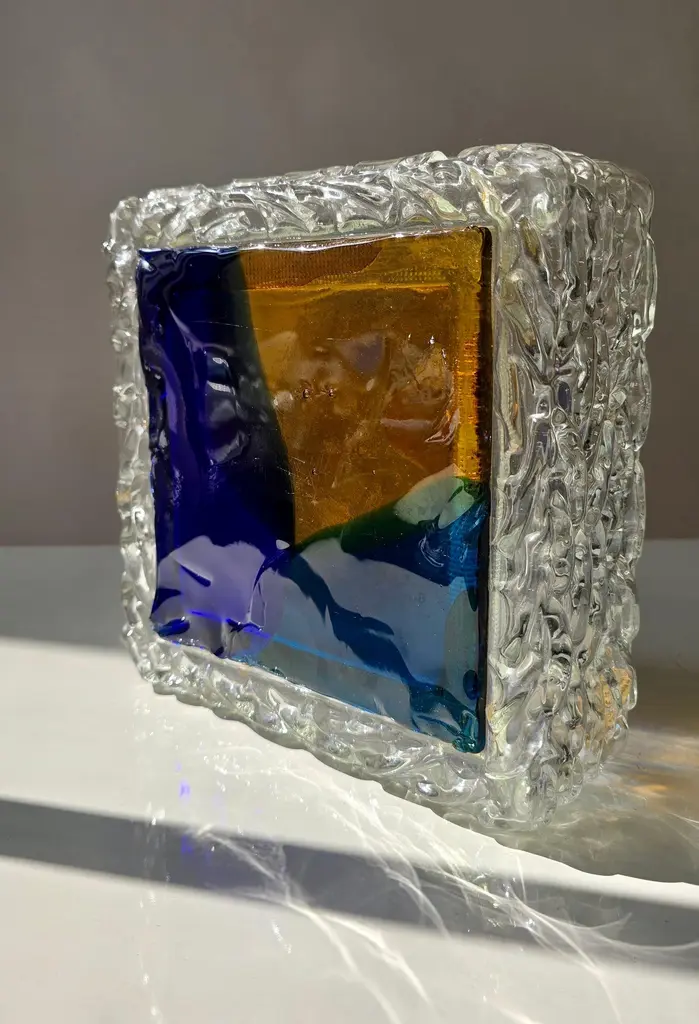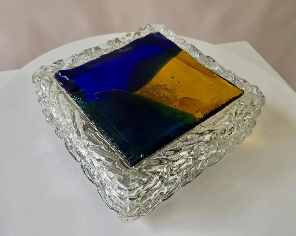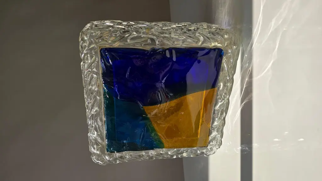 Italian Murano Glass Wall or Ceiling Light, Space Age Brutalist Style, 1970sStriking vintage Italian Murano glass wall or ceiling light from the 1970s, showcasing the bold and artistic spirit of space age and brutalist design. The lamp features a thick, clear glass body with an ice-like textured surface, surrounding a vibrant glass front in a geometric composition of deep cobalt blue, amber yellow, and emerald green.This sculptural piece exemplifies the craftsmanship of Murano glassmakers, where art and functionality merge. When illuminated, the richly colored glass radiates a warm and atmospheric glow, making it a statement feature in any modern interior. Perfect for collectors of Italian mid-century lighting, as well as for interiors inspired by space age, brutalist, or art glass design.DimensionsHeight: 10 cm (3.9 in.)Width: 25 cm (9.8 in.)Depth: 25 cm (9.8 in.)ConditionGood vintage condition with light wear consistent with age. Some scratches are visible on the front surface (see photos).
