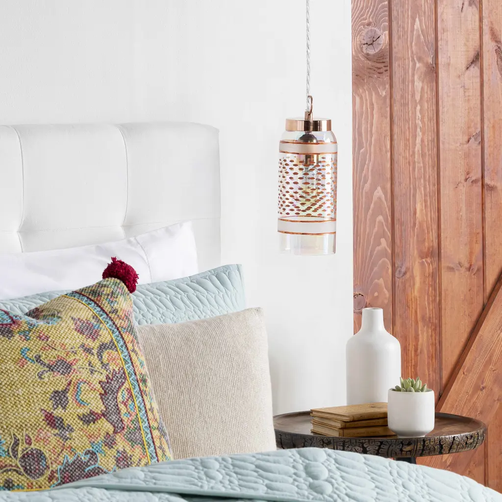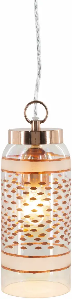 Collection: Jal Colors: Translucent, Orange Material: Fixture: Glass,Fixture: Iron Styles: Transitional,Bohemian Made In: India Lighting Type: Pendant Base Color: Metallic - Copper Hanging Method: Cord Cord Length: 8' Number of Bulbs: 1 Socket Type: E-26 Bulb Wattage: 40W
