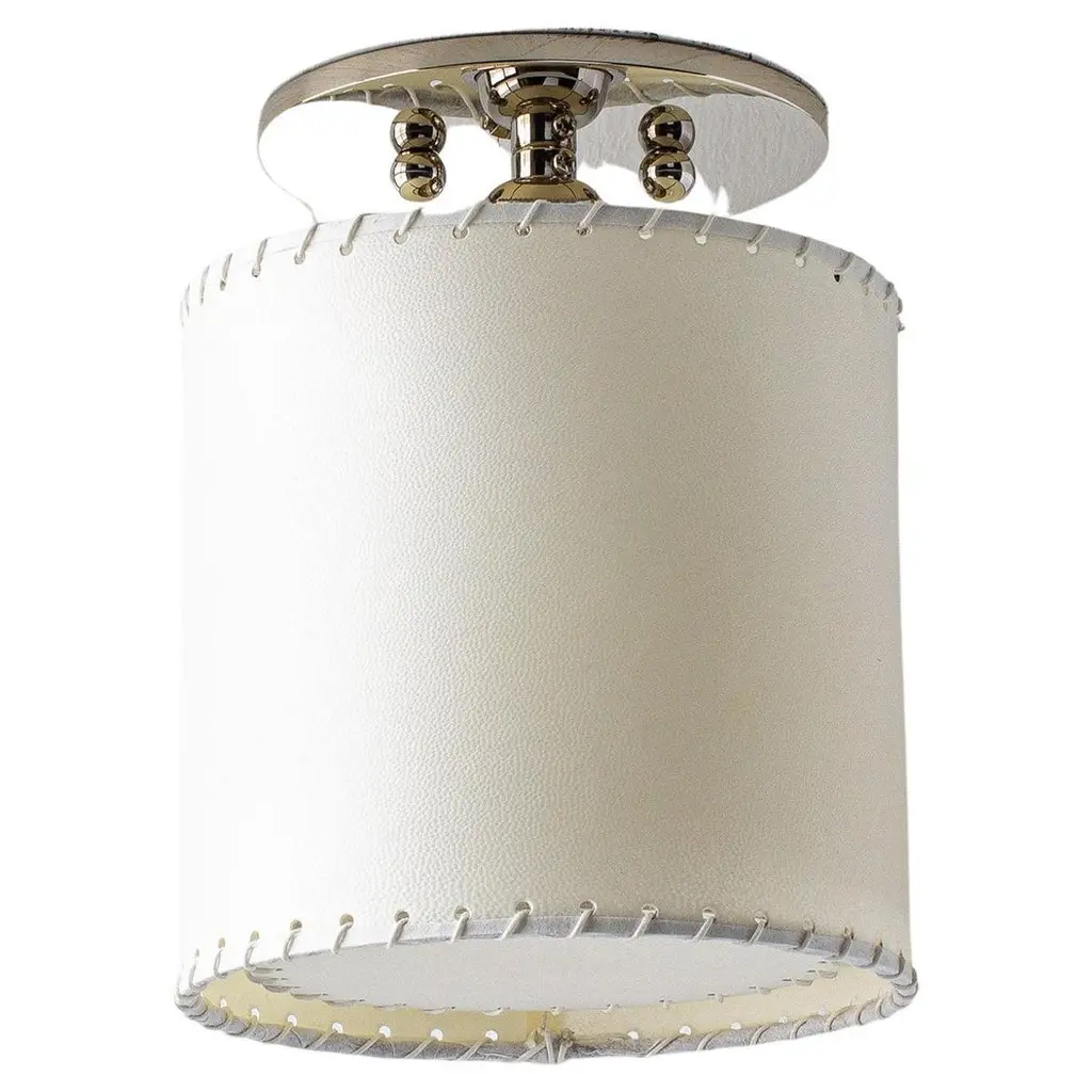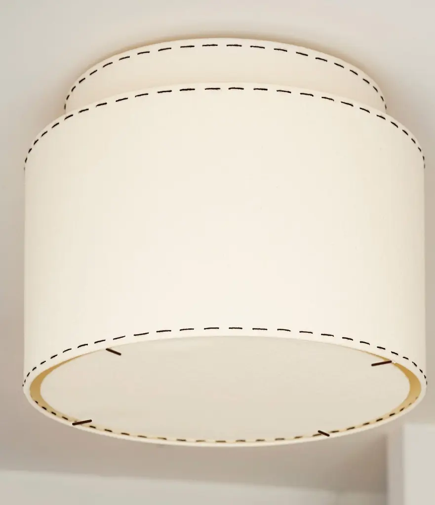 This classic, tailored, double ceiling lamp, is inspired by old Hollywood and menswear, reminiscent of the 1940s and the early simplicity of Art Deco and 20th Century Modern. Its clean shape is the perfect foil for our signature stitching to both tiers of upholstered shade edges, our signature bronzed armatures, and our removable linen diffuser, Our Classic 640 diameter x 470 deep proportion is shown in creamy white Italian linen with black stitching. The armature and solid brass ceiling canopy and inner structure are available in your choice of patina levels. This light works individually or in pairs in hallways, glamorous powder rooms and bedrooms, over chic kitchen islands, desks and hallways projecting a soft useful ambient light. Depending on fabric and stitching selection, Joe Ceiling Lamp is a strong style statement, or a quietly glowing volume of light. Joe Ceiling Lamp is the companion of our Joe Pendant Lamp. We offer an almost endless range of Italian linen colours, with white, black or custom stitching colours . Also shown is an example of Delft blue stitching on white linen. The diameter and depth of Joe Ceiling Lights can also be customized. Our canopies easily cover a US J-box. Our lights are wired for universal installation by your local licensed electrician. They come with bulb sockets for US E26, EU E27 or AU BT lamp holders.