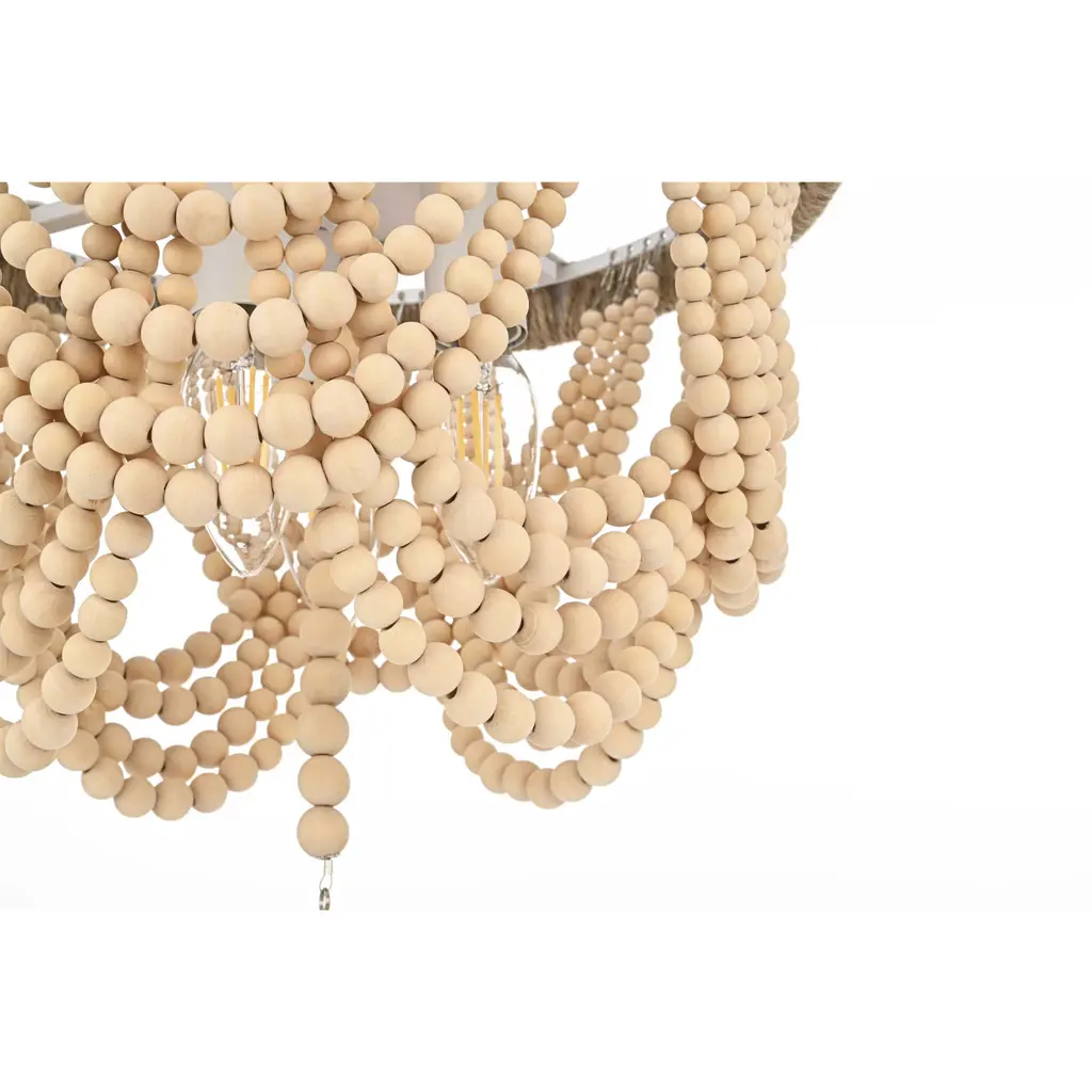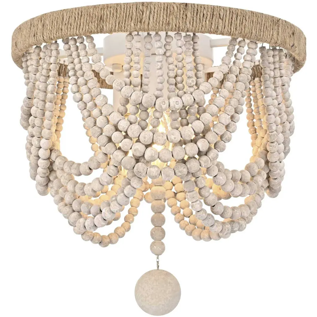 Transform your ceiling with this extraordinary semi-flush mount that reimagines traditional beaded chandelier design for modern spaces. The ingenious combination of a rope-wrapped crown and meticulously arranged wooden bead swags creates a stunning interplay of texture and form. Each tier of beads is thoughtfully positioned to create graceful scallops that catch and filter light in captivating ways. The substantial wooden finial anchors the design while adding an extra touch of artisanal beauty. Perfect for spaces where a traditional chandelier might overwhelm, this fixture brings all the drama of suspended beadwork while maintaining a practical ceiling-hugging profile. The iron framework provides sturdy support while remaining discreet, allowing the natural beauty of the wooden beads to take center stage. Whether styled in sophisticated antique white or warm natural beige, this fixture adds instant character to dining rooms, bedrooms, or entryways. The thoughtful blend of materials and textures creates a piece that feels both timeless and fresh, making it an ideal choice for designers and homeowners seeking to create a space with authentic charm and artistic presence.