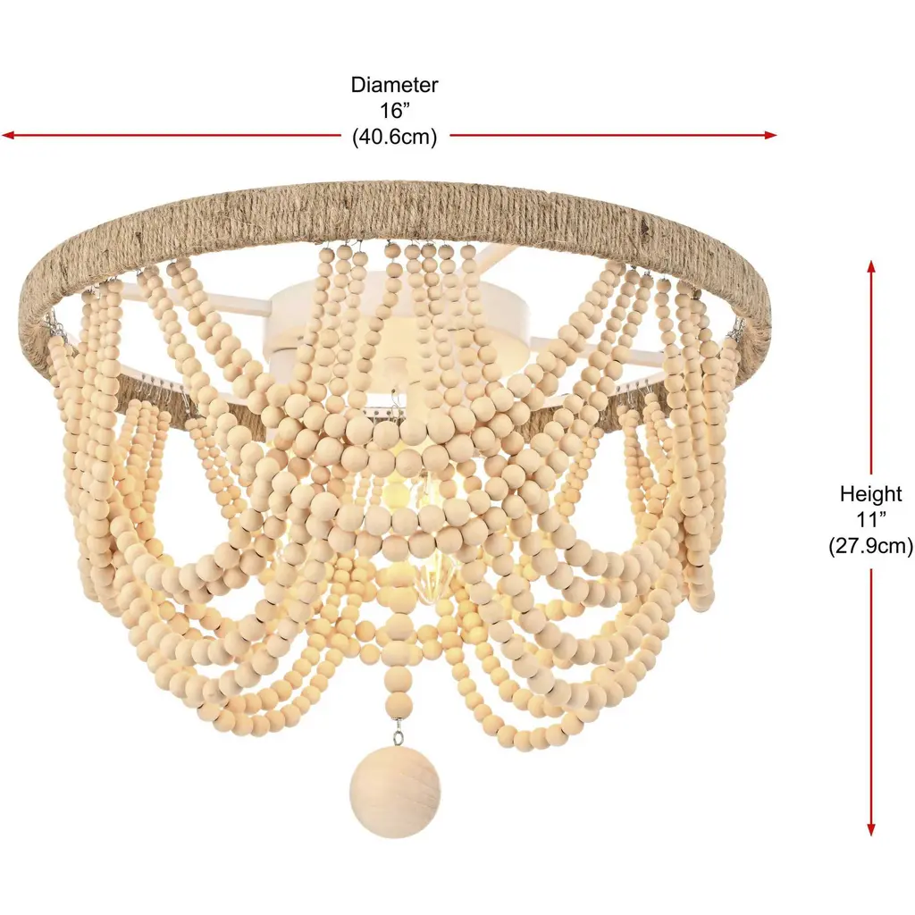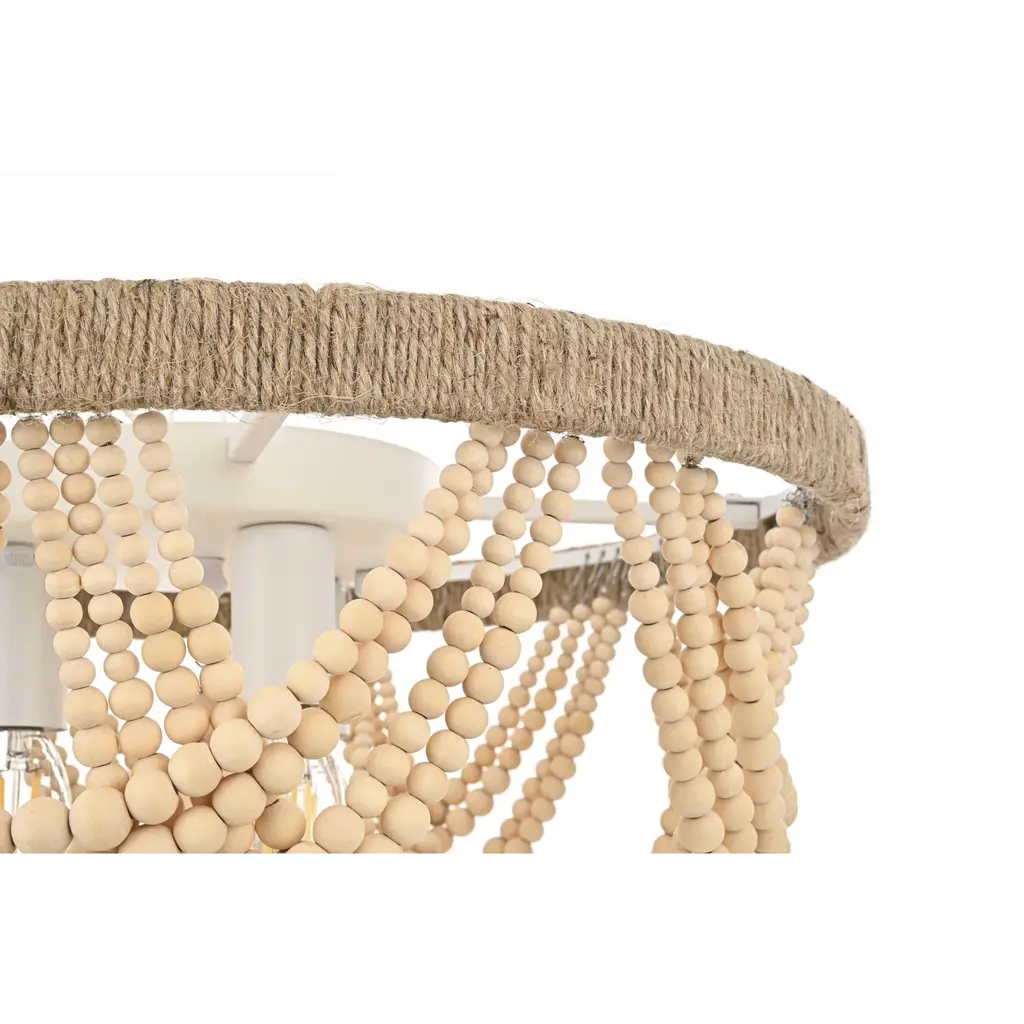 Transform your ceiling with this extraordinary semi-flush mount that reimagines traditional beaded chandelier design for modern spaces. The ingenious combination of a rope-wrapped crown and meticulously arranged wooden bead swags creates a stunning interplay of texture and form. Each tier of beads is thoughtfully positioned to create graceful scallops that catch and filter light in captivating ways. The substantial wooden finial anchors the design while adding an extra touch of artisanal beauty. Perfect for spaces where a traditional chandelier might overwhelm, this fixture brings all the drama of suspended beadwork while maintaining a practical ceiling-hugging profile. The iron framework provides sturdy support while remaining discreet, allowing the natural beauty of the wooden beads to take center stage. Whether styled in sophisticated antique white or warm natural beige, this fixture adds instant character to dining rooms, bedrooms, or entryways. The thoughtful blend of materials and textures creates a piece that feels both timeless and fresh, making it an ideal choice for designers and homeowners seeking to create a space with authentic charm and artistic presence.
