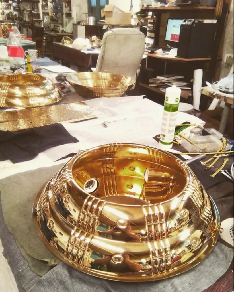 Very elaborate wall or ceiling lamp, designed for the Villa Gallia - Skywa - Primavesi, one of the last big houses, which is to consider the peak of Austrians architecture and cultivation of home decor, shortly bevor the World War I. Over and over chased in finest craftworkAll components according to the UL regulations, with an additional charge we will UL-list and label our fixtures.