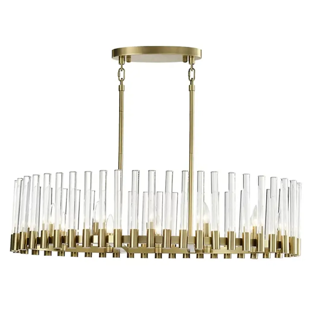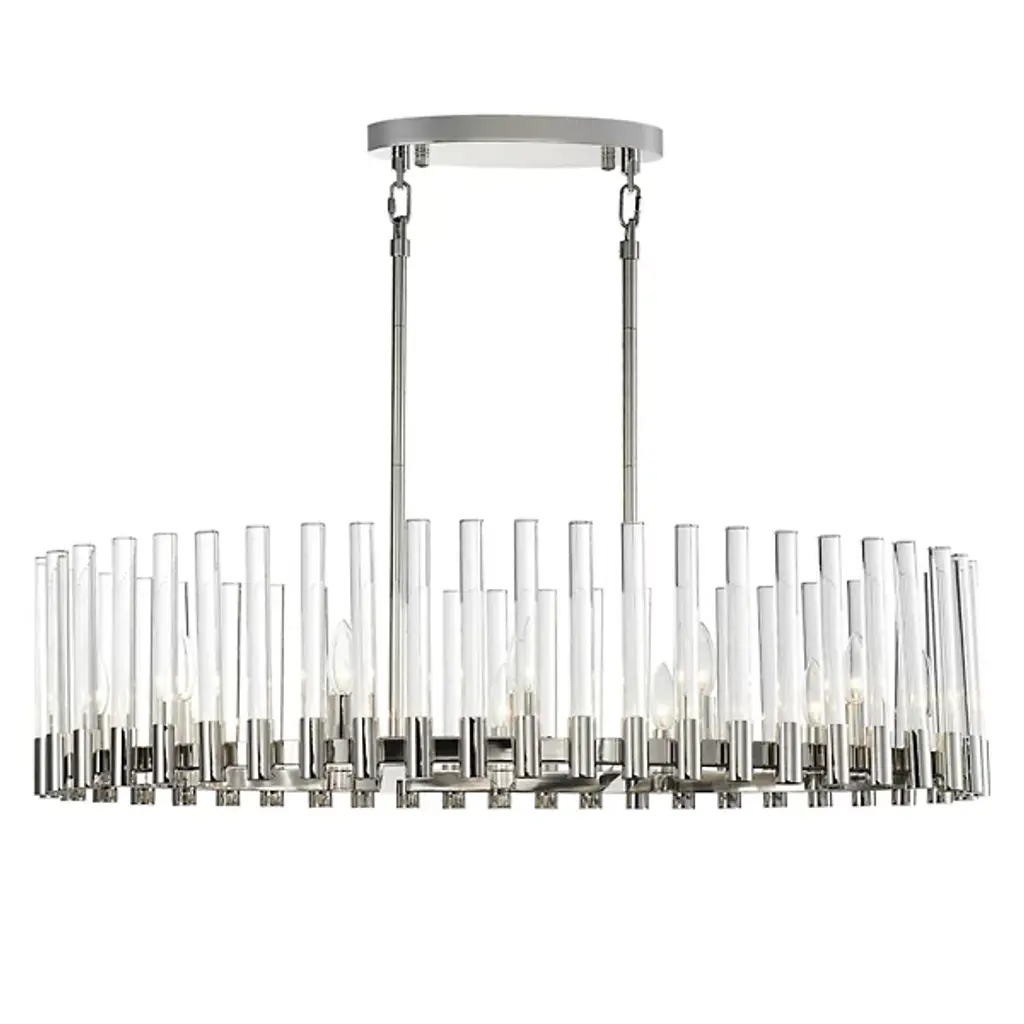 Smooth, elegant, and effortlessly expansive, the Julian Linear Suspension from Zeev Lighting delights with effortless classic style. Starting with a round canopy and parallel downrods, a broad lower ring, setting candelabra lamping behind an evenly-spaced array of clear glass rods that rise from cylindrical brackets in front of them. The glass reduces bright glare to the sides, transmitting a glittering glow accentuated by bars of direct light around it.