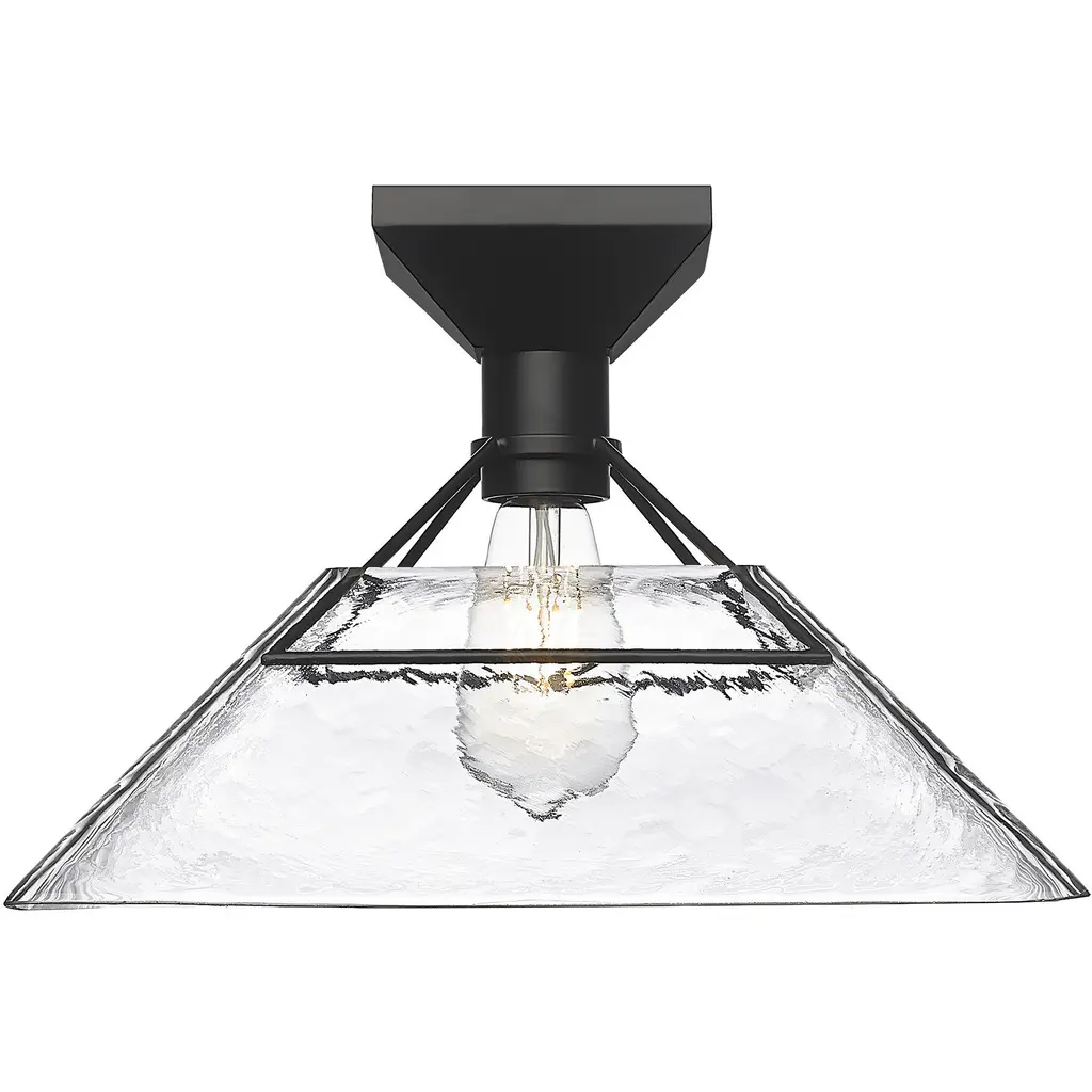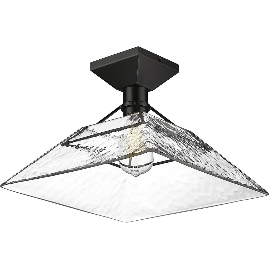 Bring modern elegance into your home with the Golden Lighting Kepler 1-light Semi-Flush Mount. Featuring a glass shade and a matte black frame, it creates a welcoming atmosphere. The water glass shade produces a shimmering, water-like refractive effect, beautifully catching and refracting light to create a dappled glow. The matte black finish epitomizes clean, modern style, offering a timeless appeal that complements any decor. Suitable for entryways, bedrooms, kitchens, and living areas with mid-height ceilings, this fixture is damp location rated for spaces with occasional moisture like bathrooms and covered porches. Overall dimensions are 14"W x 9.88"H x 14"D, and it requires 1 E26 Medium base bulb (not included), max 100 wattage. Add the Kepler fixture to your home for a stylish lighting solution that enhances both form and function.