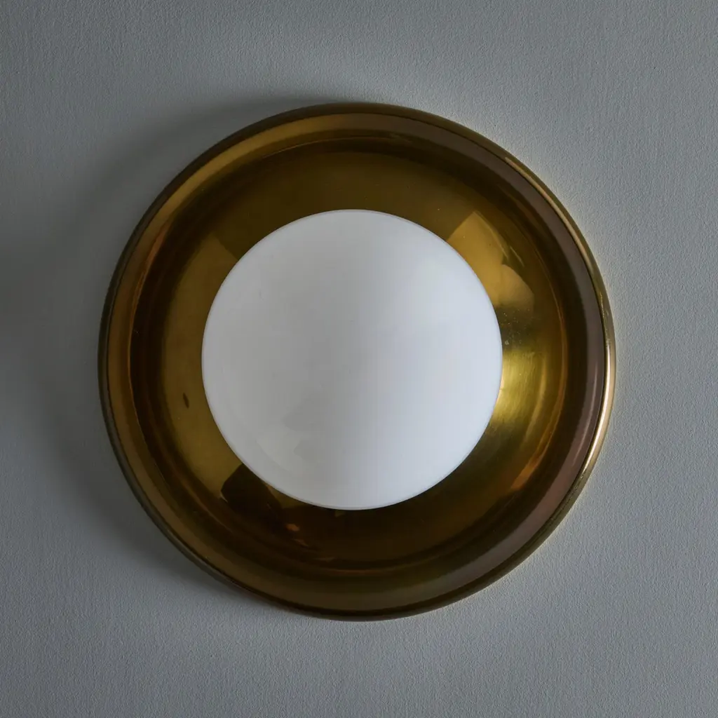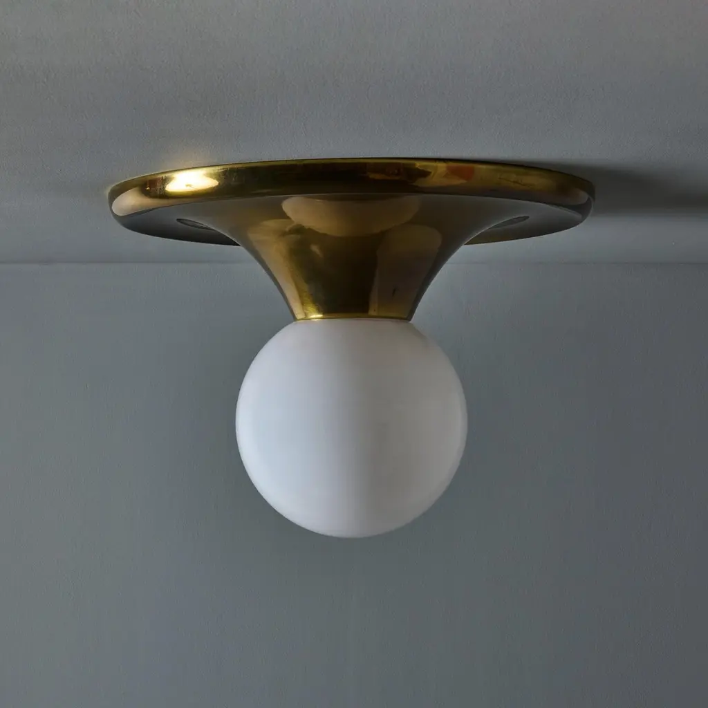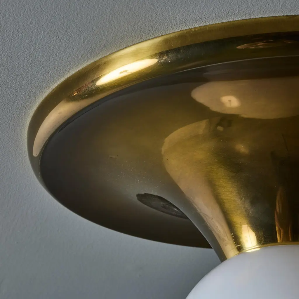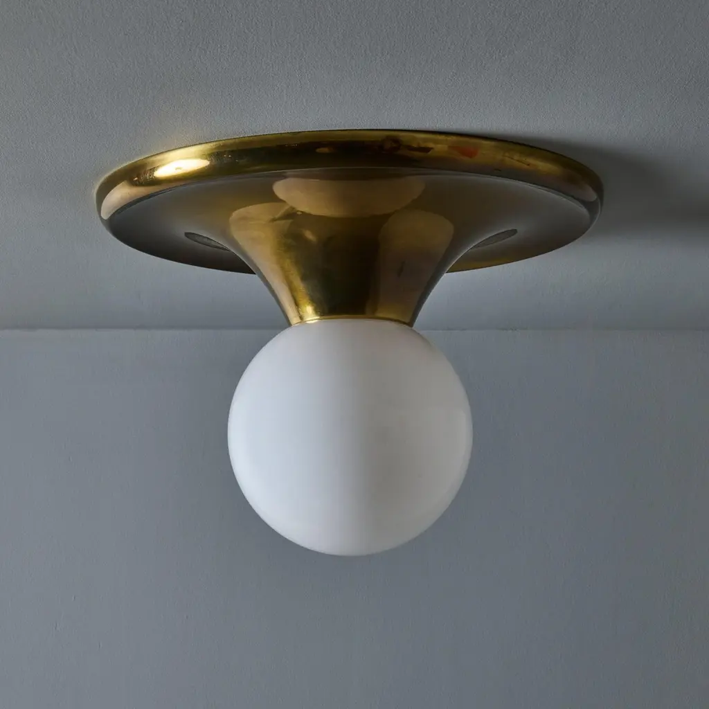 Large 1960s Achille Castiglioni & Pier Giacomo 'Light Ball' Wall or Ceiling Lamp. Designed in 1965, this rare variant is executed in attractively patinated brass and opaline glass. An incredibly refined and iconic midcentury design that is quintessentially Italian. Retains original manufacturer's sticker.Literature ref.: "1000 Lights: 1960 to Present," eds. Charlotte & Peter Fiell, Tachen, 2005 p.91Price is per item. 2 lamps available.Each lamp accommodates 1x 60W max equivalent standard medium base (e26) LED bulb (LED only). Professionally rewired for US electrical and modified for mounting over a standard US j-box. Not UL listed, but recommended UL listing possible from authorized 3rd party vendor upon request for an additional fee. Contact us to facilitate.Some age appropriate scuffs, dings, nicks, and wear as largely shown and noted only for accuracy. Note that only one representative example is featured in the listing images, but both lamps in similarly good condition and present well as a pair.