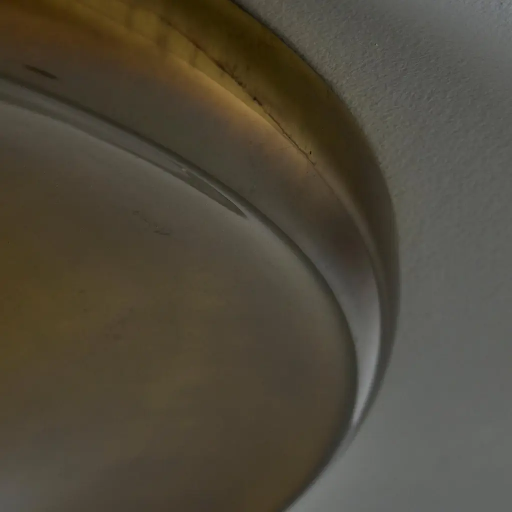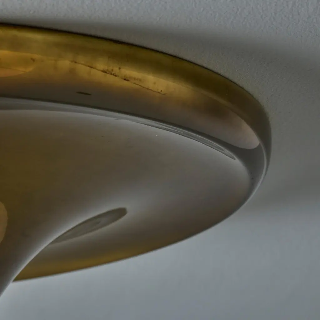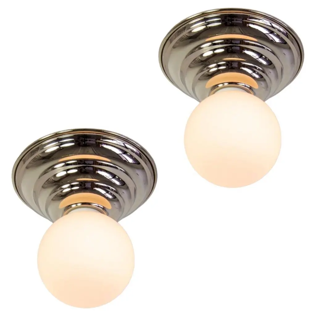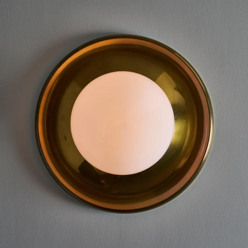 Large 1960s Achille Castiglioni & Pier Giacomo 'Light Ball' Wall or Ceiling Lamp. Designed in 1965, this rare variant is executed in attractively patinated brass and opaline glass. An incredibly refined and iconic midcentury design that is quintessentially Italian. Retains original manufacturer's sticker.Literature ref.: "1000 Lights: 1960 to Present," eds. Charlotte & Peter Fiell, Tachen, 2005 p.91Price is per item. 2 lamps available.Each lamp accommodates 1x 60W max equivalent standard medium base (e26) LED bulb (LED only). Professionally rewired for US electrical and modified for mounting over a standard US j-box. Not UL listed, but recommended UL listing possible from authorized 3rd party vendor upon request for an additional fee. Contact us to facilitate.Some age appropriate scuffs, dings, nicks, and wear as largely shown and noted only for accuracy. Note that only one representative example is featured in the listing images, but both lamps in similarly good condition and present well as a pair.