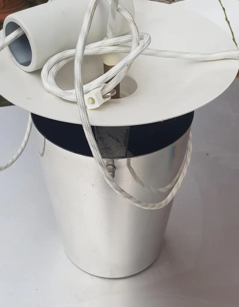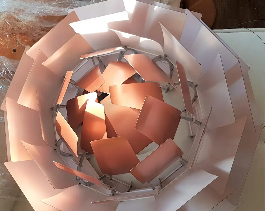 This is the rare Copper Rose Model that was produced till the end of the Seventies. The light was only hung once and rarely used, never dismantled until the current redesign of the room. Delivered with original mounting materials, suspension, and light bulb. Max. cord length with canopy 165 cm. Light body 70 cm high. There were different suspensions. For the production period, suspension on 2 cords was typical, later also 3. I have official proof of authenticity such as vintage catalogs, designer records, or other literature sources and take full responsibility for any authenticity issues arising from misattribution, European Plug (up to 250V).The wiring of this item may be original and might need replacement, if not specified otherwise.