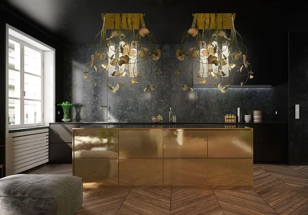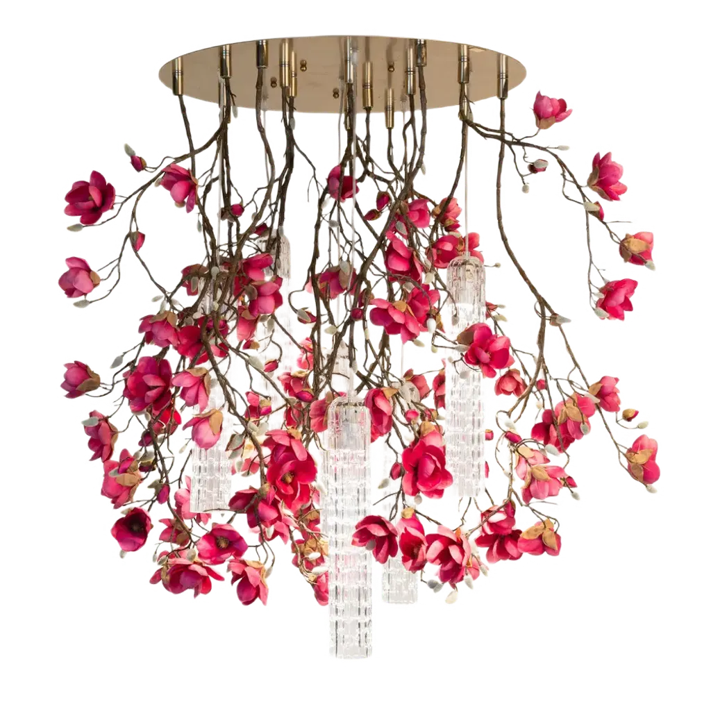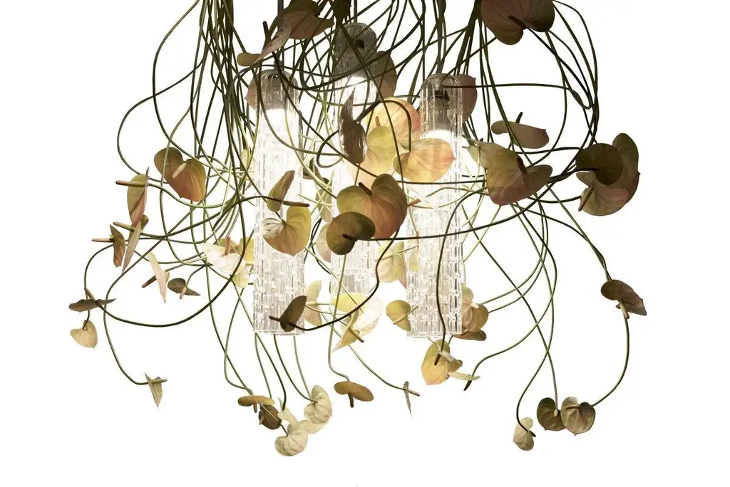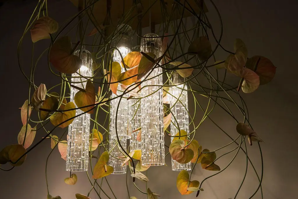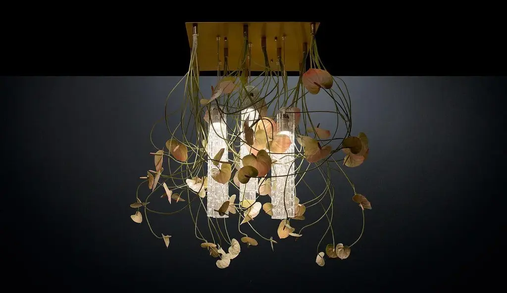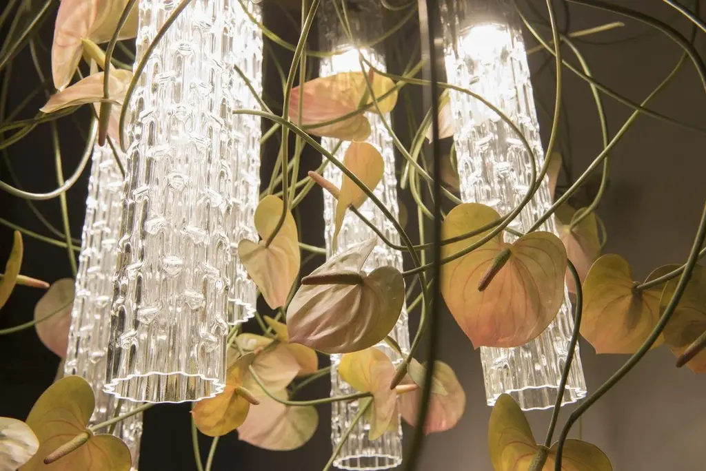Chandelier consisting of vg artificial flowers and pipes in muranese glass, led bulbs (10 bulbs gu10 x 6w each) fitted with fixing plate in varnished steel champagne color, to be suspended or ceiling mounted. vg ivies garland in various colours and different length are supplied as standard version, creating a vegetative flowerbed. plate size is approx 15 cm shorter in length and width than volume dimensions. up to 250v (europe/uk standard).