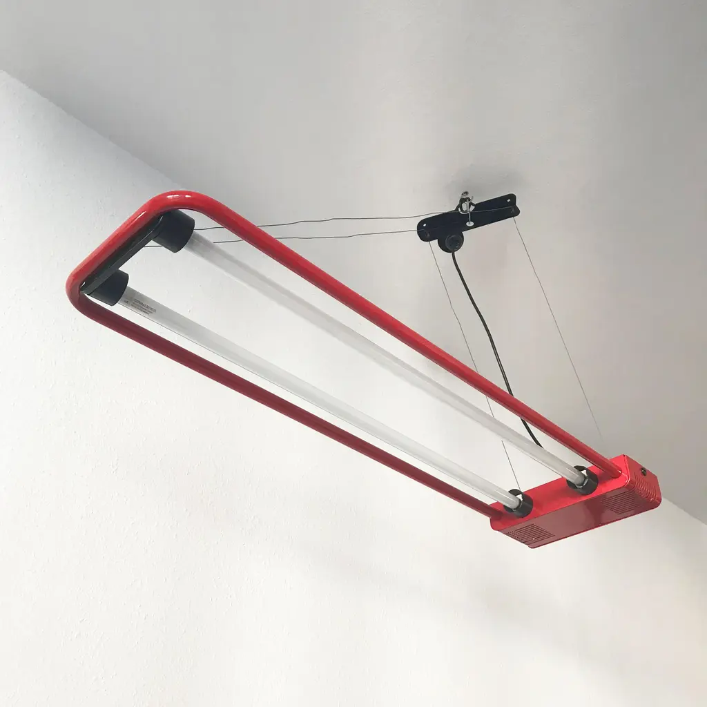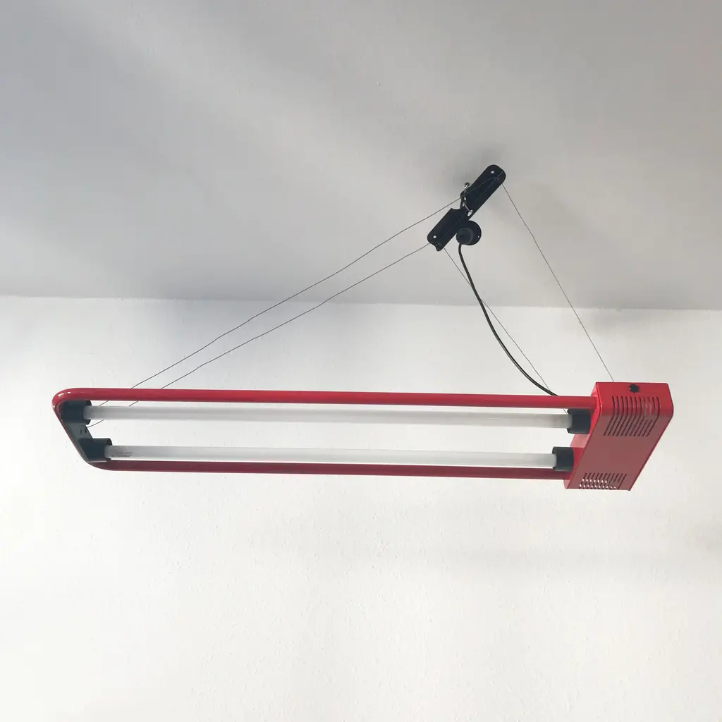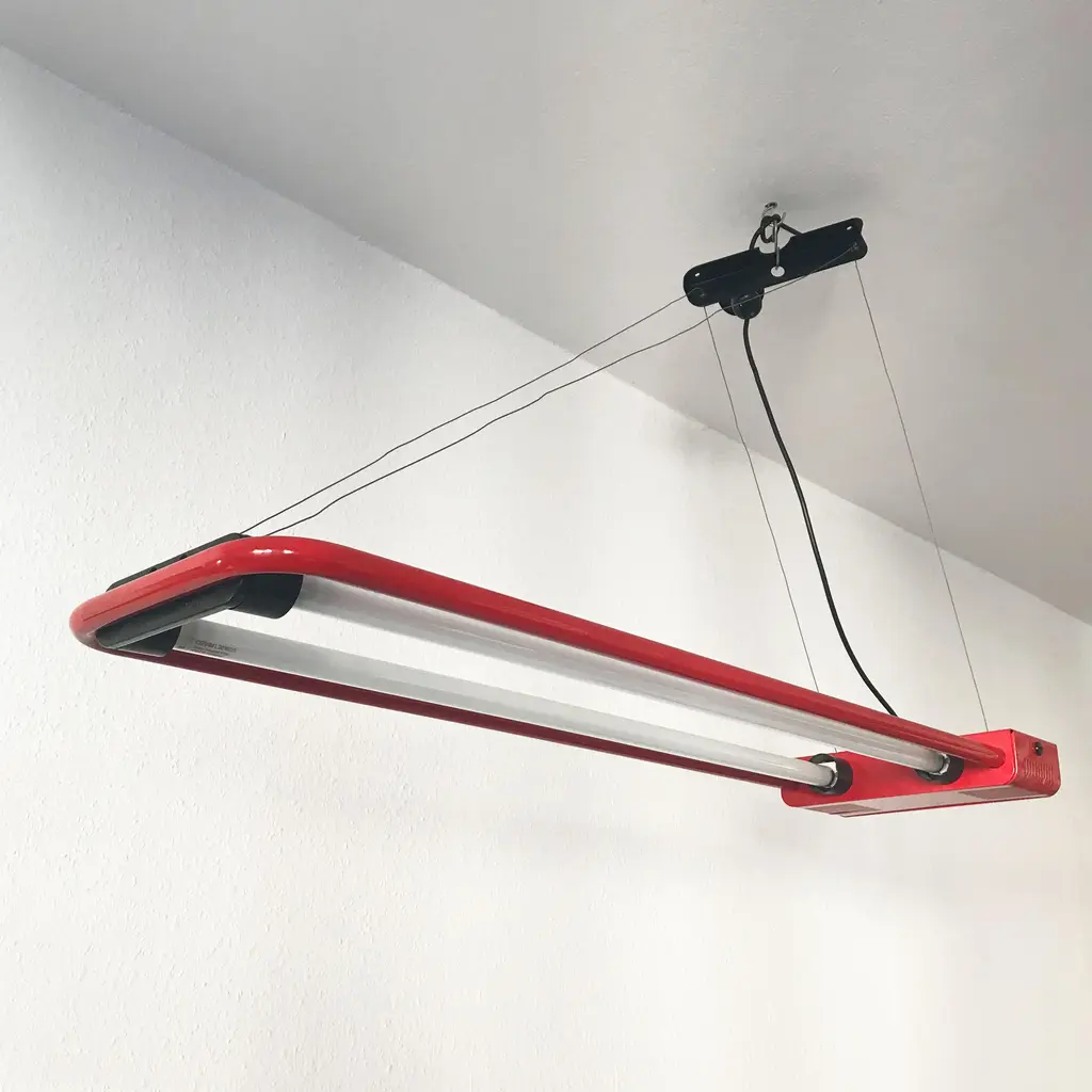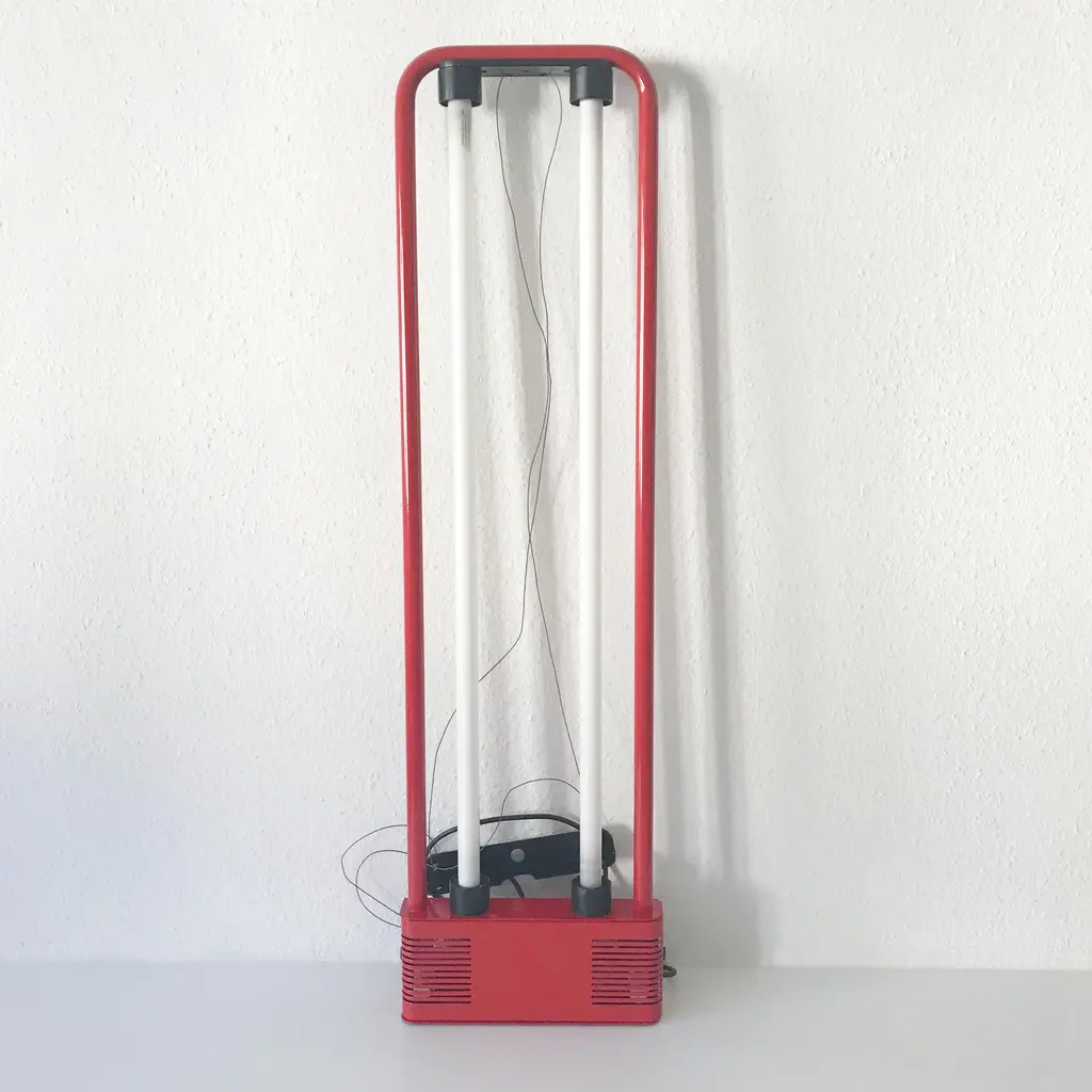 This large fluorescent tube lamp was designed by g. N. Gigante, m. Boccato & a. Zambusi in 1981 and produced by zerbetto in padovo, italy. The light illuminates with 220/240 v bulbs; an adapter is needed to accommodate 110/120 v bulbs. The lamp does not include the tubes. This red lacquered lamp is wired and in working condition. Labeled by maker, european plug (up to 250v).the wiring of this item may be original and might need replacement, if not specified otherwise.