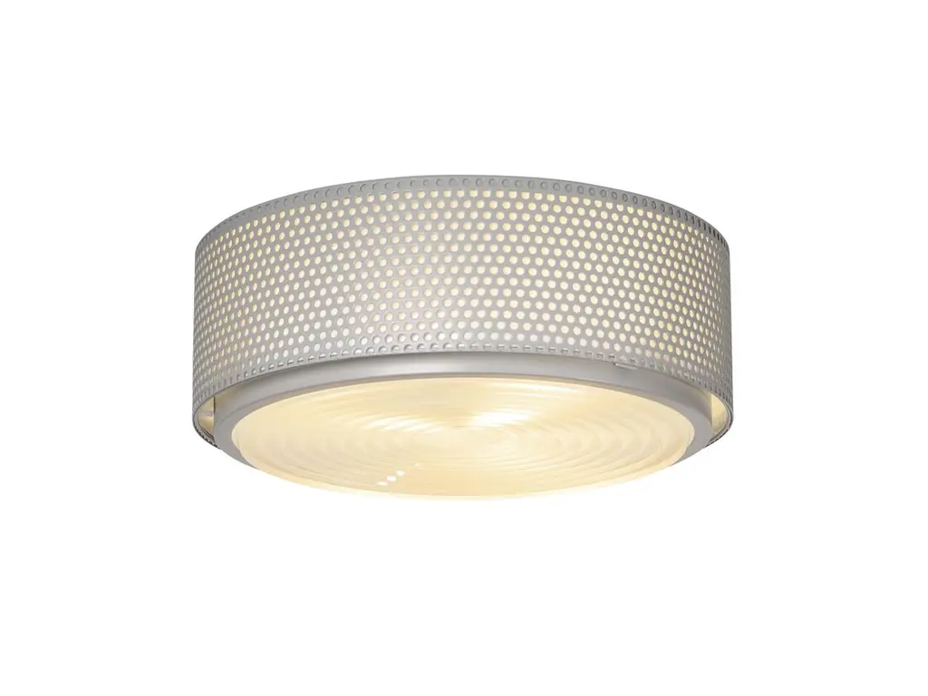 Large Pierre Guariche 'G13' wall or ceiling light for Sammode Studio in gray. Originally designed by Pierre Guariche, this iconic lamp is newly produced in an authorized re-edition by Sammode Studio in France embracing many of the same small-scale manufacturing techniques, quality materials and scrupulous attention to detail as the original. Executed in painted perforated steel and pressed fresnel glass, this light can be mounted on either the wall or the ceiling. Price is per item. Available in unlimited quantities in three sizes and in choice of black, gray, or white, please see our other listings. This listing is for the large lamp in gray.In stock lead time 7-8 weeks. Out-of-stock lead time 9-10 weeks or more. Please note that inventory availability and lead time can change without notice. Please contact us for current lead times prior to placing time-sensitive orders.Accommodates 3x 60W equivalent medium base e26 LED bulbs (not included). Recommended LED bulbs by Tala available separately. New in box and professionally modified for US electrical. Not UL listed. Recommended UL listing possible from an authorized 3rd party vendor for an additional cost.Made to order.All sales are final.