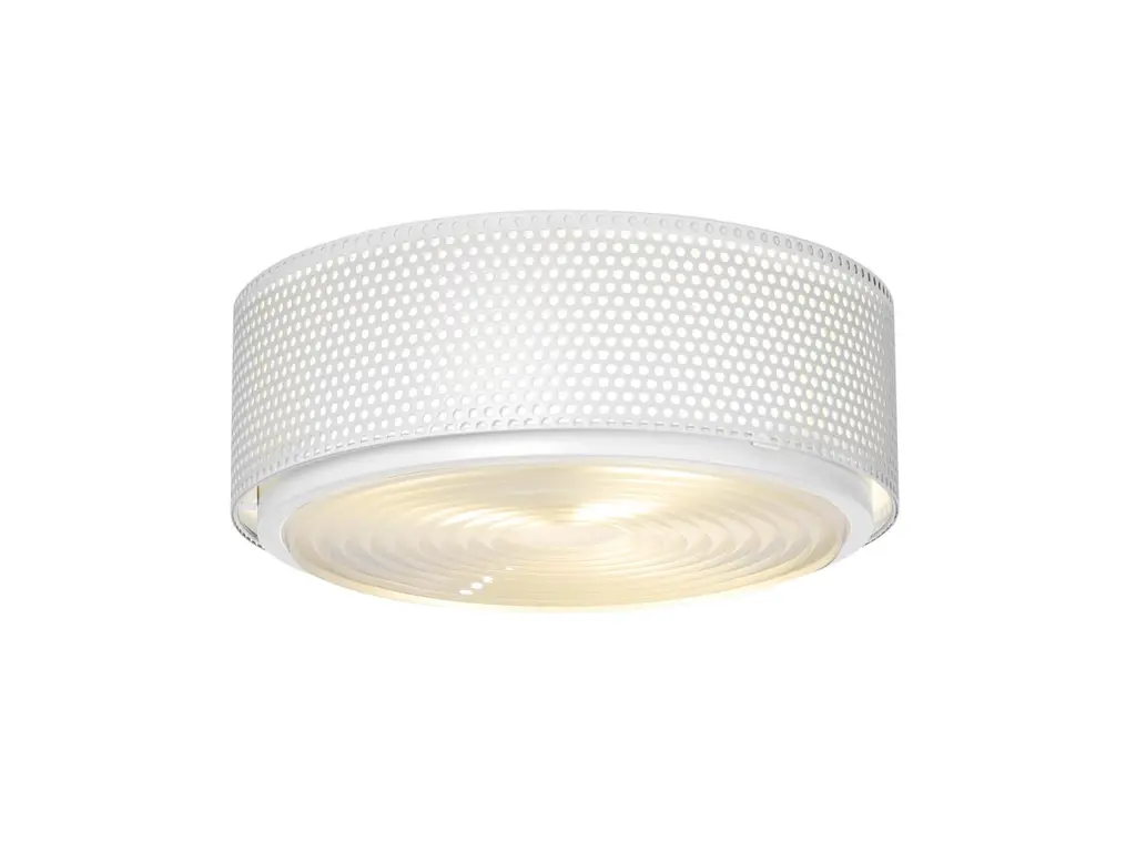 Large Pierre Guariche 'G13' wall or ceiling light for Sammode Studio in white. Originally designed by Pierre Guariche, this iconic lamp is newly produced in an authorized re-edition by Sammode Studio in France embracing many of the same small-scale manufacturing techniques, quality materials and scrupulous attention to detail as the original. Executed in painted perforated steel and pressed fresnel glass, this light can be mounted on either the wall or the ceiling. Price is per item. Available in unlimited quantities in three sizes and in choice of black, gray, or white, please see our other listings. This listing is for the large lamp in white.1x lamp in stock and available for immediate delivery. Out-of-stock lead time 9-10 weeks or more. Please note that inventory availability and lead time can change without notice. Please contact us for current lead times prior to placing time-sensitive orders.Accommodates 3x 60W equivalent medium base e26 LED bulbs (not included). Recommended LED bulbs by Tala available separately. New in box and professionally modified for US electrical. Not UL listed. Recommended UL listing possible from an authorized 3rd party vendor for an additional cost.Made to order.All sales are final.