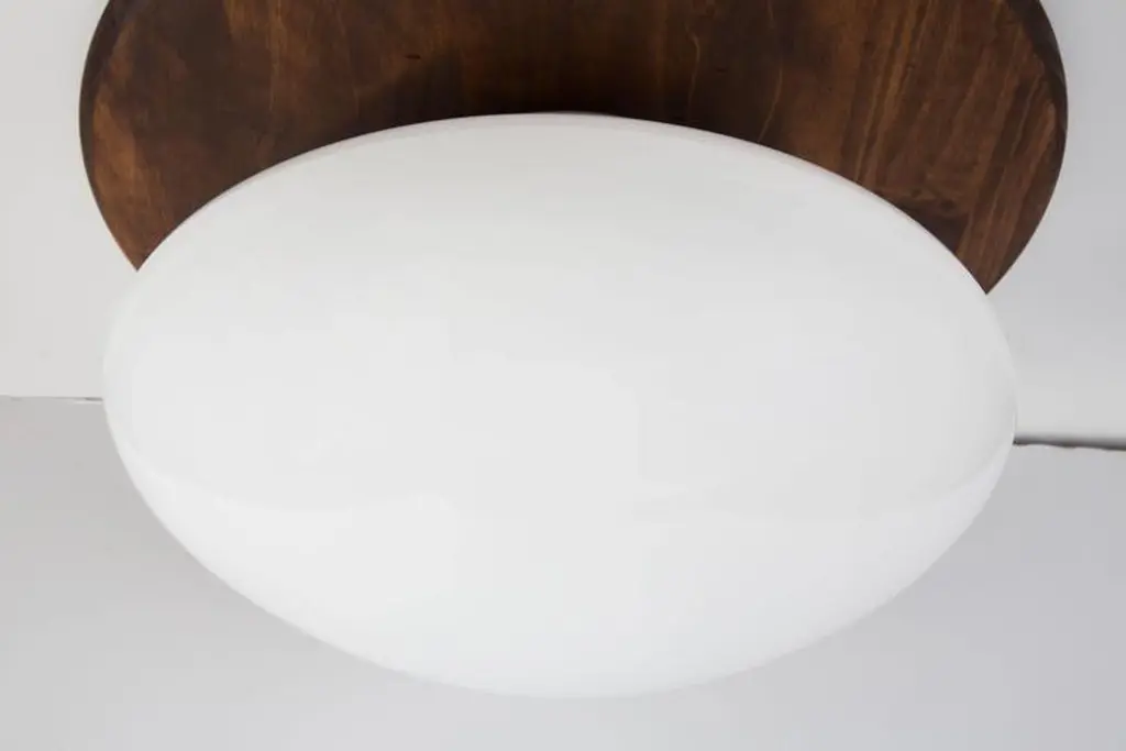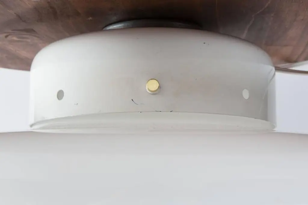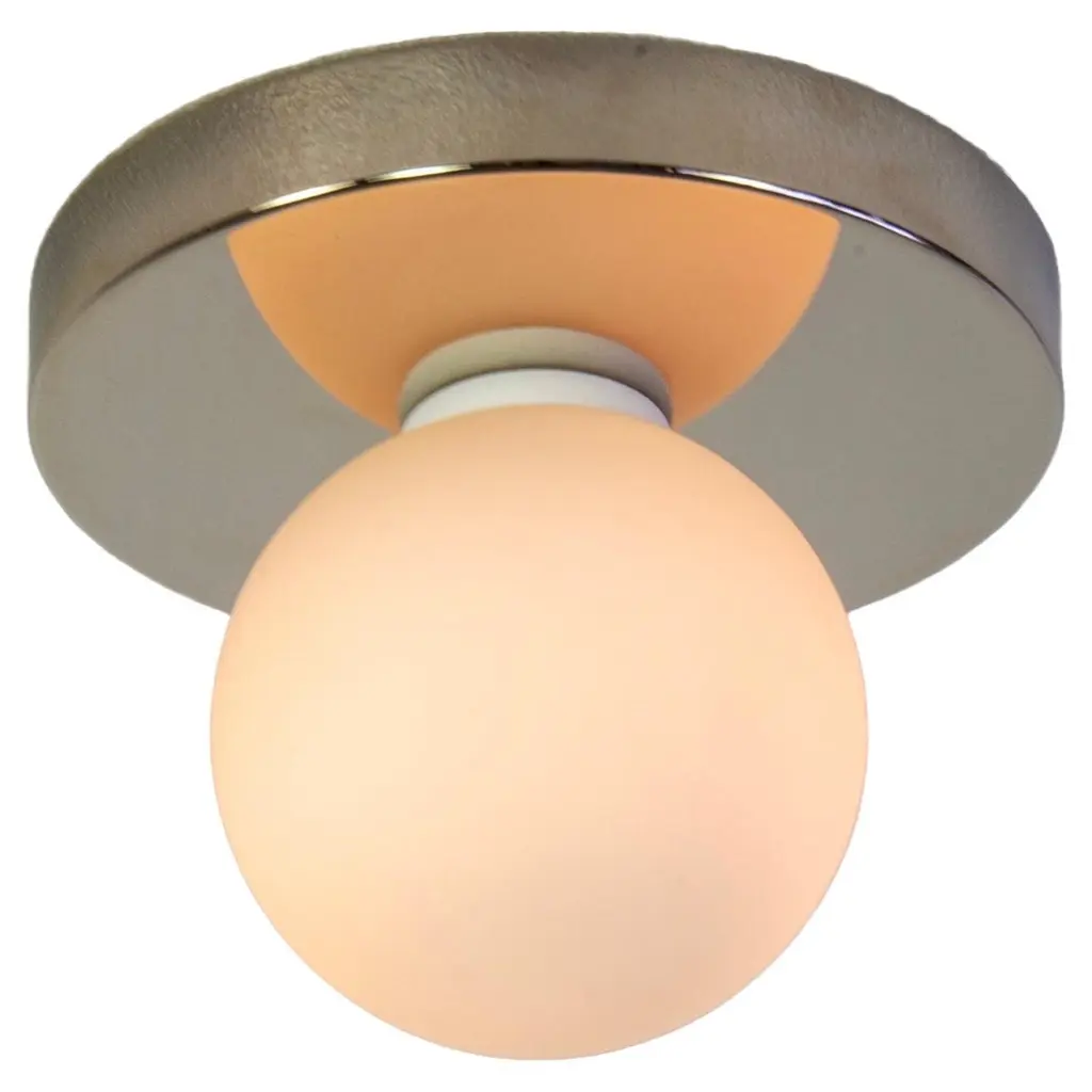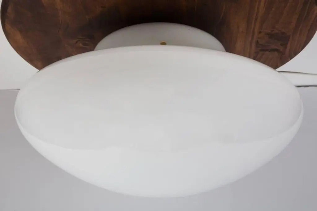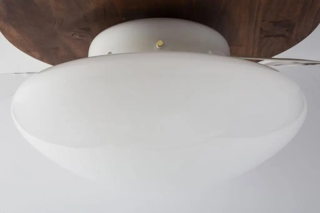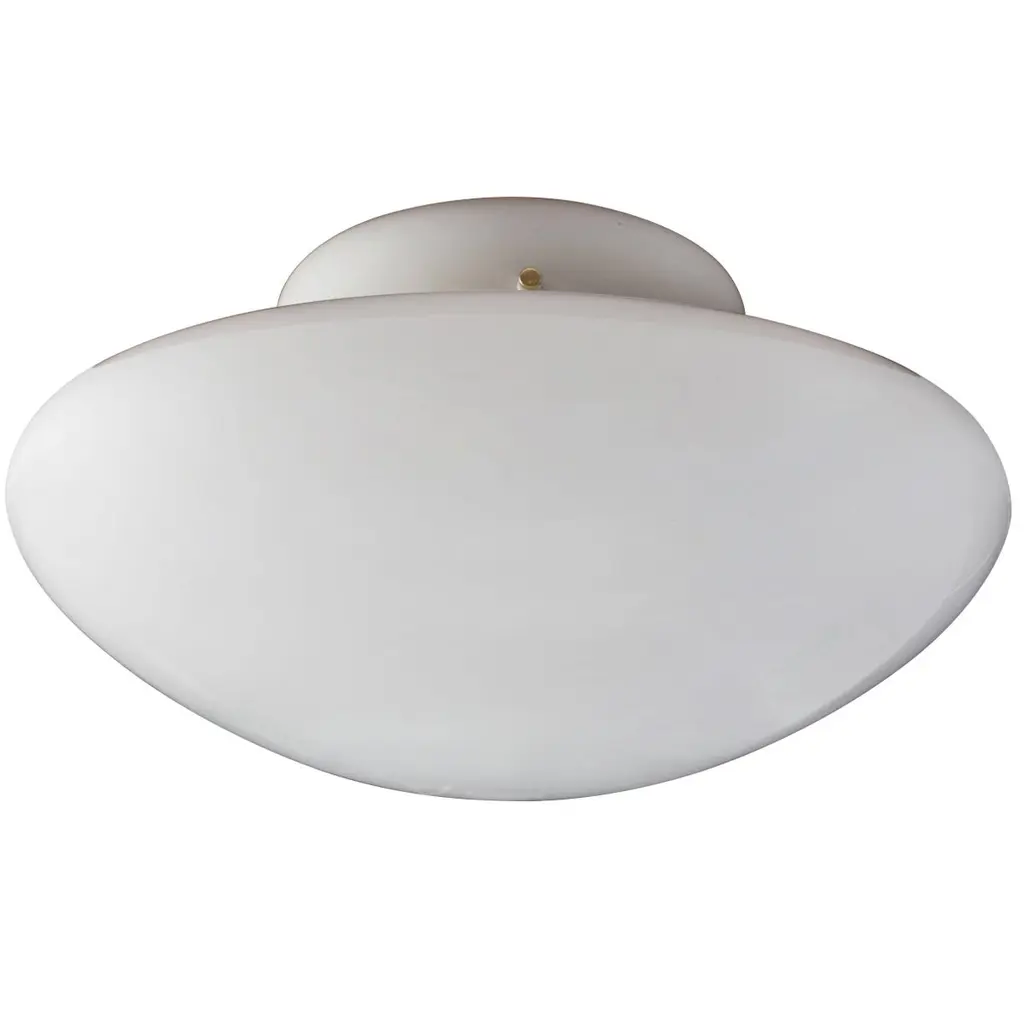 Large Sergio Mazza 'Magnolia' ceiling lamp for Quattrifolio, circa 1971. Executed in a seemingly floating bilious hand blown opaline glass shade below a Minimalist white enameled metal base for Quattrifolio, Italy. An extremely clean and sculptural ceiling lamp that casts a richly warm light.Price is per item. 2 lamps available.Born in Italy in 1931, Sergio Mazza created numerous iconic designs throughout his legendary career, from a range of lighting to fiberglass molded seating and other home furnishings which due to their limited production runs have become highly collectible with their clean lines and intuitive utility.Not UL listed, but recommended UL listing possible from authorized 3rd party vendor upon request for an additional fee. Please contact us to facilitate. Note only one representative example shown in photos. Wear and patina vary some from lamp to lamp.