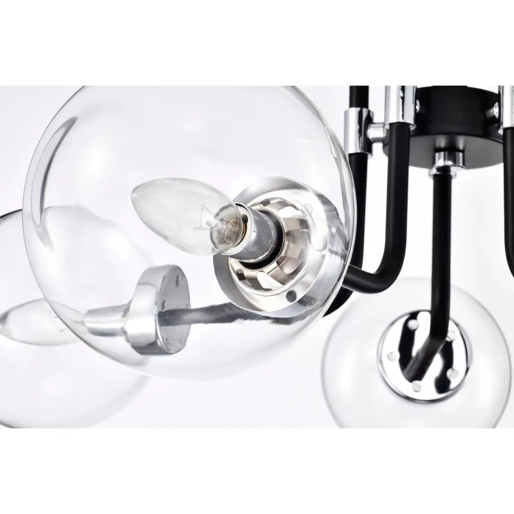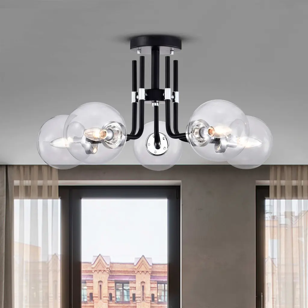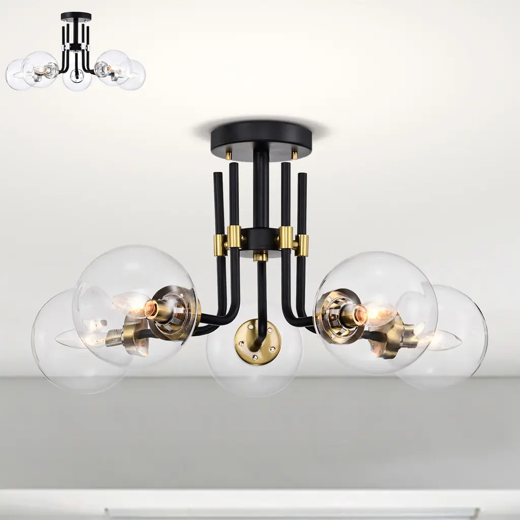 This semi-flush mount ceiling light features a sputnik shape with globe-clear glass shade. Its distinct silhouette breaks from a classic chandelier with its globe fabric shape design, adding a strong ambiance to your space. Available in both Silver and Gold.Features:Dimensions:Note:This light is not damp rated. Whether it is dimmable or not depends on the light bulb not on the light fixture itself. If you use dimmable light bulb and a dimmer switch, it will be dimmable. This fixture does need to be hard wired. Assembly is required. Professional installation is recommended. This light cannot be installed on a sloped or vaulted ceiling.