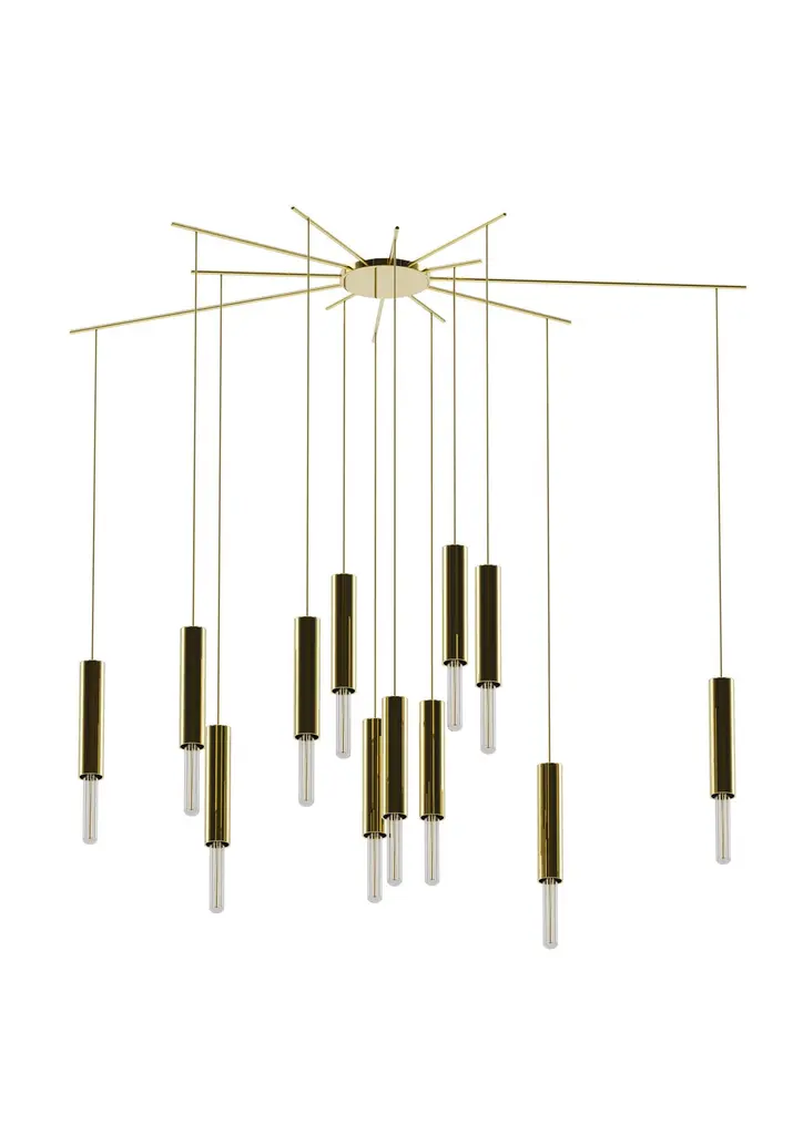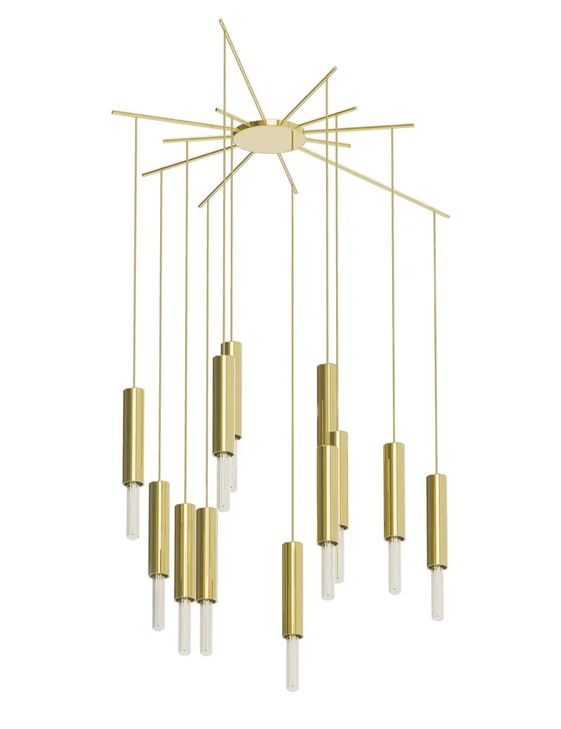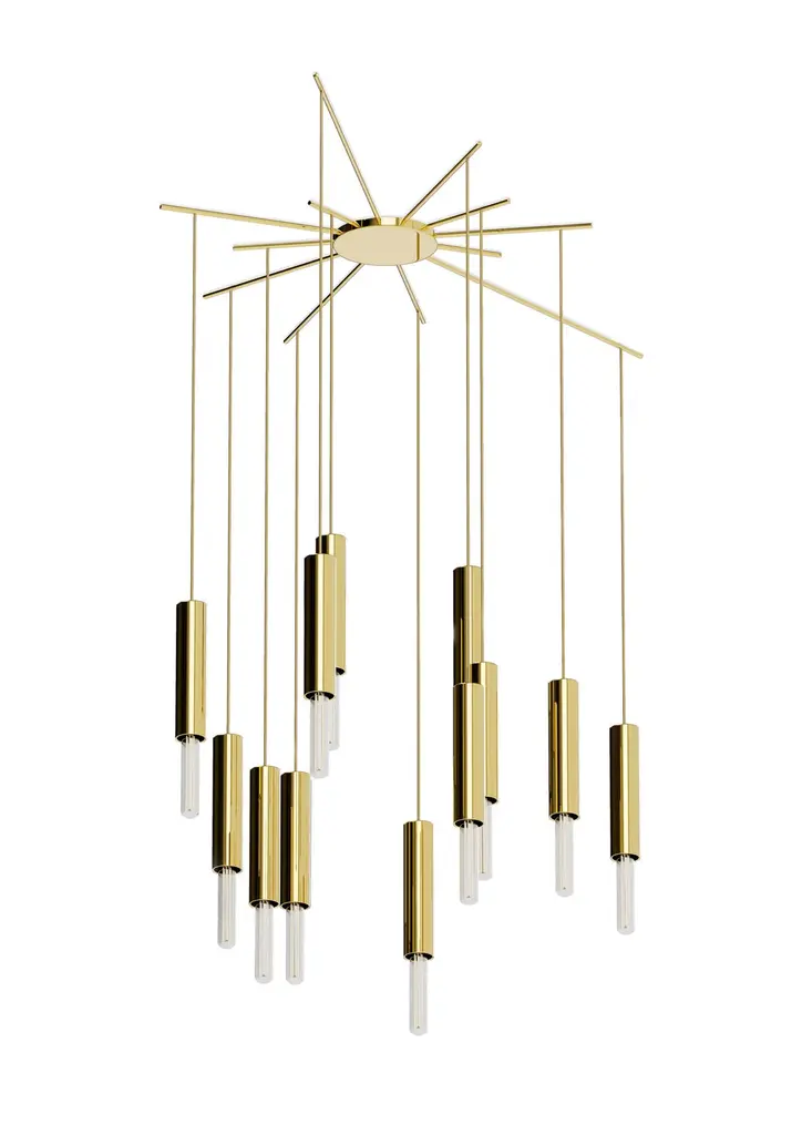 Lightrain ceiling lamp, Royal Stranger.Dimensions: Adjustable height.Measures: width 115, depth 62 cm.Materials: Polished brass structure and vintage lamps.Like a rain of light dropping from your ceiling, the vintage lamps combined with the metal structure will add a touch of light and a pinch of new luxury to your space.Royal stranger is an exclusive furniture brand determined to bring you the best unique pieces of art and design.Fusing design, art and the best craftsmanship, they strive to deliver the best state of the handmade art furniture. The design team works every day to create meaningful products that represent values such as passion, function, aesthetics and know-how. Values that are meant to represent Royal stranger’s DNA. This dedication is present at all stages of production and the combination of craftsmanship and innovative design contributes toour final purpose: to produce certified high-quality products, made with passion and expertise and using royal materials such as gold leaf, rich woods and high quality lacquers.It was in 2013, as an architects, that Sofia Santos & Rui Santos started to push the boundaries of innovation in several retail design concepts for some of the best stores in Portugal. This will has always been present in their work, and that’s how the brand was born.