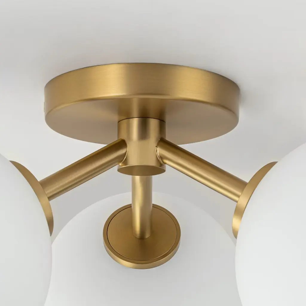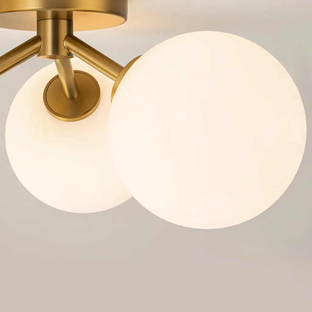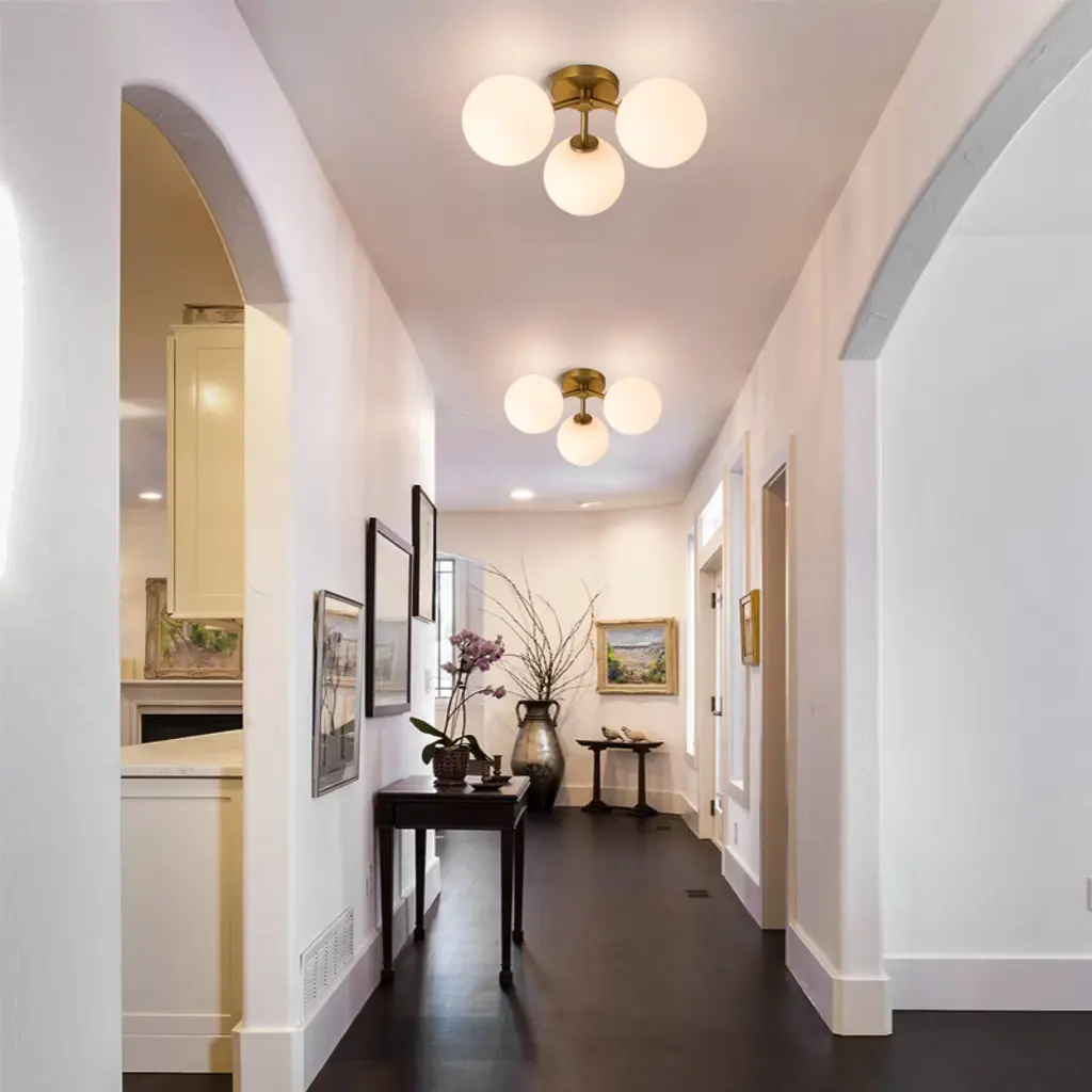 This contemporary glass Sputnik ceiling light offers a refined touch with its 3 glass globe shades, ideal for any modern or vintage-inspired space. The fixture measures 18 3/25" W x 7 1/10" H and features a durable 4 5/8" wide canopy. Choose from gold or black finishes, complemented by opal or ribbed glass for a soft, elegant glow. The light is compatible with 3 x E26 base bulbs (up to 40W each) and is fully dimmable, allowing you to set the perfect mood. Easy to install, this fixture is perfect for kitchens, hallways, living rooms, and more.