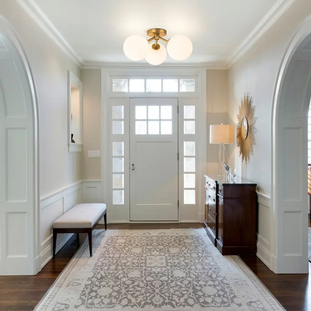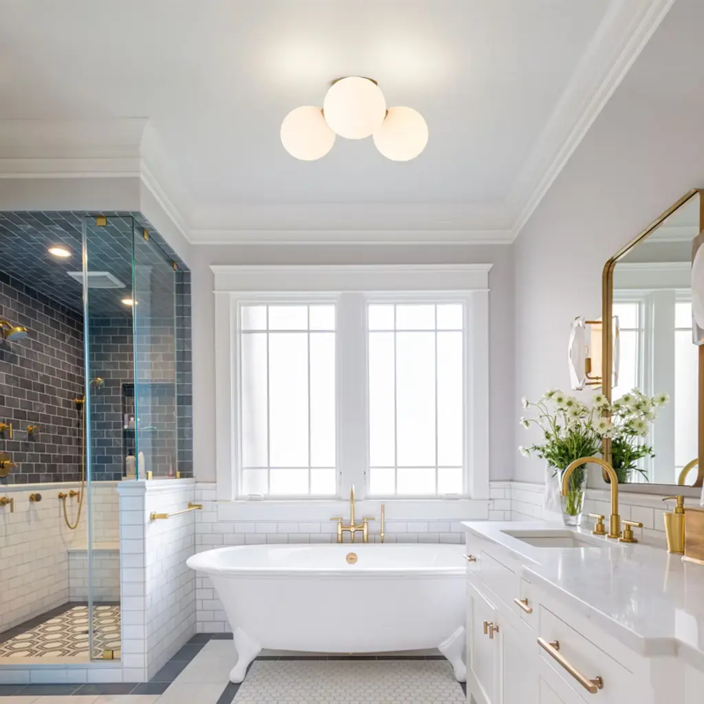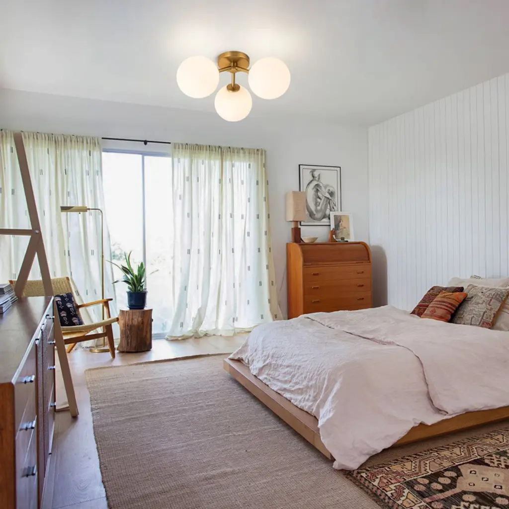 This contemporary glass Sputnik ceiling light offers a refined touch with its 3 glass globe shades, ideal for any modern or vintage-inspired space. The fixture measures 18 3/25" W x 7 1/10" H and features a durable 4 5/8" wide canopy. Choose from gold or black finishes, complemented by opal or ribbed glass for a soft, elegant glow. The light is compatible with 3 x E26 base bulbs (up to 40W each) and is fully dimmable, allowing you to set the perfect mood. Easy to install, this fixture is perfect for kitchens, hallways, living rooms, and more.