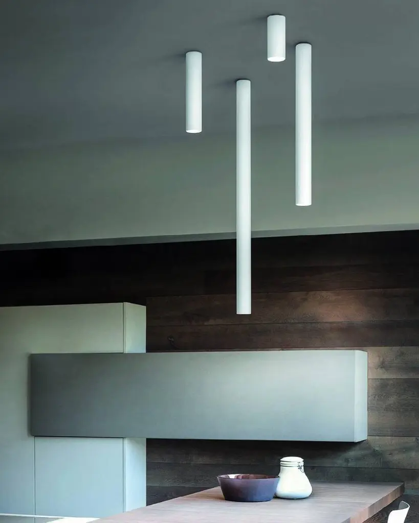 A simple form that delivers the light to wherever it’s needed, enhancing the space. Tubular and slim, A-Tube is a versatile lamp, available in different sizes and finishes, that can be fixed directly to the ceiling, suspended singularly, or used in cluster compositions to create impactful lighting effects.A-Tube is a lamp characterised by an elegant, cylindrical design, perfect for illuminating specific points and furnishing with dynamic essentiality. Available in two versions, ceiling and suspension, it can be used either singularly or to create lively compositions distinguished by their differing lengths and finishes (matte white, matte black and coppery bronze). As a central feature with multiform lighting, in a neat row over a bench or in a rhythmic succession of different sized lines, A-Tube illuminates, becoming one with the interior architecture.The aluminium body of A-Tube, with a diameter of 6 cm, is 4 mm thick, making it both solid and resilient. Inside, its structure is designed to house a GU10 lamp that diffuses direct light. The ceiling version, available in four sizes (14, 30, 60, 100 cm), can easily be fixed with a simple metal attachment. The suspension version comes in three different lengths, 30, 60 and 100 cm, which can be used as single pendants or combined on canopies to create multiple compositions.Available in different options:Finish:• Matte White• Matte Black• Coppery BronzeDIMENSIONS:Ø 6 x H. 30.8 cm