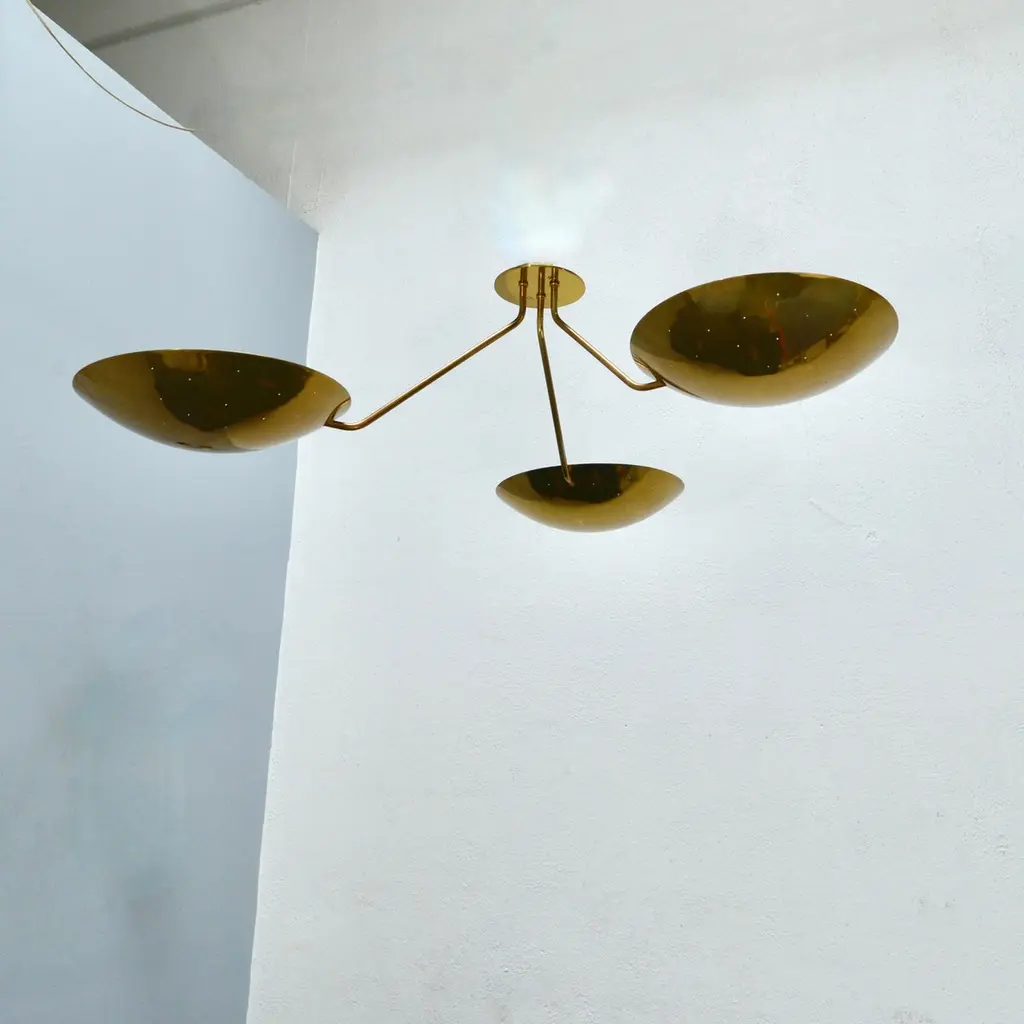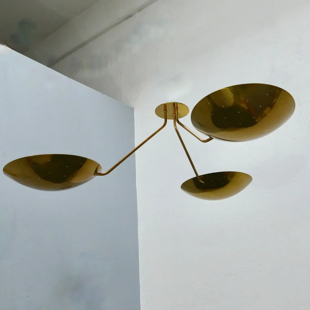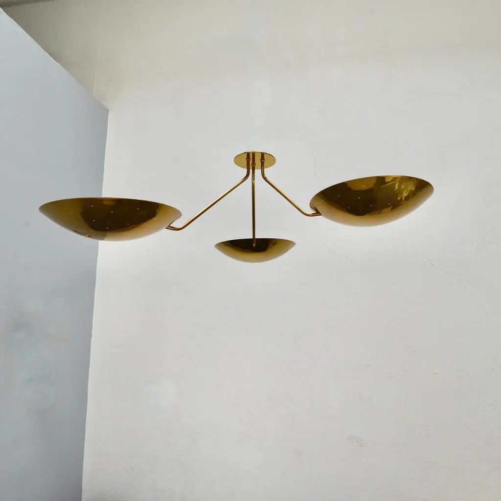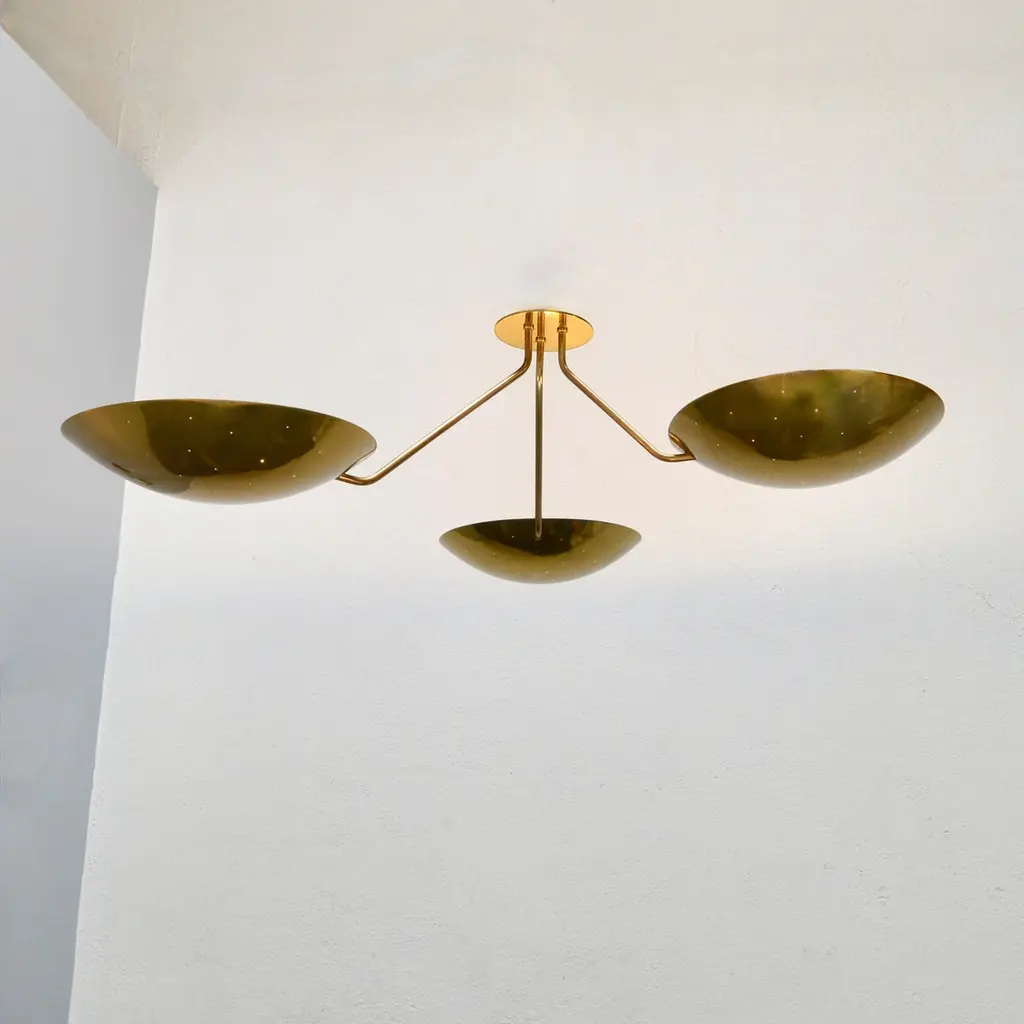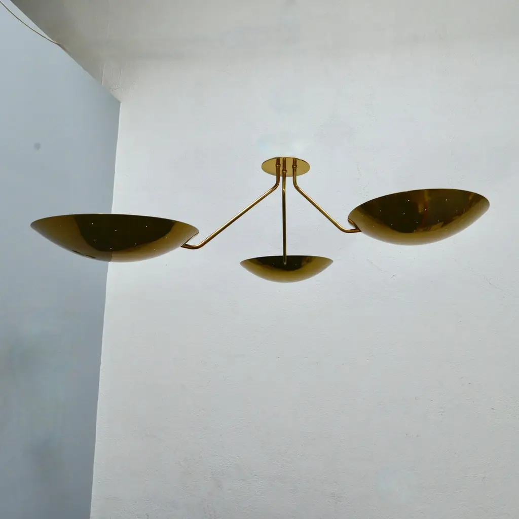 LU 3 Ceiling Fixture is an all perforated brass ceiling fixture inspired by classical mid century Italian design. This stunning fixture has 3 beautifully fabricated perforated brass dish lights joined at a center rod. Made in solid lightly aged patina brass. Wired with 3-E26 medium based sockets, 1 per dish. It can also be wired for use anywhere in the world. Light bulbs and mounting hardware included with order. order. Made to order.Measurements:Height: 11” Diameter: 44”Dish Shades: 12”