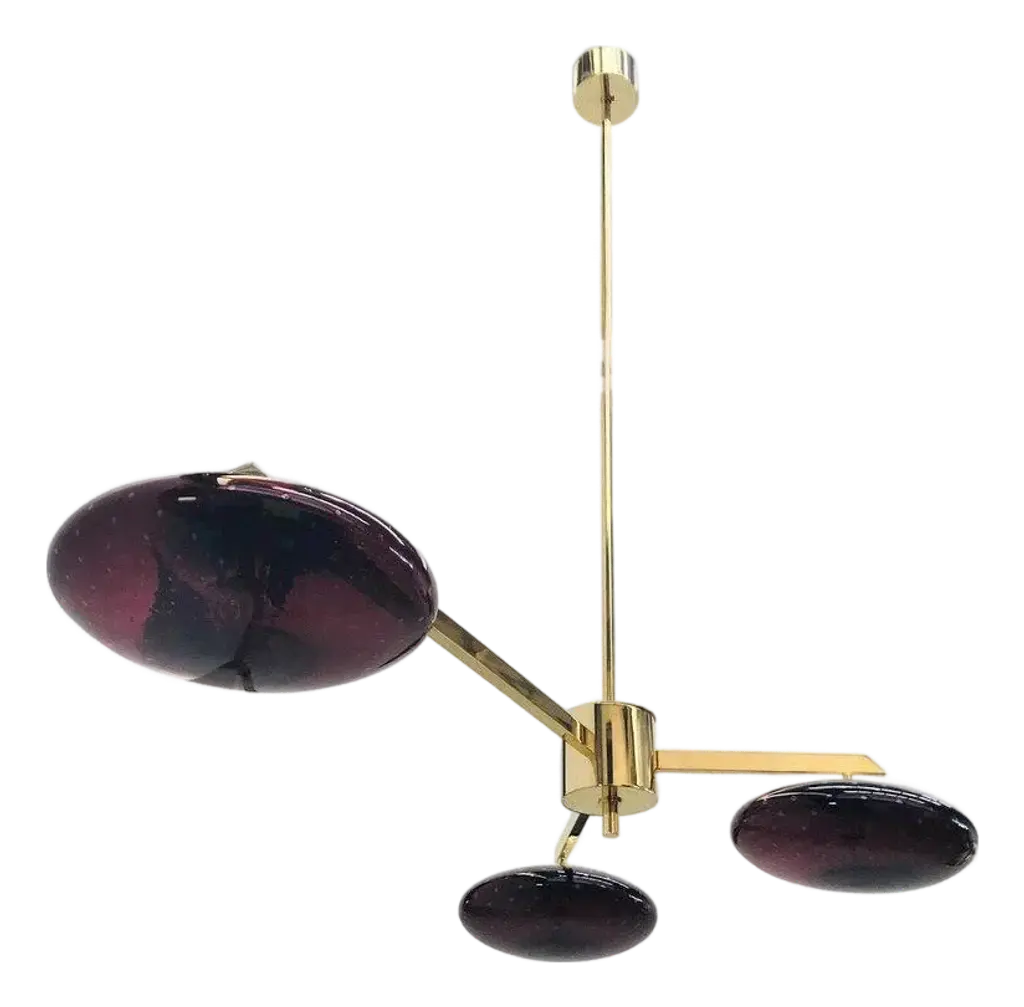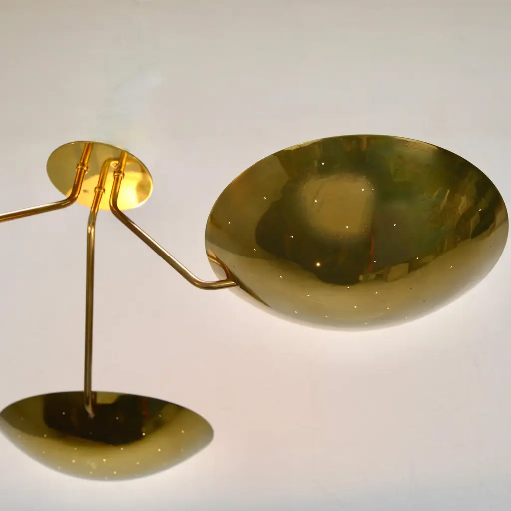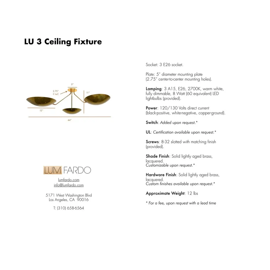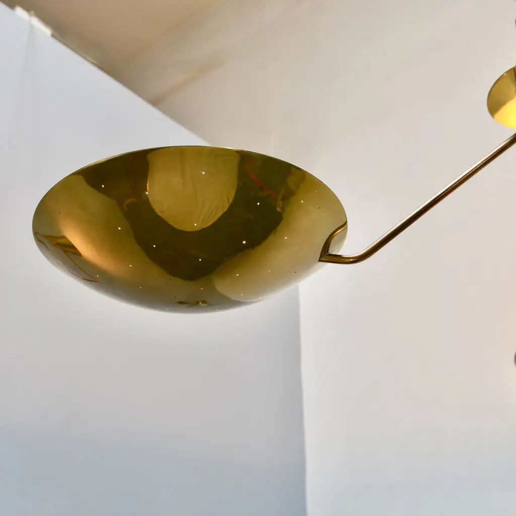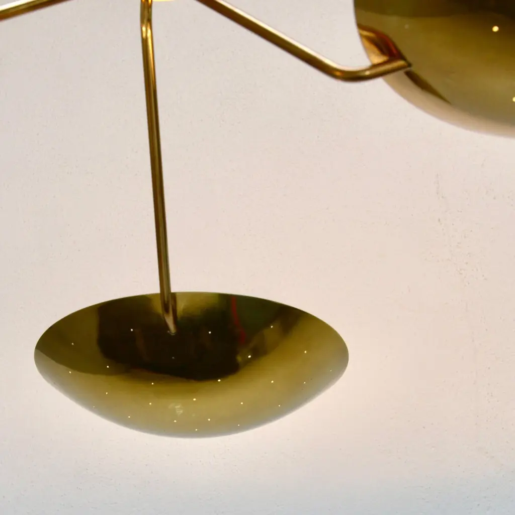 LU 3 Ceiling Fixture is an all perforated brass ceiling fixture inspired by classical mid century Italian design. This stunning fixture has 3 beautifully fabricated perforated brass dish lights joined at a center rod. Made in solid lightly aged patina brass. Wired with 3-E26 medium based sockets, 1 per dish. It can also be wired for use anywhere in the world. Light bulbs and mounting hardware included with order. order. Made to order.Measurements:Height: 11” Diameter: 44”Dish Shades: 12”
