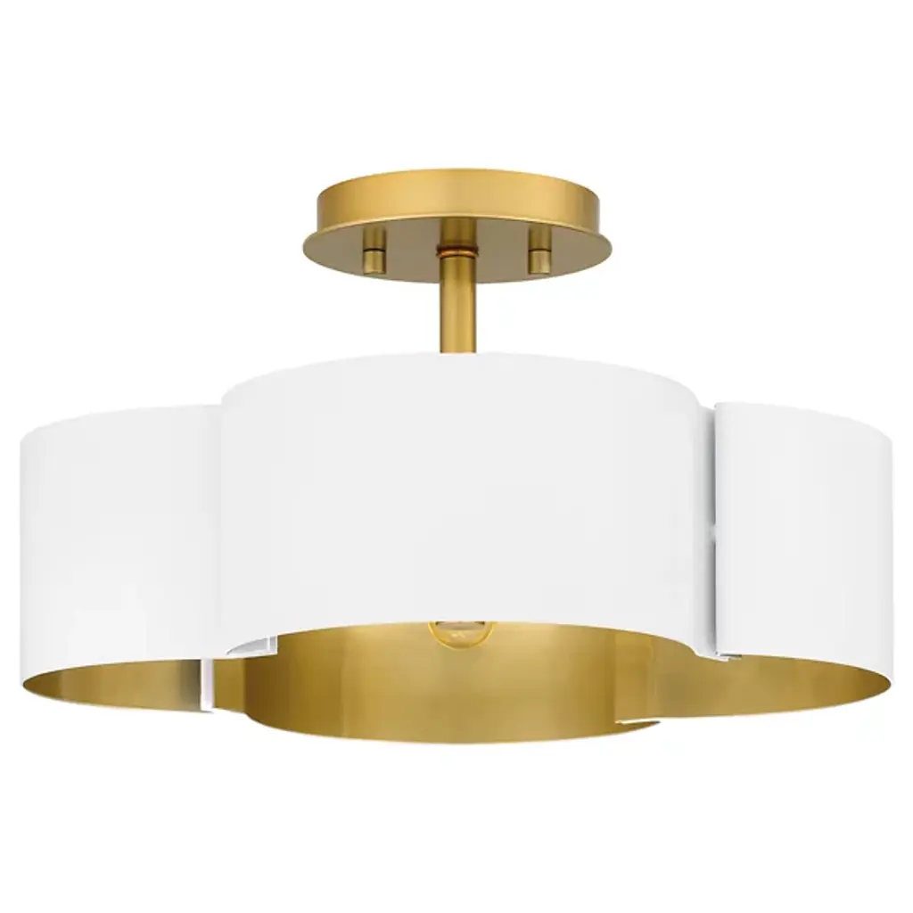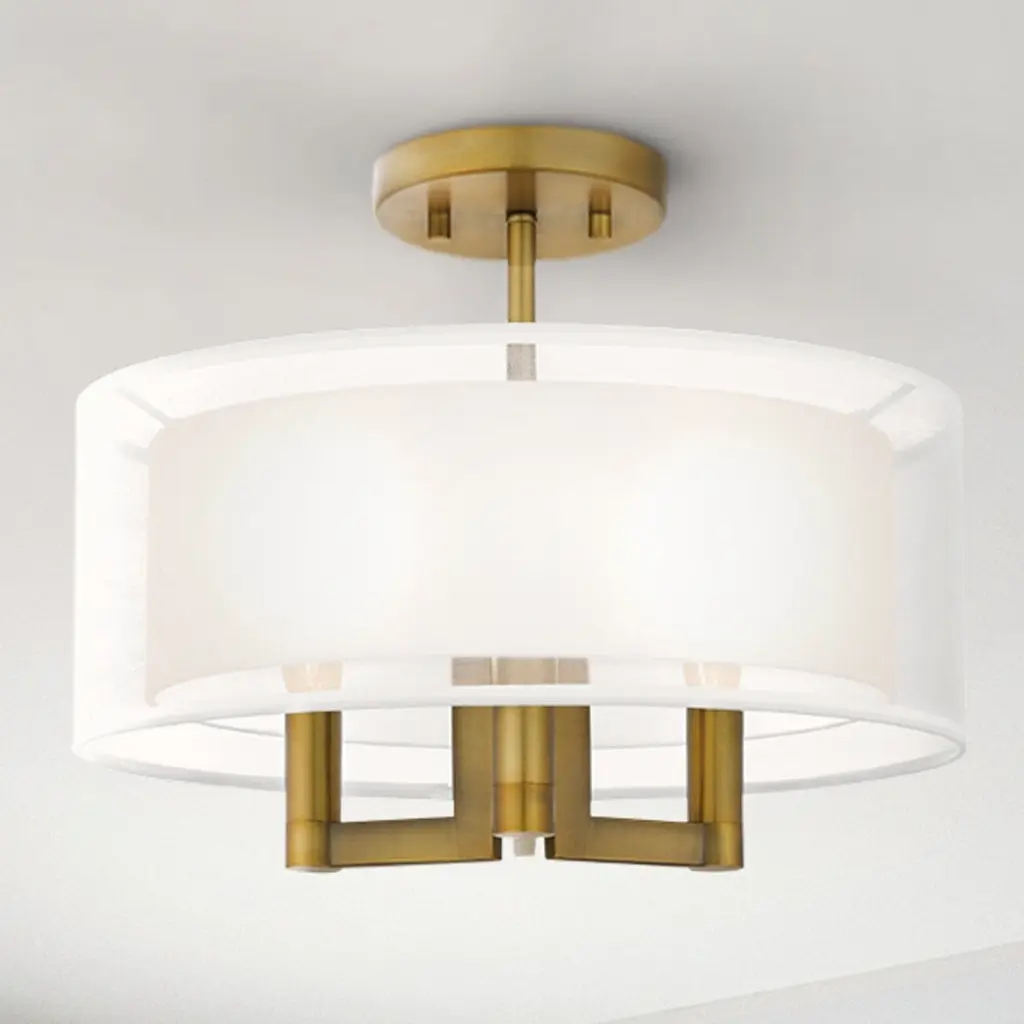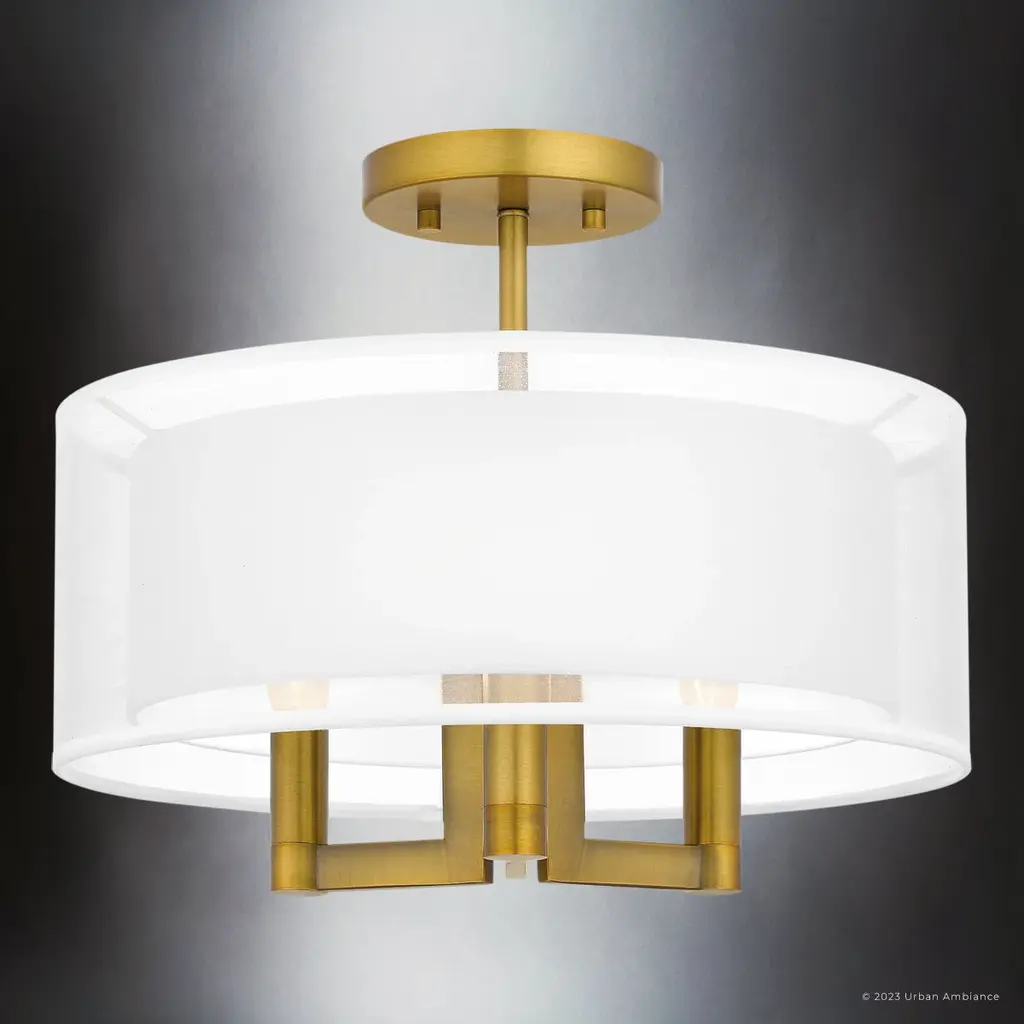 THE MOERS COLLECTION:The Moers collection of semi-flush mount ceiling lights is a diverse and stylish range that caters to a variety of tastes and settings. The collection is characterized by its versatility, with fixtures available as semi-flush mount lights. These fixtures are designed to add subtle style to any space, with a choice of finishes including matte black, aged brass, and brushed nickel. The collection boasts traditional silhouettes with industrial-style details, and the versatile, low-profile styling works well in a variety of settings, including entryways, bathrooms, home offices, and more. The Moers collection features a variety of shade designs, from delicate petal-like shades encompassing a white glass orb to black and white metal shades. These shades add sophistication and modern style, pairing beautifully with the exposed bulb sockets and sleek metal lines. Some fixtures in the collection feature a geometric silhouette with concentric black metal bands, painted gold on the inside for a pop of shine, while others feature a fun, color block design that pairs well in any modern or contemporary setting. The Moers collection also offers a range of illumination effects, from a soft glow to a dazzling sparkle created by clear crystal glass. These fixtures create a warm and inviting atmosphere, adding instant luxury to any setting. Whether hung individually or in a grouping, the fixtures in the Moers collection make a bold statement in any setting, be it glam, modern, or contemporary. With the Moers collection, you can choose the fixture that best complements your home's decor, making a bold statement over any kitchen island, bar area, or other space in your home. PRODUCT INFORMATION:MODEL NUMBER: BWQ5037, UQL5037PRODUCT COLLECTION: MoersINSTALL LOCATION: IndoorFIXTURE TYPE: Ceiling LightFINISH: Aged BrassCONSTRUCTION MATERIAL: SteelABOUT THE DESIGN:DESIGN FEATURES: FabricSHADE CHARACTERISTICS: White Organza FabricFIXTURE FORM/SHAPES: Circular, CylinderFINISH TONES: Whites, GoldsELECTRICAL AND INSTALLATION:FIXTURE BODY: 12.00''H x 15.00''W x 15.00''DHANGING HEIGHT: N/ACEILING OR WALL PLATE DIMS: 5.00"W X 5.00"LFIXTURE WEIGHT (IN LBS): 3.70 lbsLOCATION RATING: Dry LocationsSLOPED CEILING COMPATIBLE: N/AREVERSIBLE (UP/DOWN) OPTION: NoVOLTAGE: 110/120 VNUMBER OF BULBS: Three (3), E12 Candelabra Base, 60W (Not Included)RECOMMENDED BULB SHAPE: B10COMPATIBILITY: LED and Dimmable BulbsSTYLE INFLUENCES:TRADITIONAL: Time-honored decor with rich fabrics, classic lines, and detailed craftsmanship.NEW TRADITIONAL: Updates classic design with modern elements, blending traditional forms with contemporary finishes and fabrics.CRAFTSMAN: Emphasizes handcrafted woodwork, quality materials, and sturdy construction, often with a warm, earthy palette.GLAM: Luxurious and dramatic, with bold colors, metallics, and plush fabrics, emphasizing opulence and comfort.