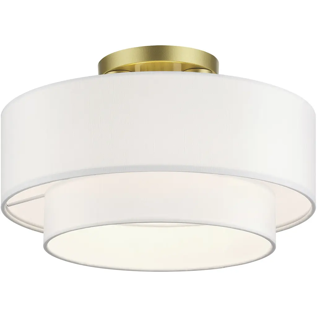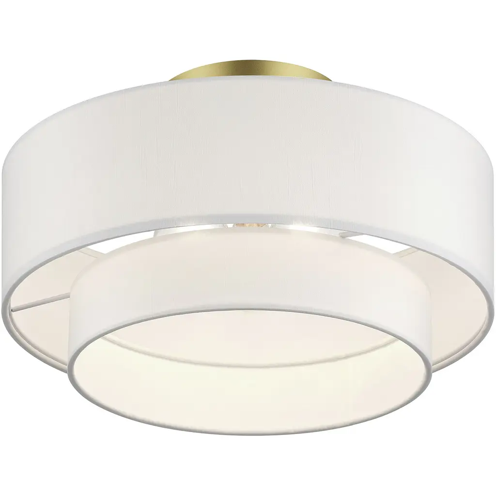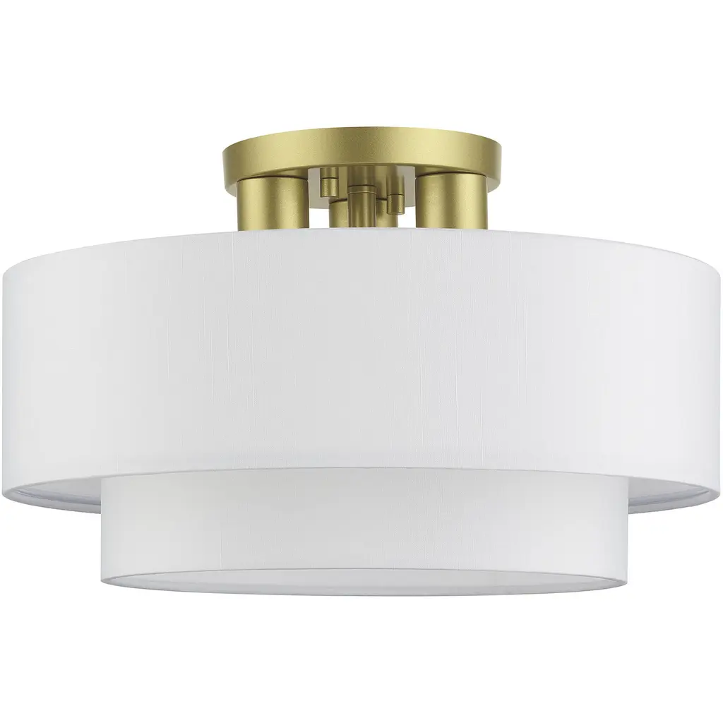 The Manorwood collection has a clean, crisp look and modern appeal. The hand-crafted off white colored fabric hardback double drum shades offer a diffused warm light complementing the soft gold finish on this sleek three light semi-flush. Will adapt well
