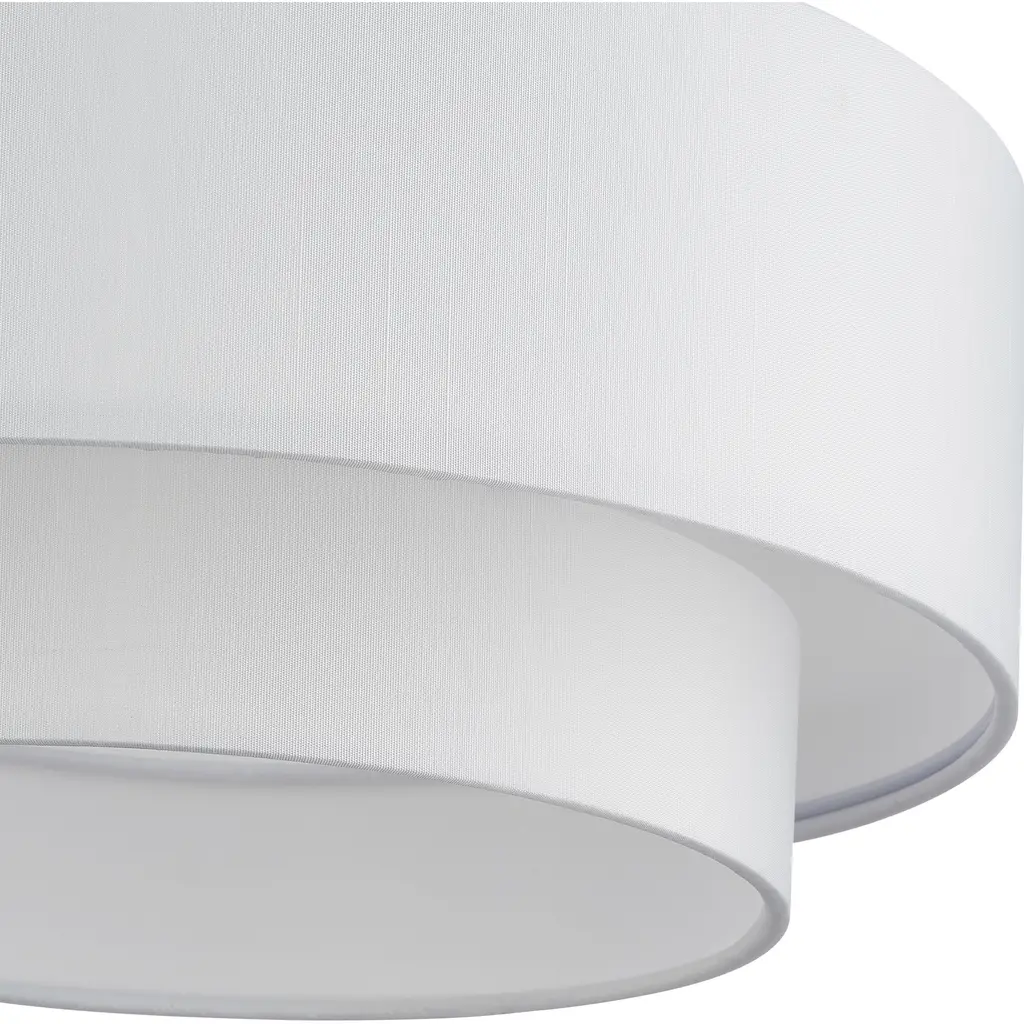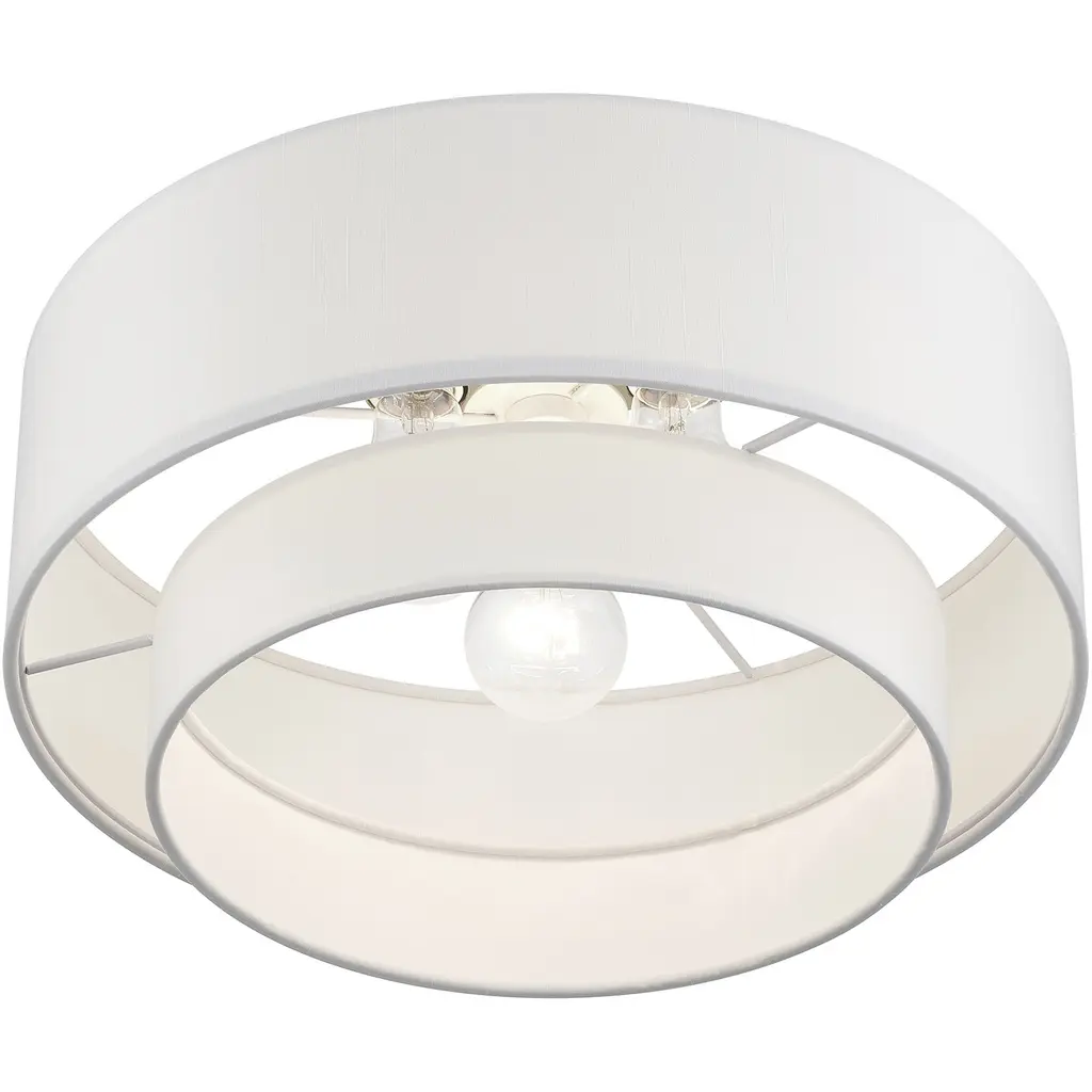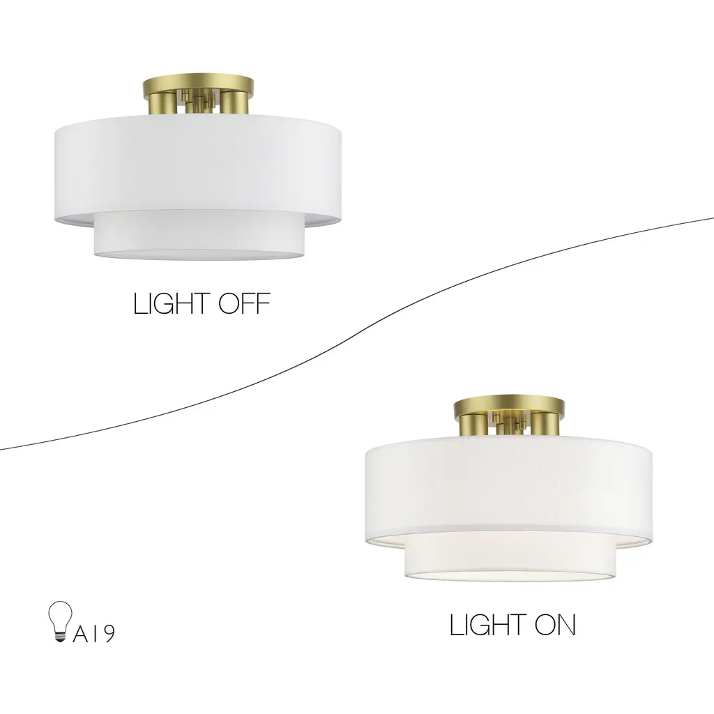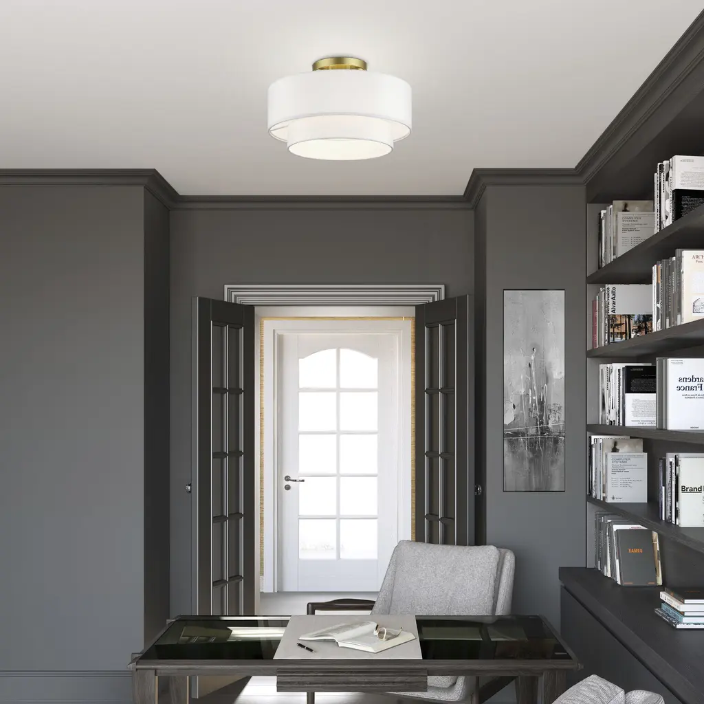 The Manorwood collection has a clean, crisp look and modern appeal. The hand-crafted off white colored fabric hardback double drum shades offer a diffused warm light complementing the soft gold finish on this sleek three light semi-flush. Will adapt well
