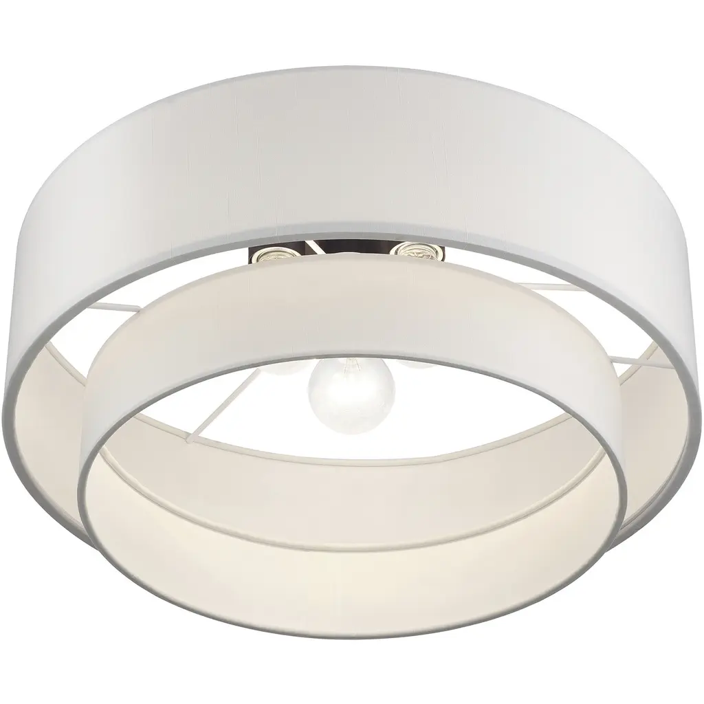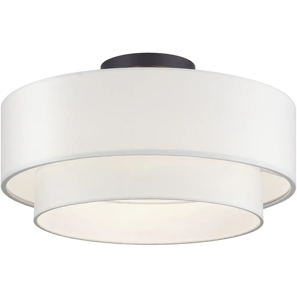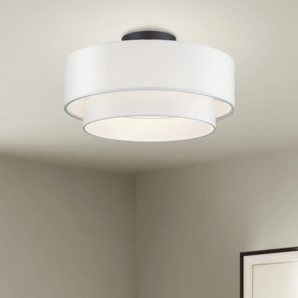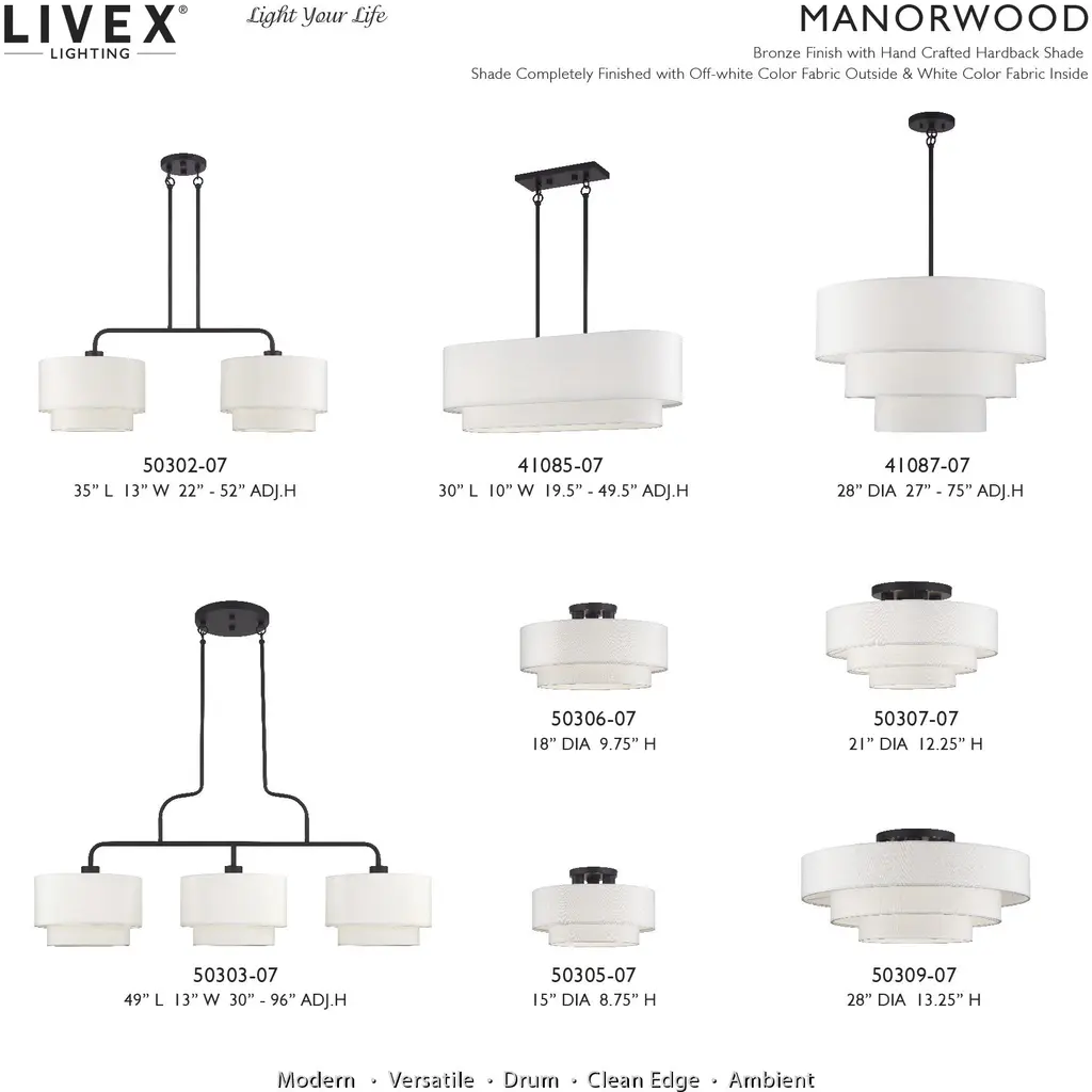The Manorwood collection has a clean, crisp look and modern appeal. The hand-crafted off white colored fabric hardback double drum shades offer a diffused warm light complementing the bronze finish on this sleek three light large semi-flush. Will adapt we
