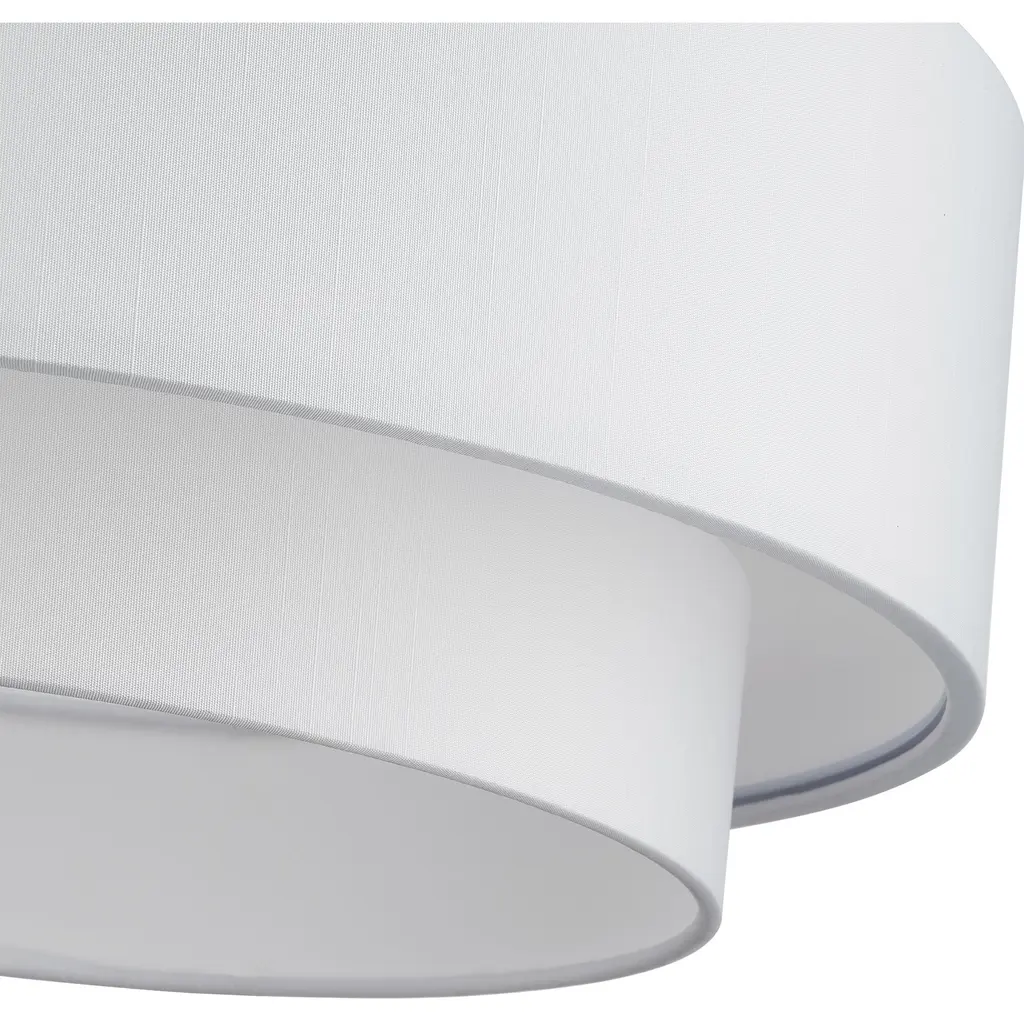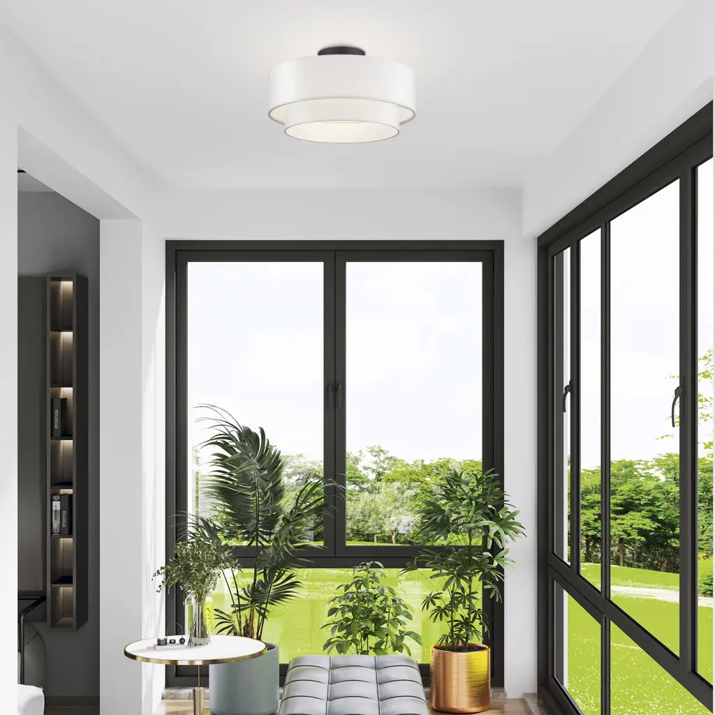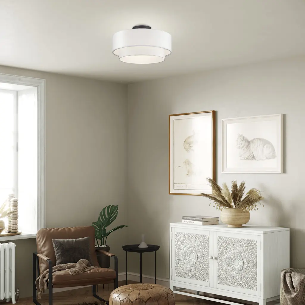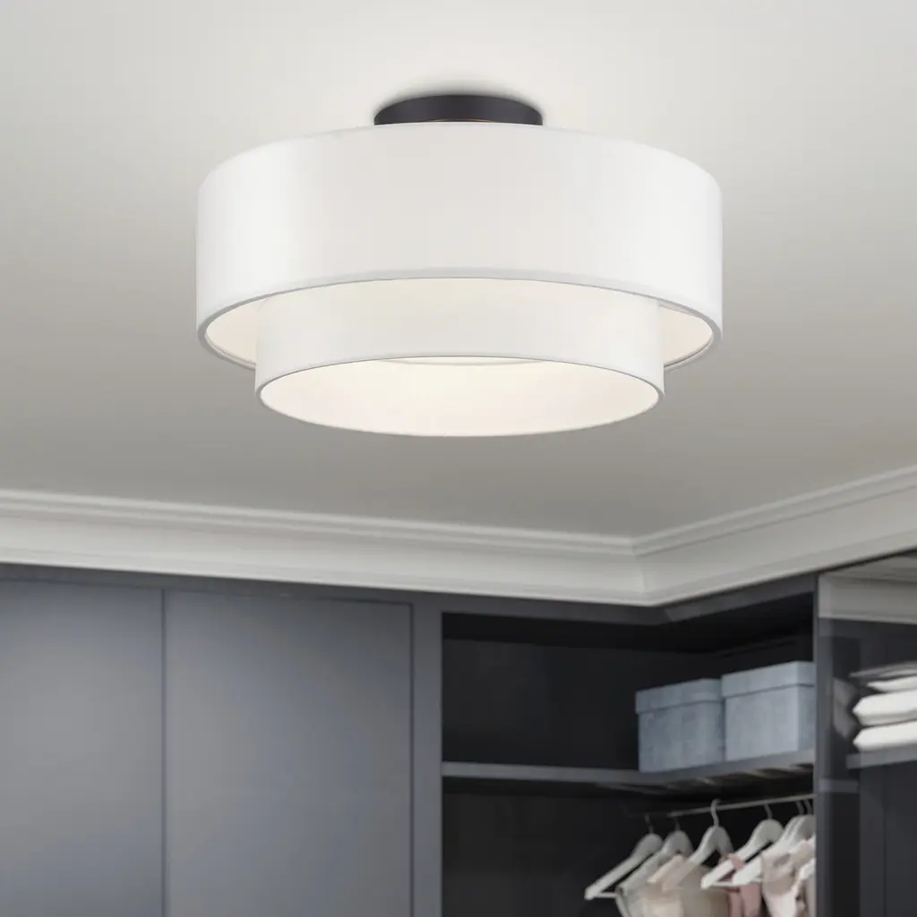The Manorwood collection has a clean, crisp look and modern appeal. The hand-crafted off white colored fabric hardback double drum shades offer a diffused warm light complementing the bronze finish on this sleek three light large semi-flush. Will adapt we
