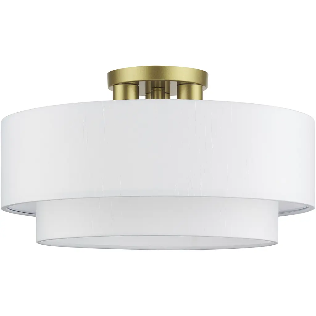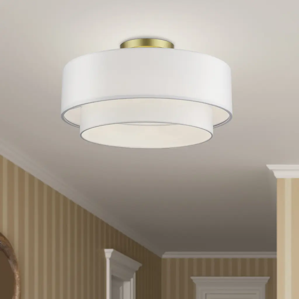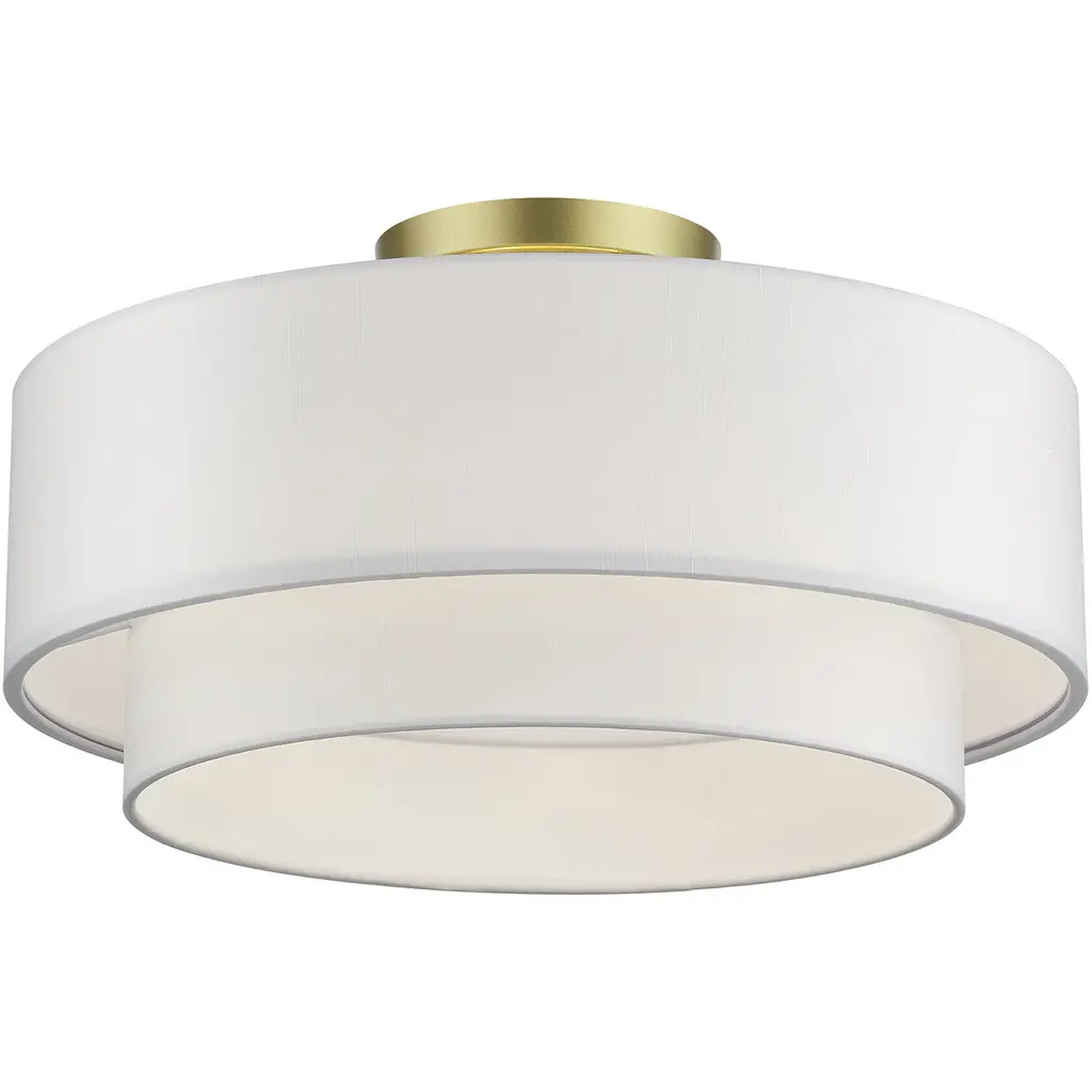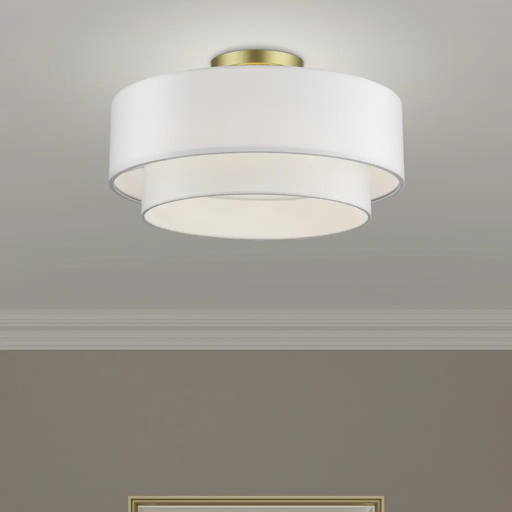The Manorwood collection has a clean, crisp look and modern appeal. The hand-crafted off white colored fabric hardback double drum shades offer a diffused warm light complementing the soft gold finish on this sleek three light large semi-flush. Will adapt