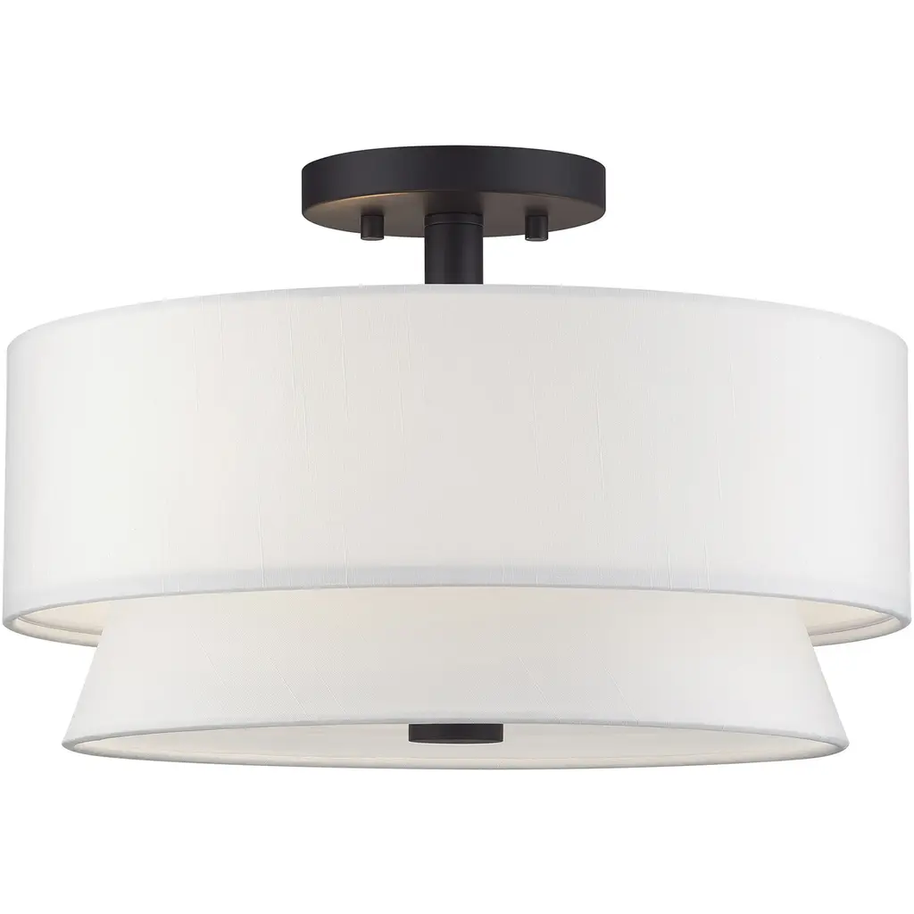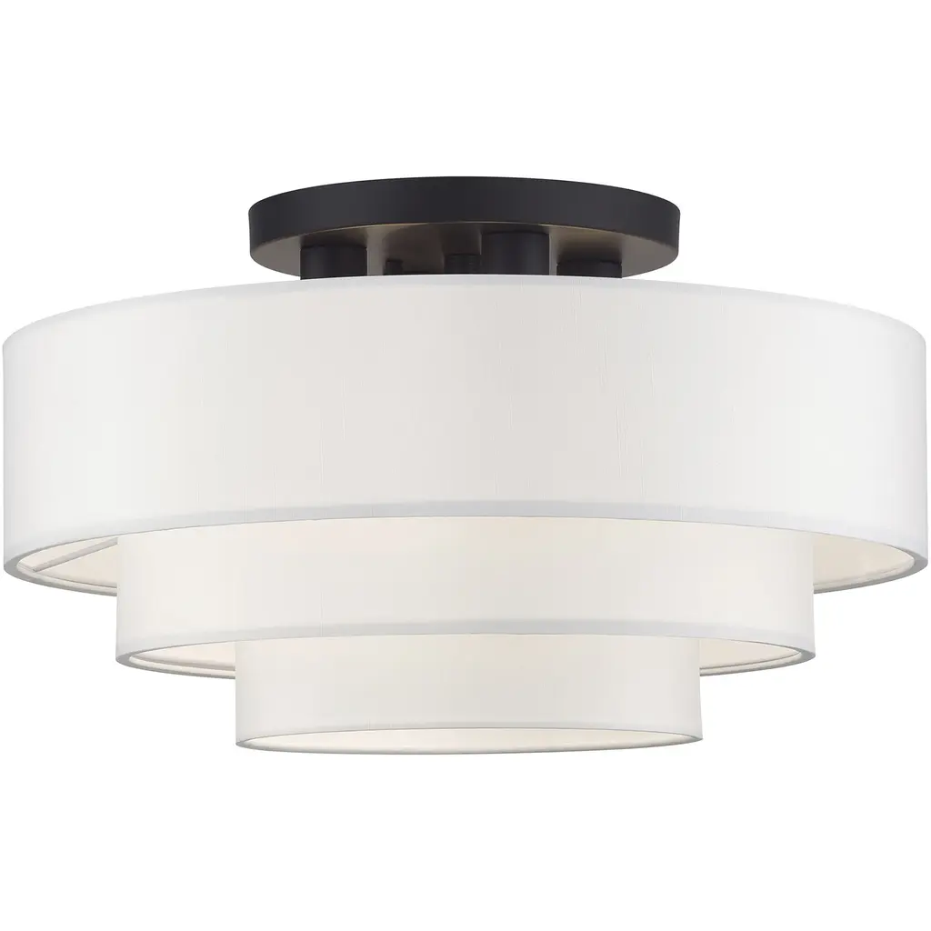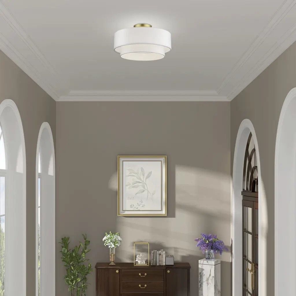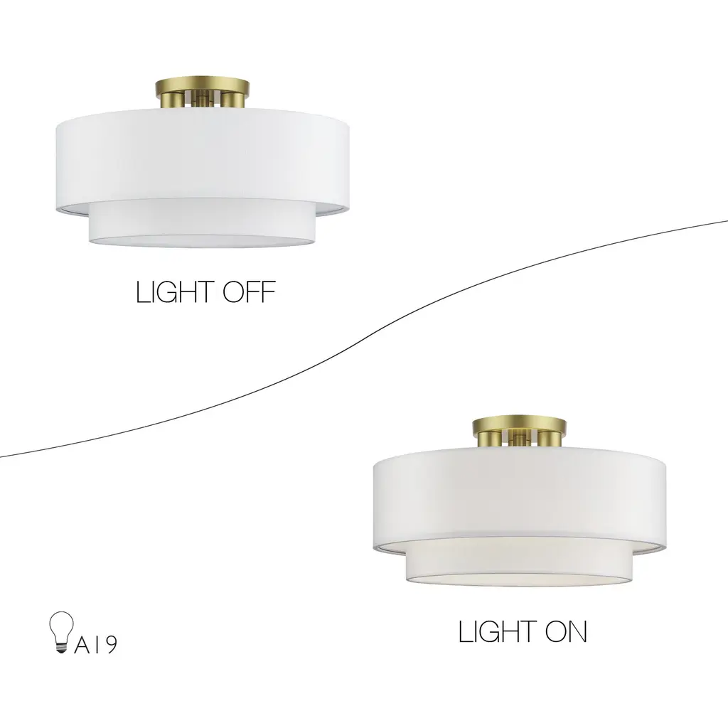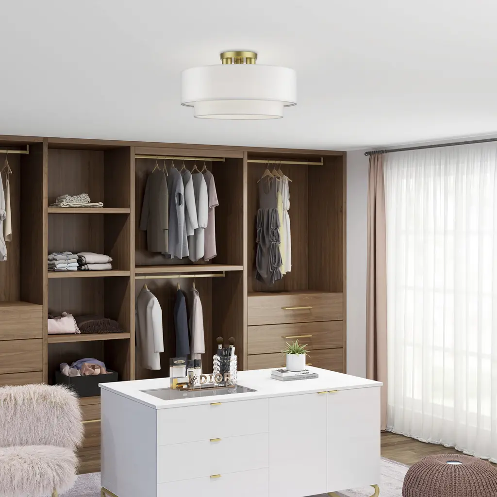 The Manorwood collection has a clean, crisp look and modern appeal. The hand-crafted off white colored fabric hardback double drum shades offer a diffused warm light complementing the soft gold finish on this sleek three light large semi-flush. Will adapt