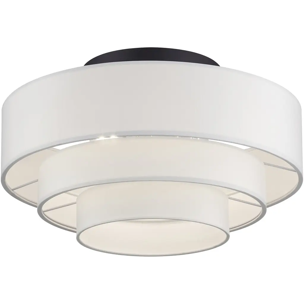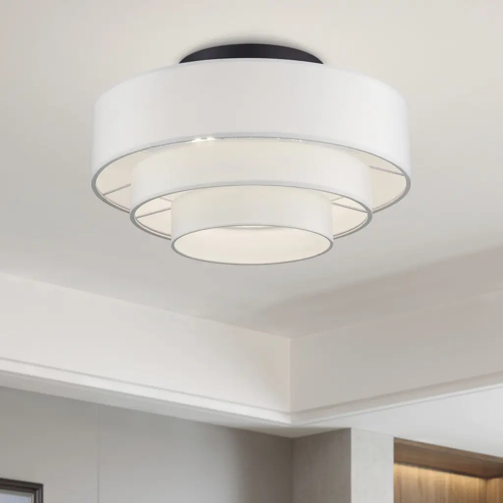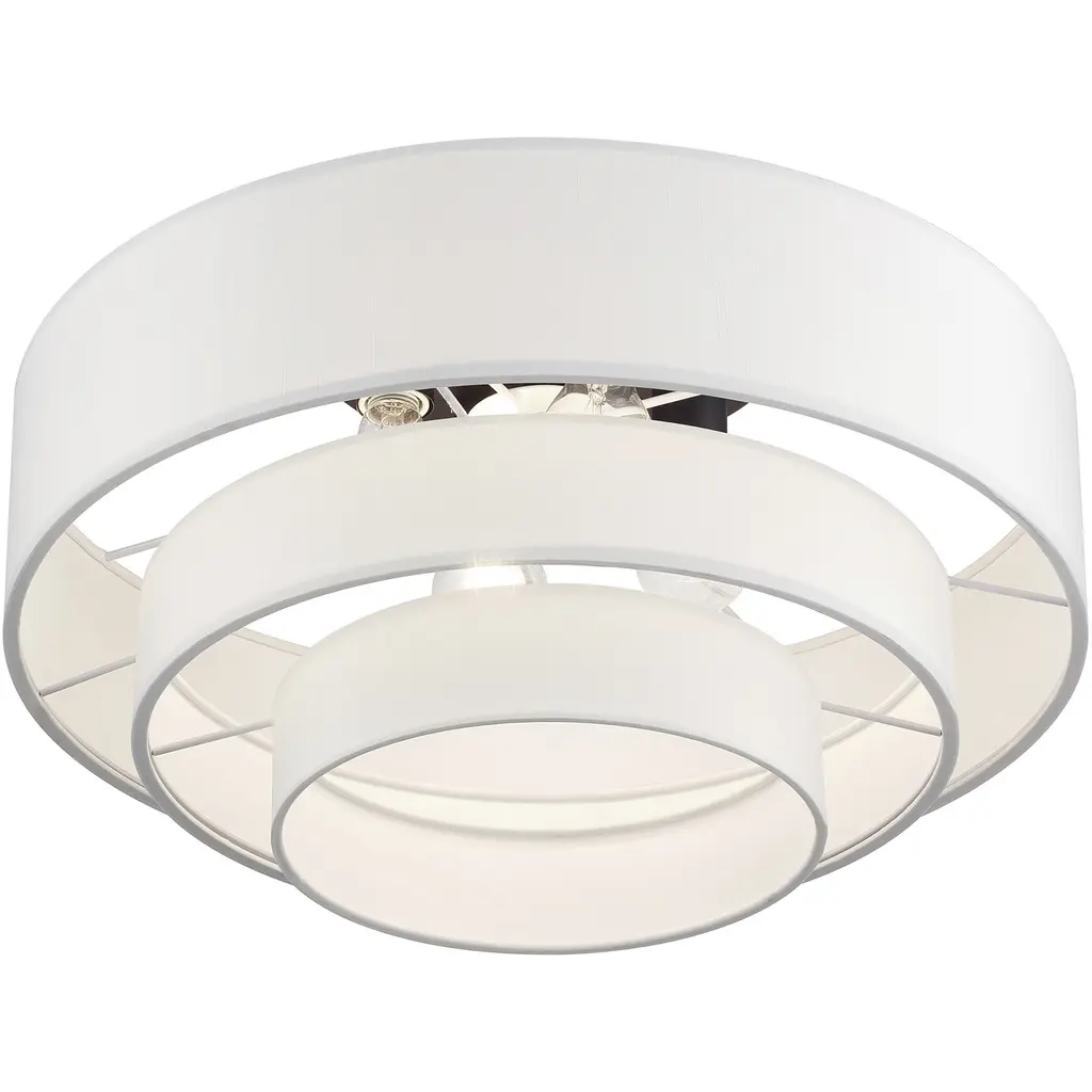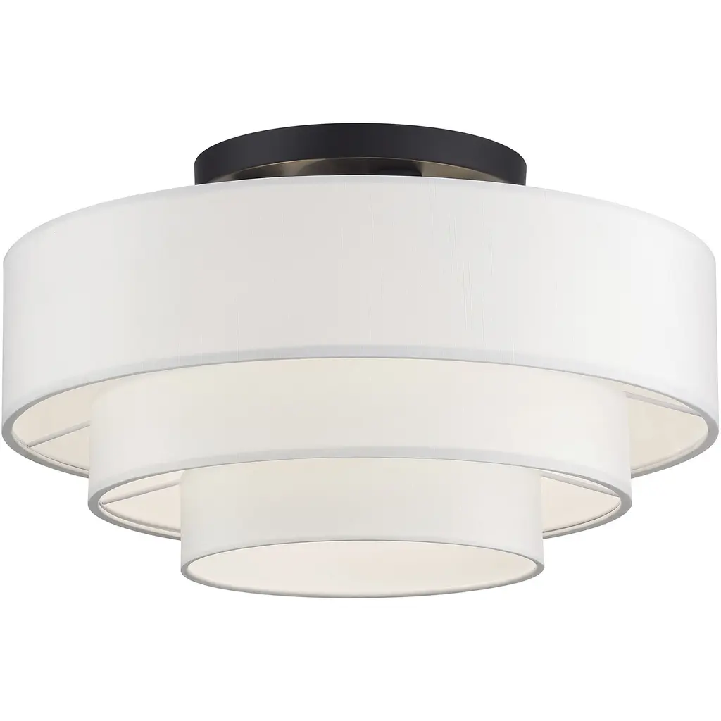The Manorwood collection has a clean, crisp look and modern appeal. The hand-crafted off white colored fabric hardback triple drum shades offer a diffused warm light complementing the bronze finish on this sleek four light extra large semi-flush. Will ada