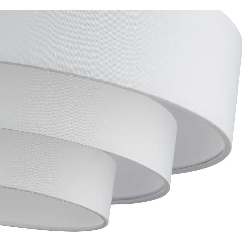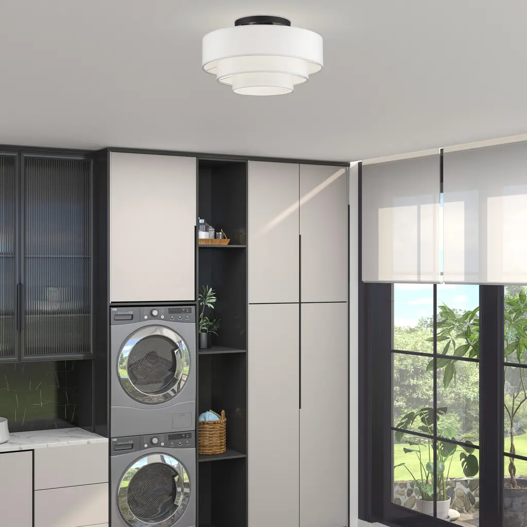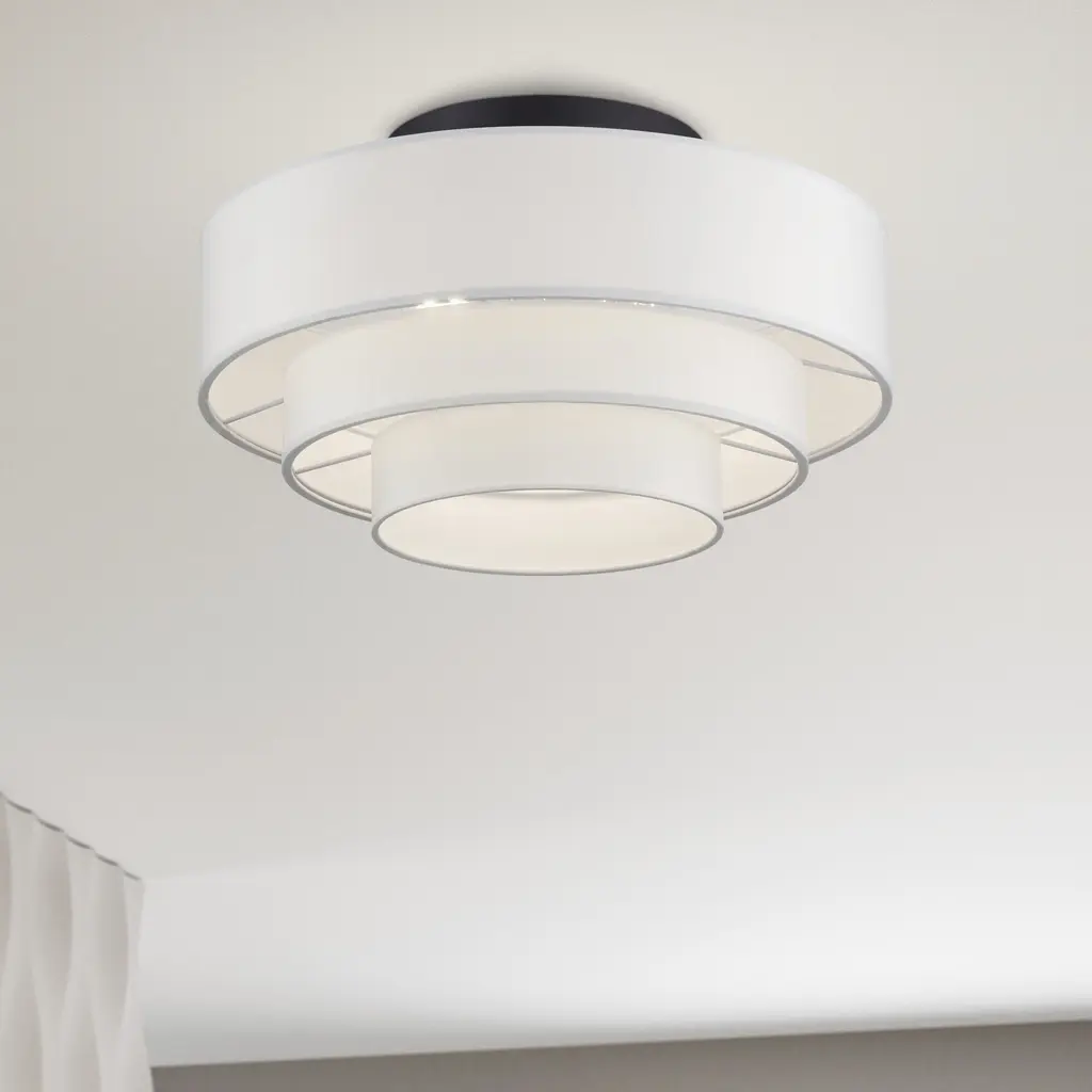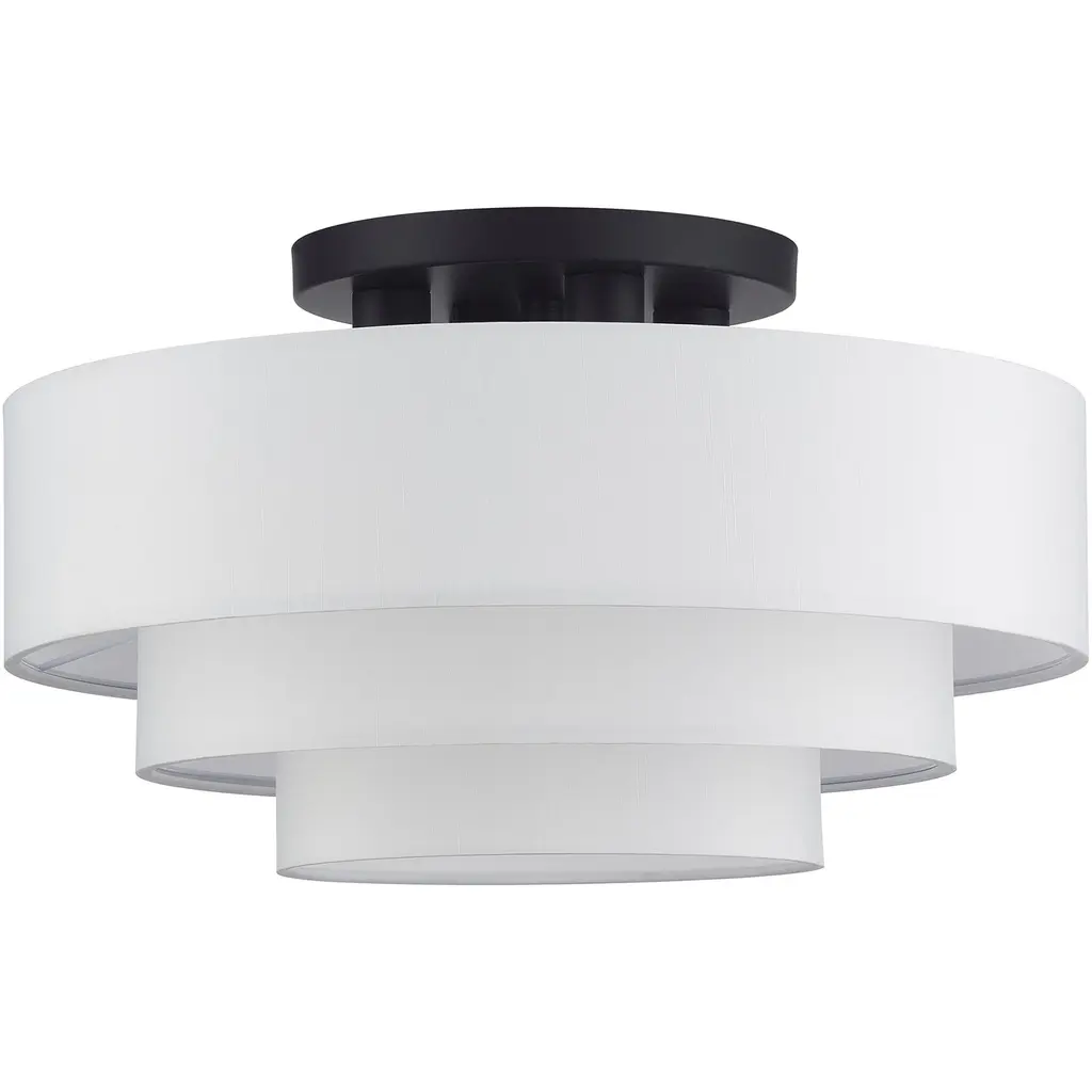 The Manorwood collection has a clean, crisp look and modern appeal. The hand-crafted off white colored fabric hardback triple drum shades offer a diffused warm light complementing the bronze finish on this sleek four light extra large semi-flush. Will ada