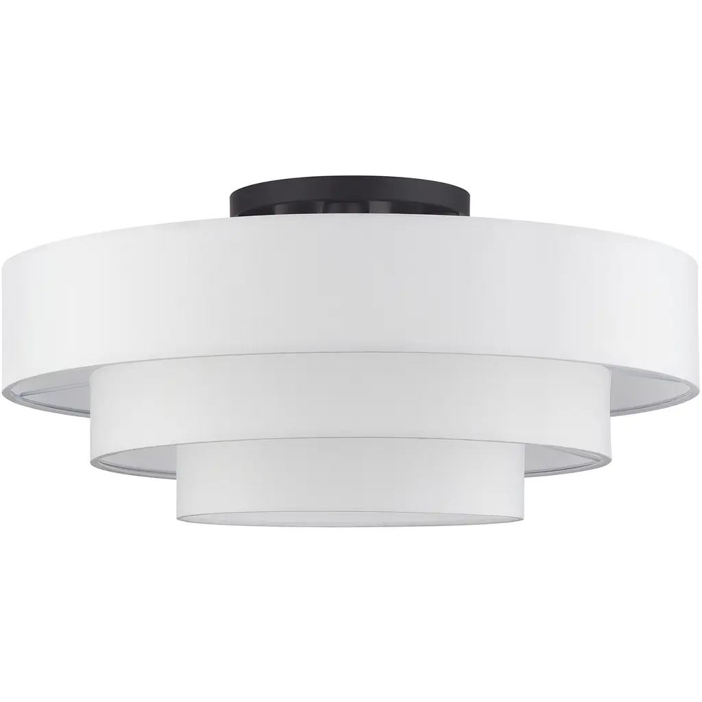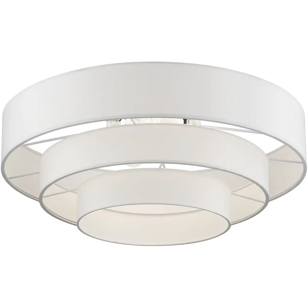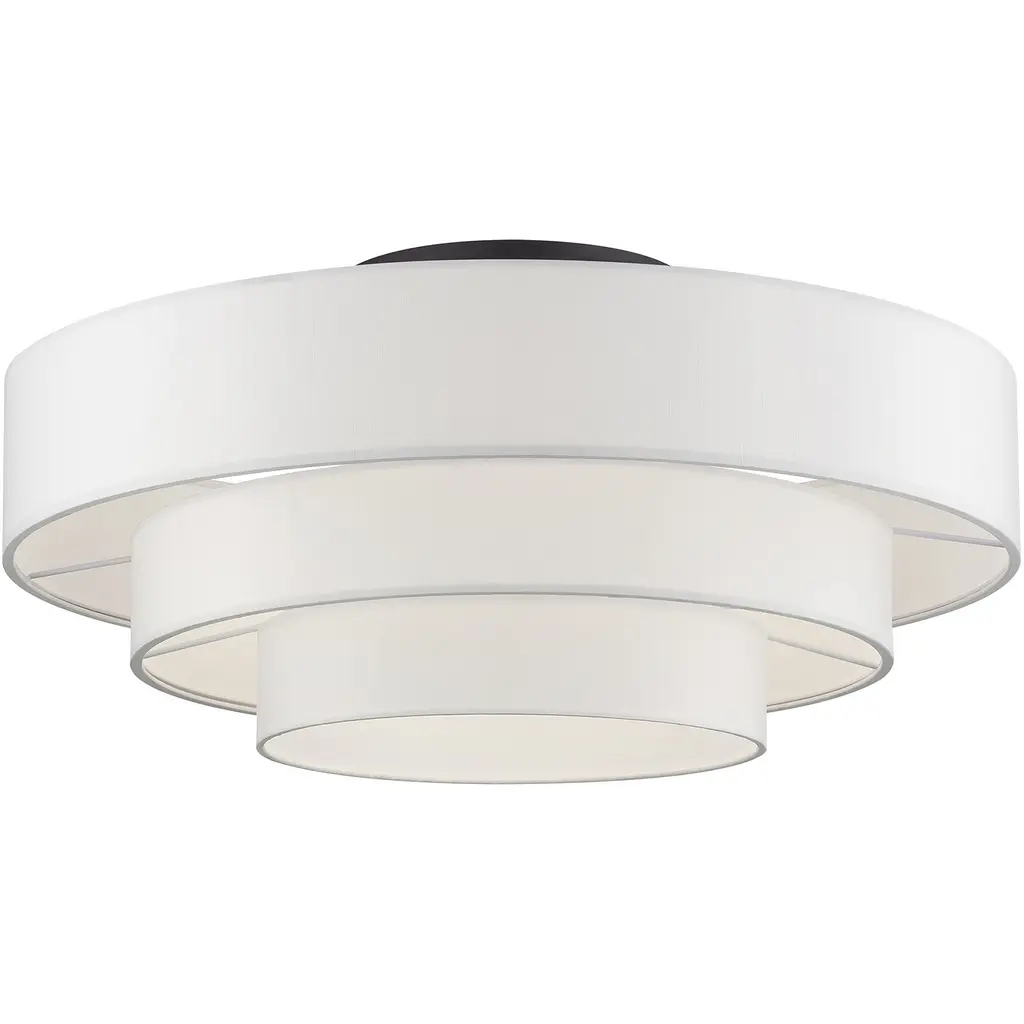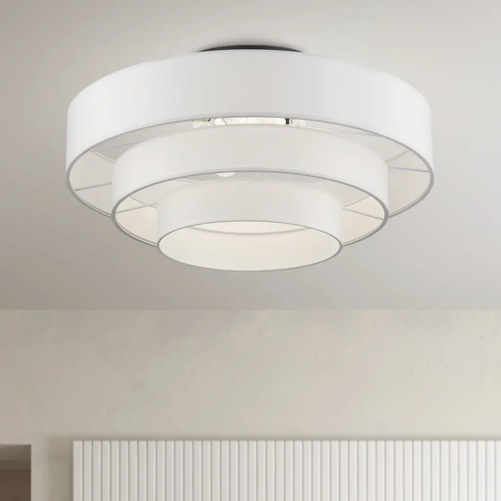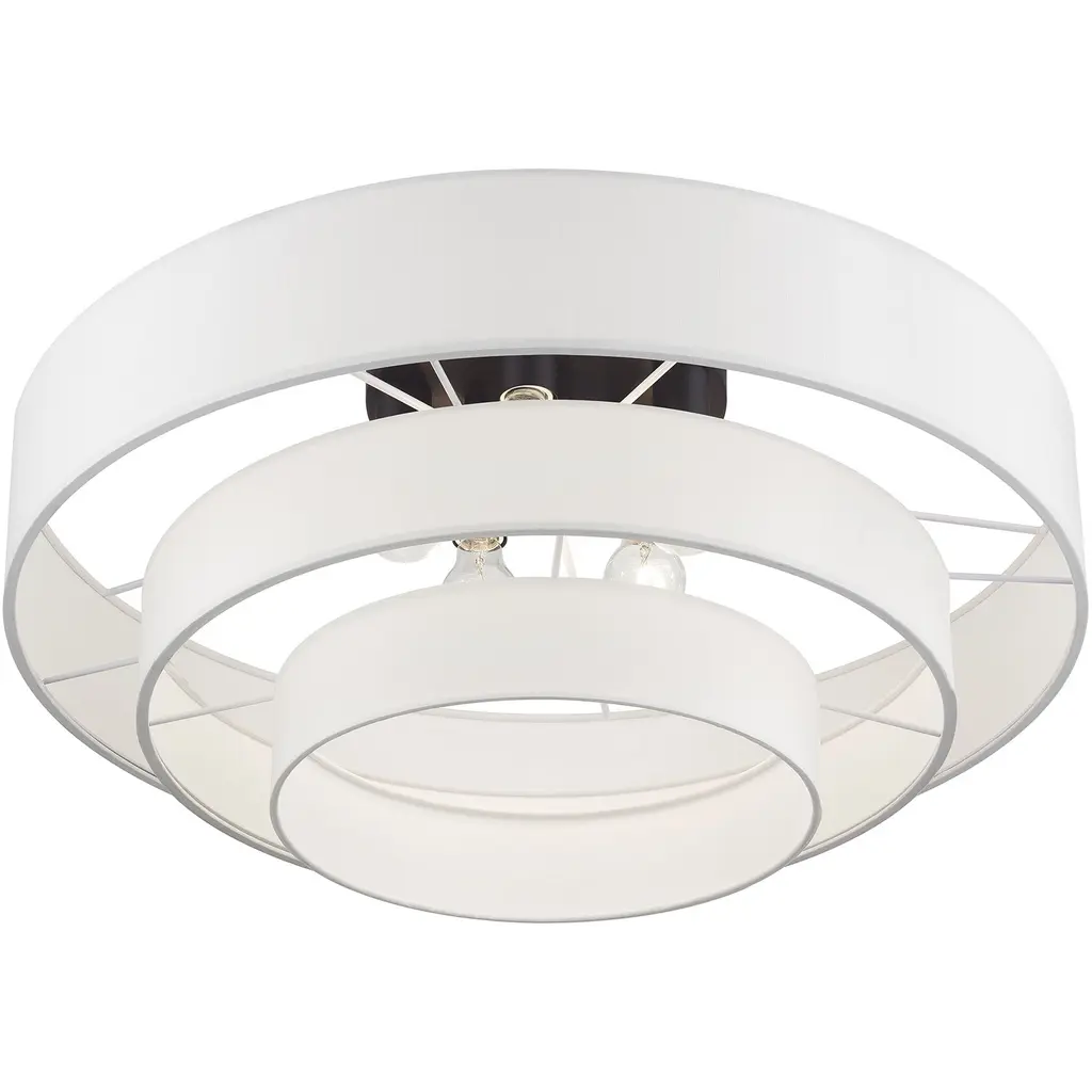 The Manorwood collection has a clean, crisp look and modern appeal. The hand-crafted off white colored fabric hardback triple drum shades offer a diffused warm light complementing the bronze finish on this sleek five light extra large semi-flush. Will ada