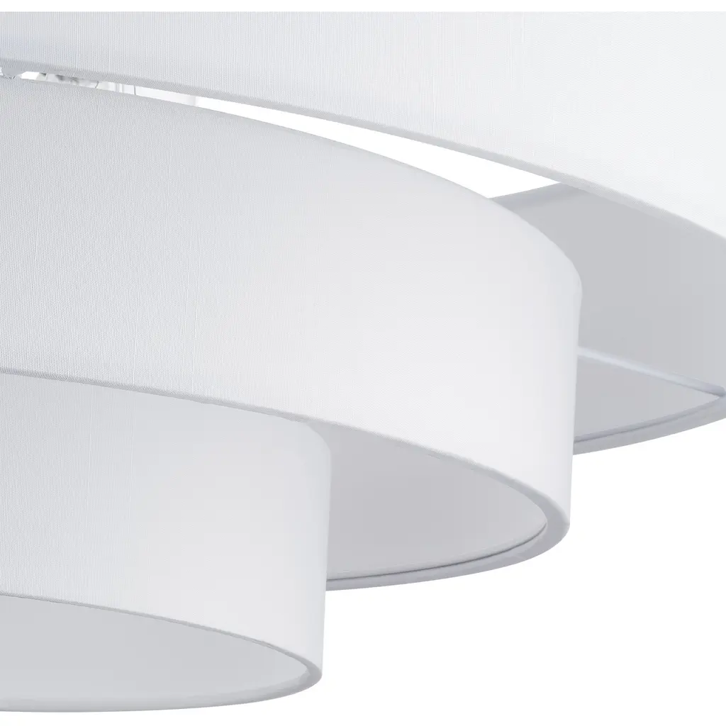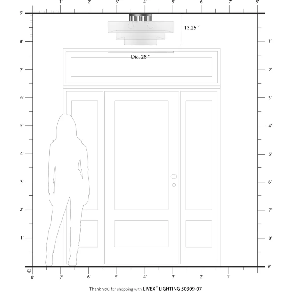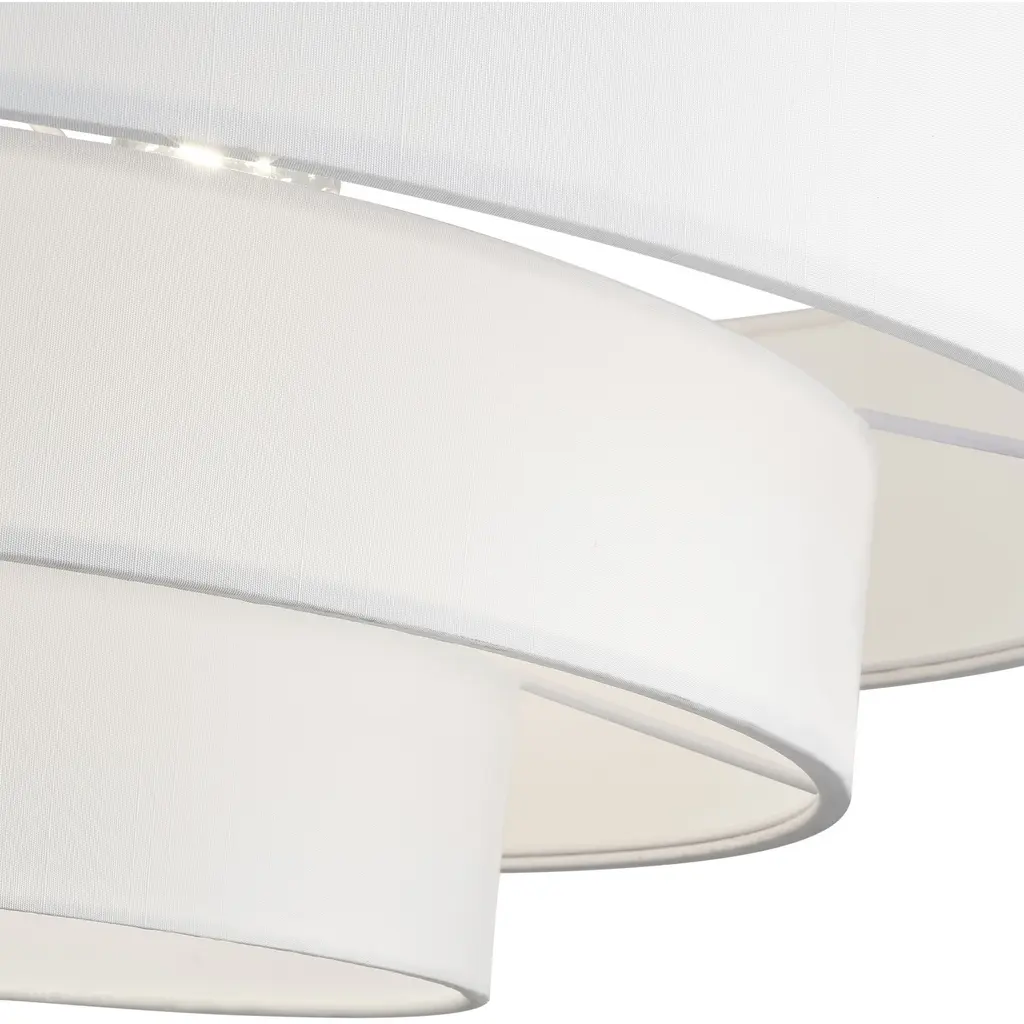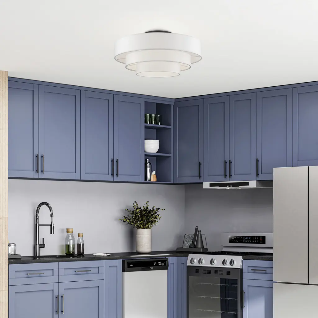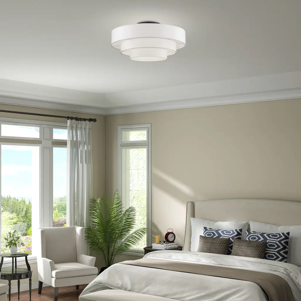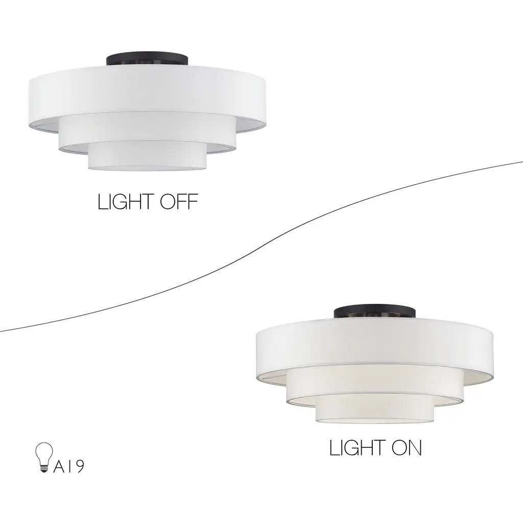 The Manorwood collection has a clean, crisp look and modern appeal. The hand-crafted off white colored fabric hardback triple drum shades offer a diffused warm light complementing the bronze finish on this sleek five light extra large semi-flush. Will ada