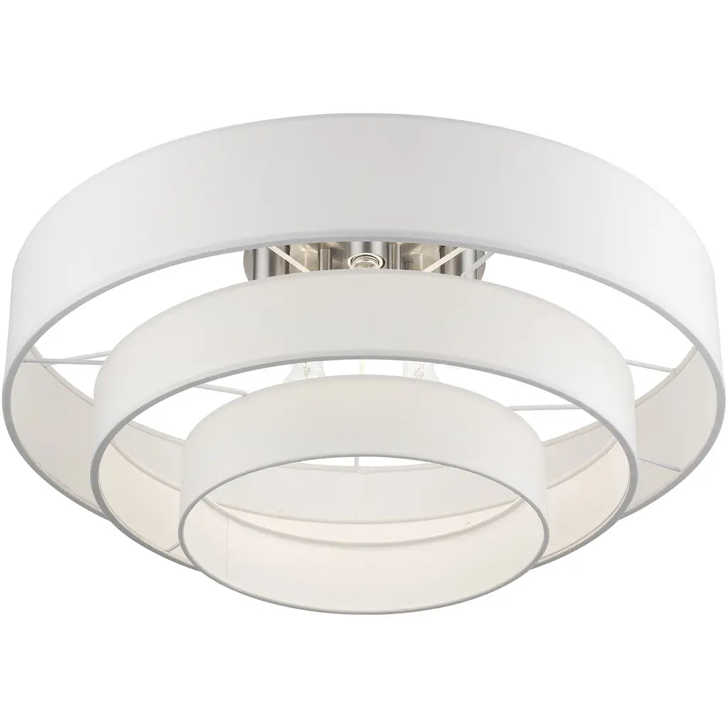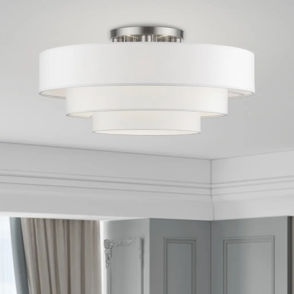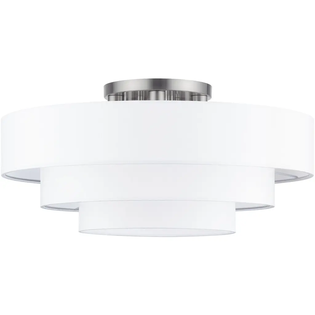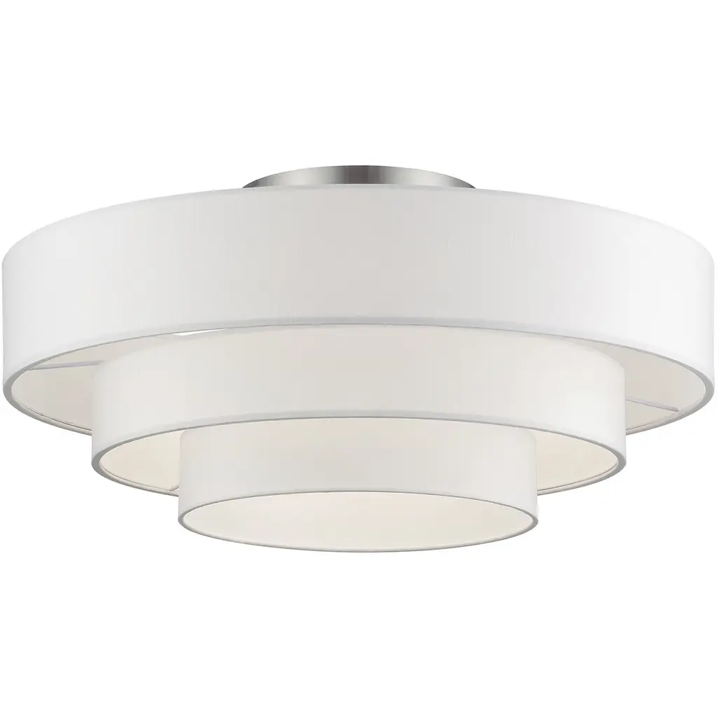 The Manorwood collection has a clean, crisp look and modern appeal. The hand-crafted off white colored fabric hardback triple drum shades offer a diffused warm light complementing the brushed nickel finish on this sleek five light extra large semi-flush.