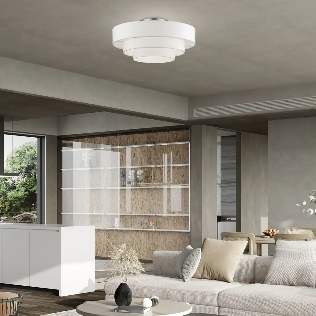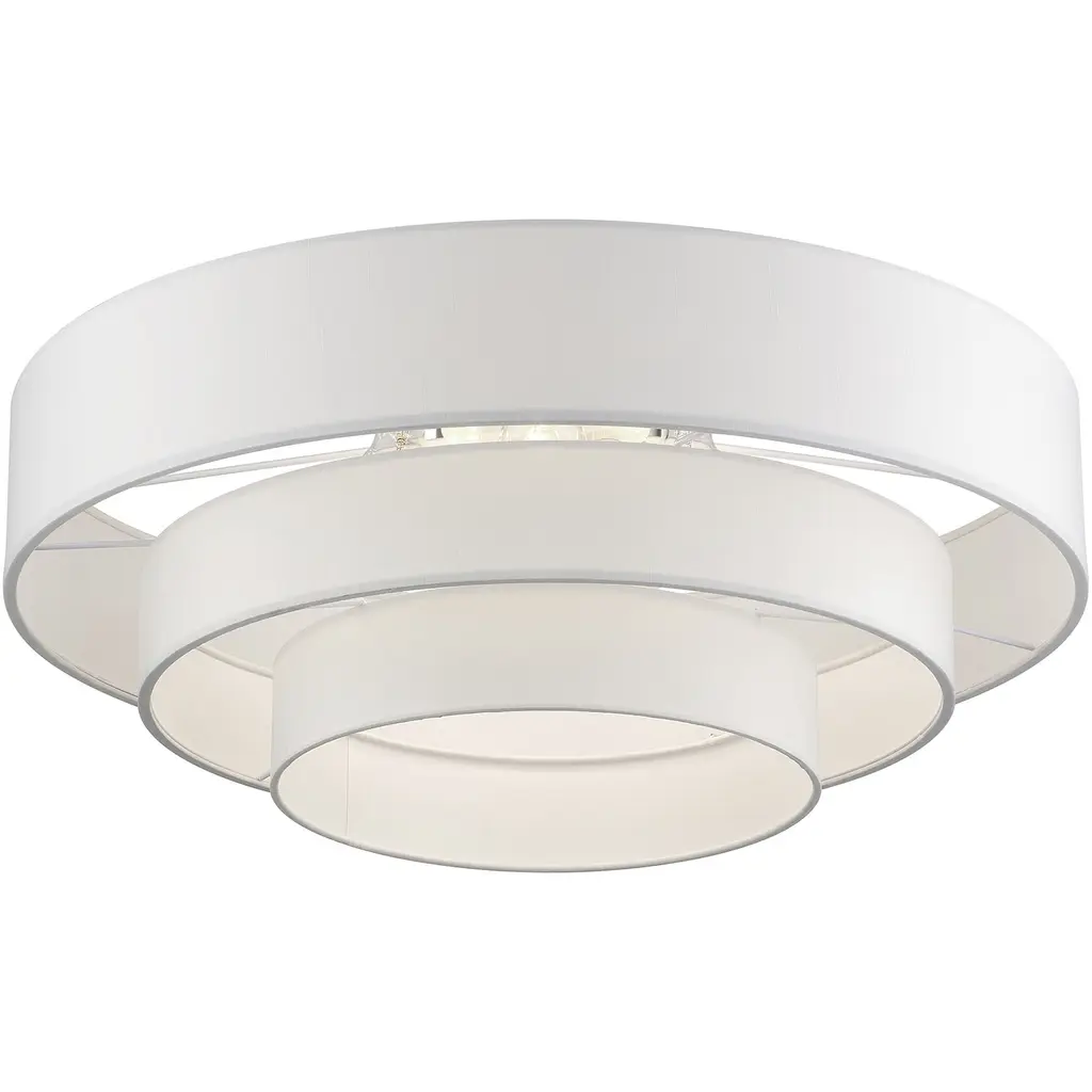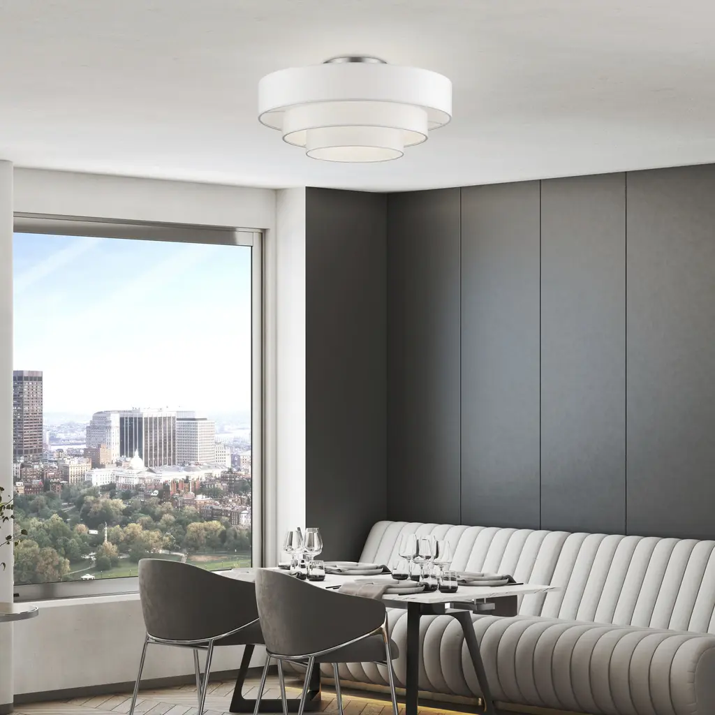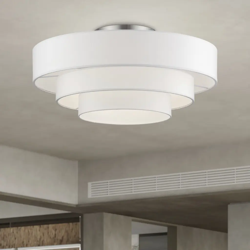 The Manorwood collection has a clean, crisp look and modern appeal. The hand-crafted off white colored fabric hardback triple drum shades offer a diffused warm light complementing the brushed nickel finish on this sleek five light extra large semi-flush.