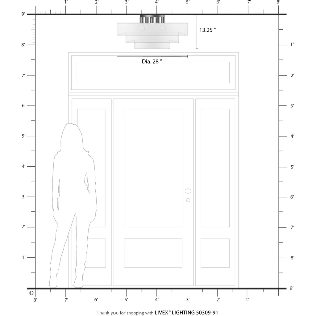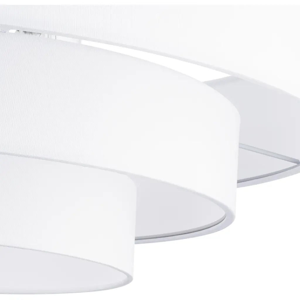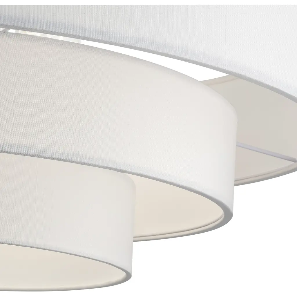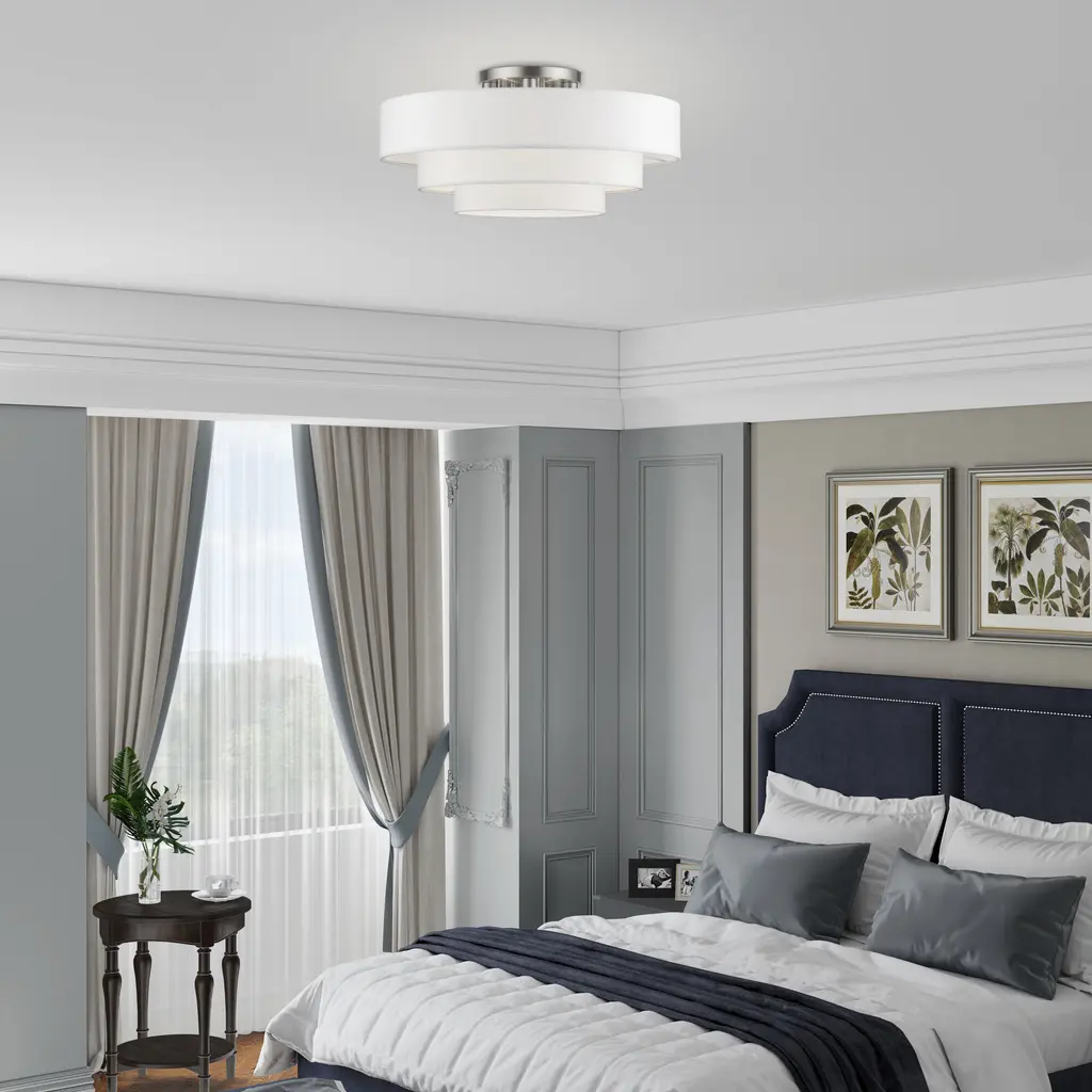 The Manorwood collection has a clean, crisp look and modern appeal. The hand-crafted off white colored fabric hardback triple drum shades offer a diffused warm light complementing the brushed nickel finish on this sleek five light extra large semi-flush.