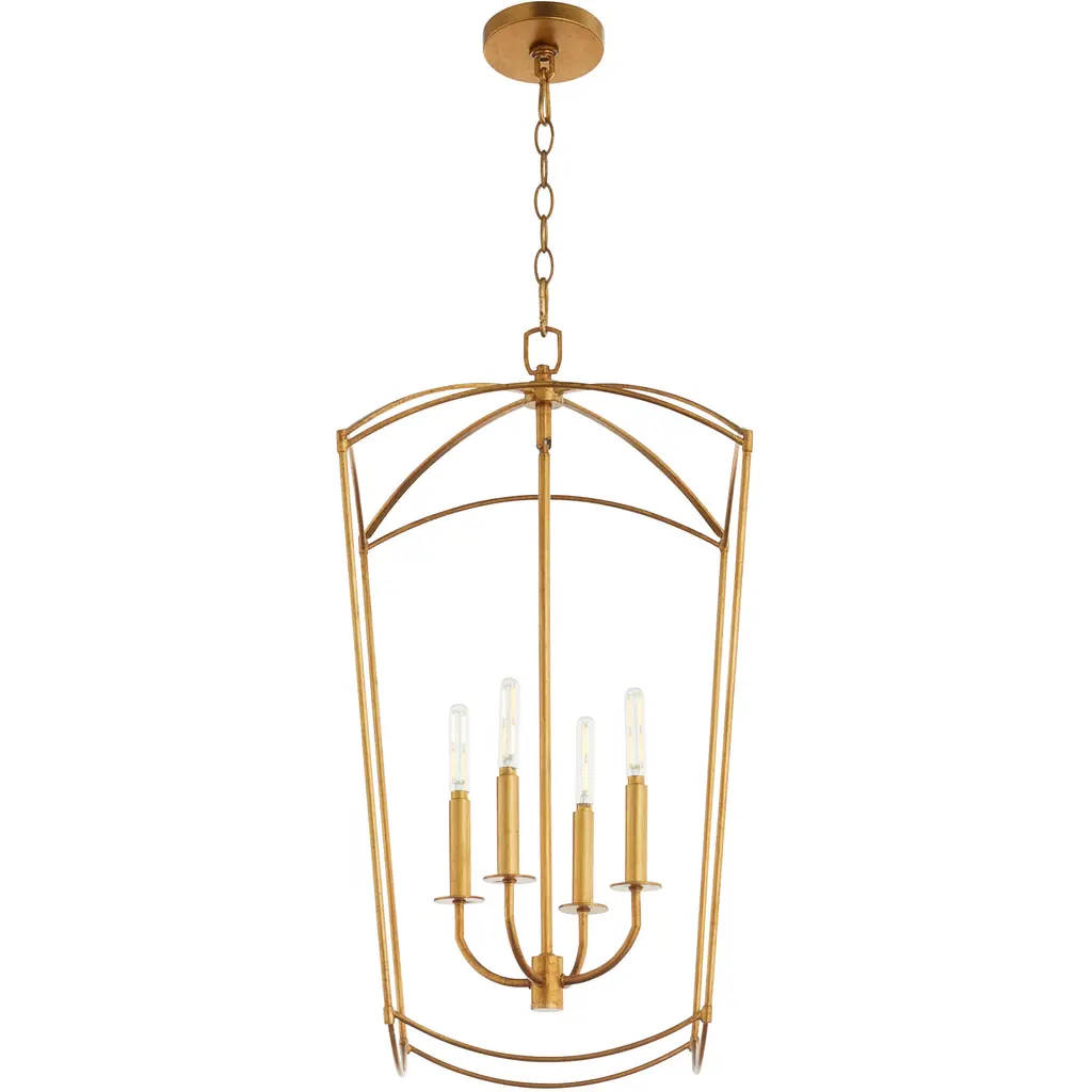 The Mantle 4 Light Entry adds a touch of modernity to any design. The cage housing the candelabra sockets of the Mantle series is a slightly bloated pentagonal prism, which gives it the classic shape of a house. Inside the cage, four lights fitted with simple bobeches sit on curved rods that connect to a straight downstem. The light emitted is soft and warm, creating a cozy and inviting atmosphere. Whether used as the main light source in your living room or dining room or as an accent piece in a bedroom, entryway or hallway, Mantle series is sure to make a statement in gold leaf or matte black. Its distinctive design and high-quality construction ensure that it will be a fixture in your home for years to come, providing both timeless style and functionality.
